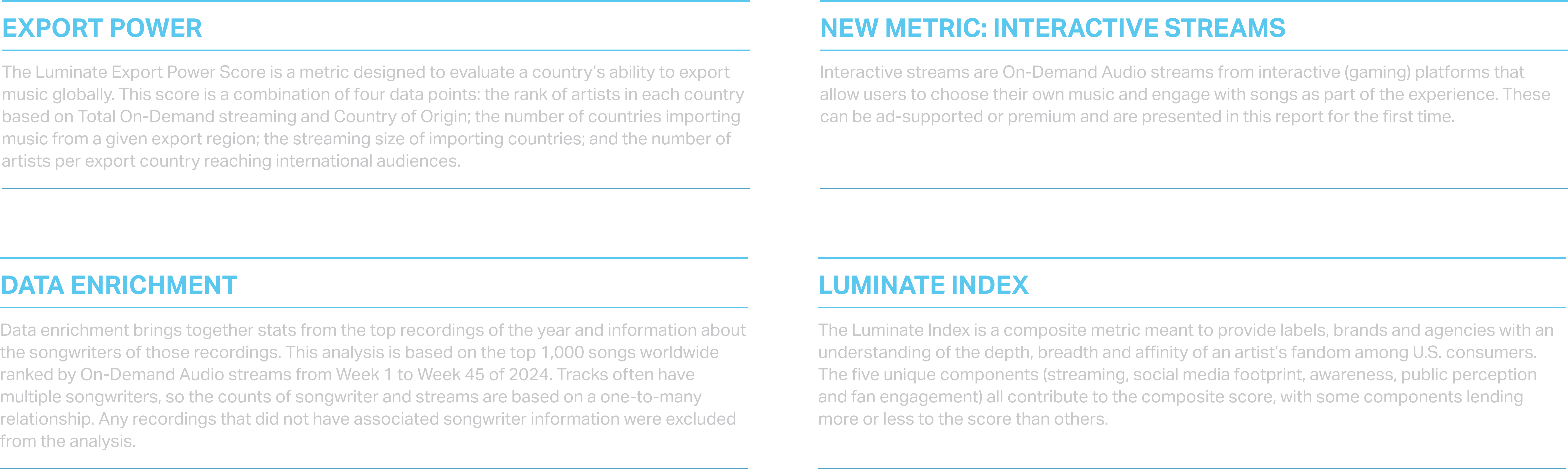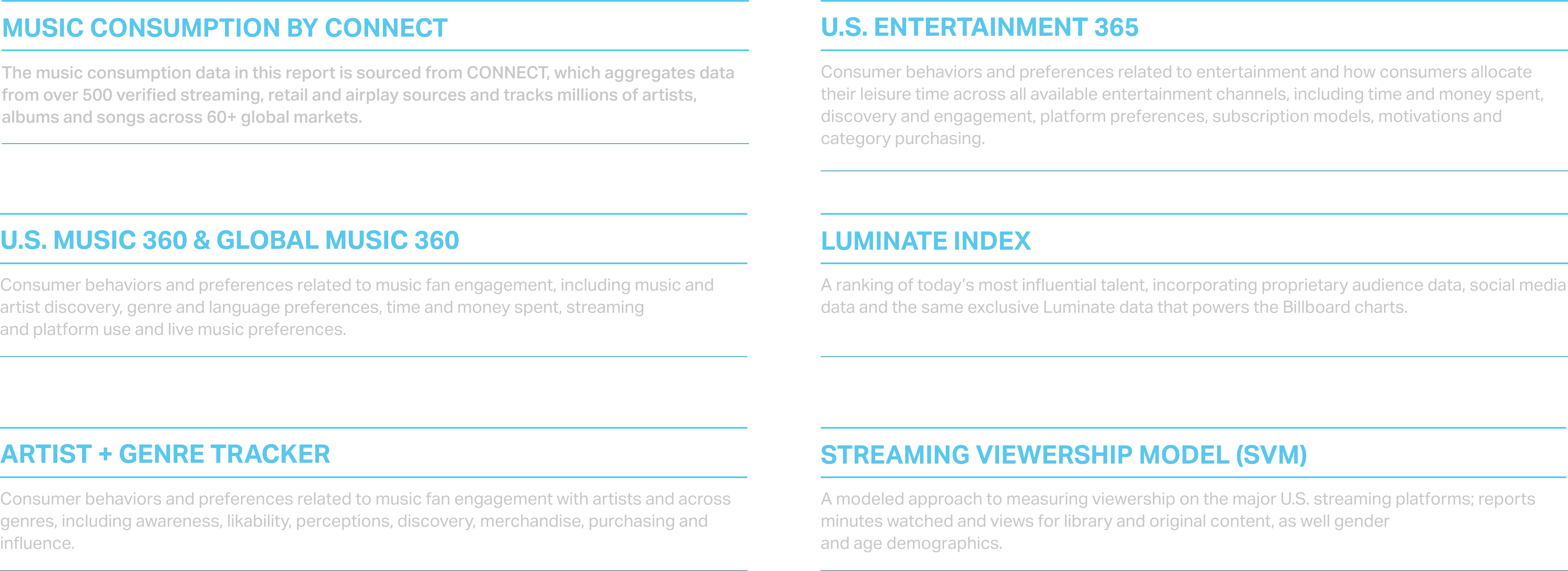 This 2025 Midyear Music Report is powered by Luminate's industry-leading data used by entertainment executives, investors, brand leaders and technology visionaries. For more information or to inquire about accessing the data, please visit luminatedata.com.