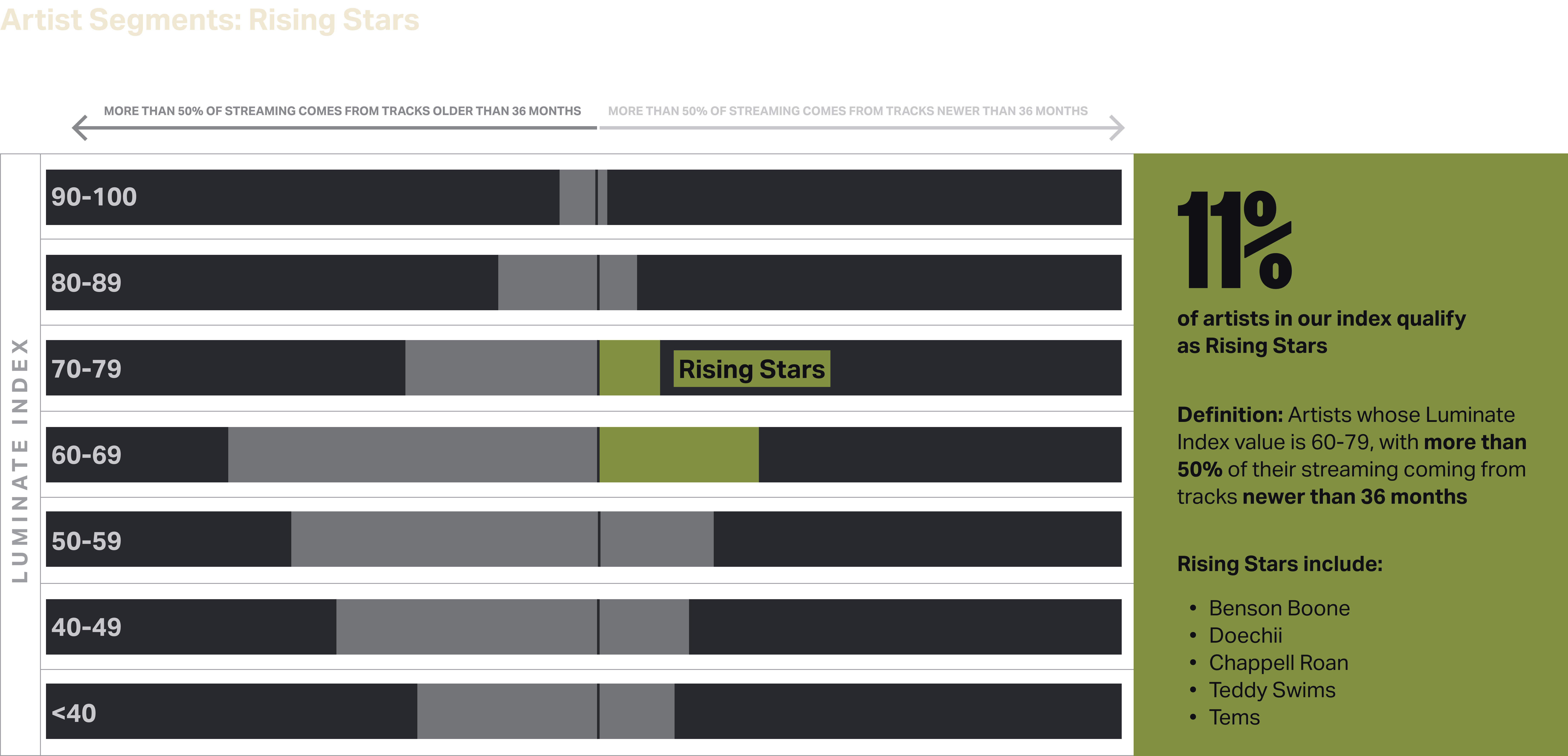A key business focus is identifying the next generation of superstars who will energize the industry and captivate fans. This section leverages the Luminate Index for a quantitative analysis of emerging superstars, rising talents and tomorrow’s stars.
