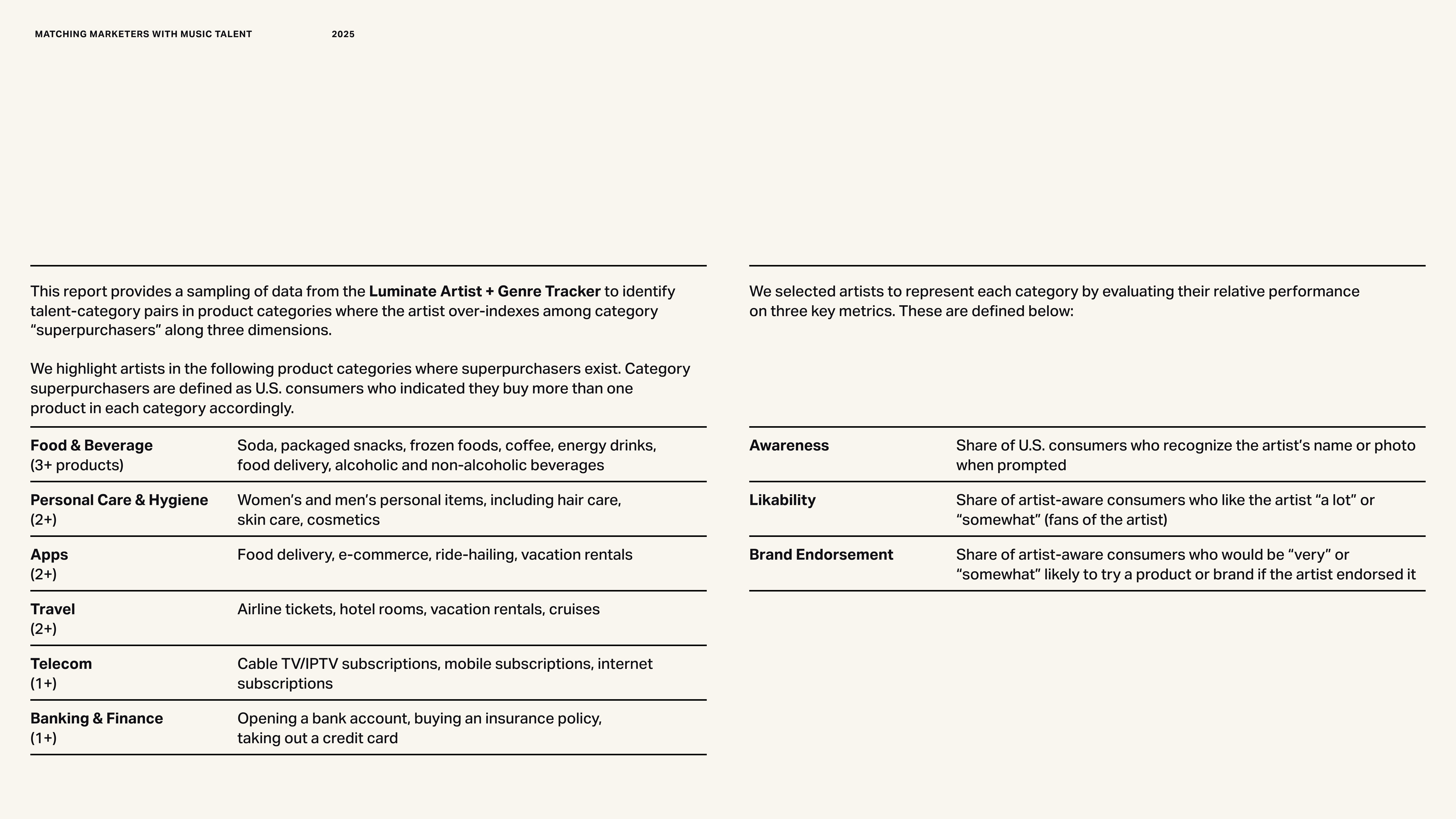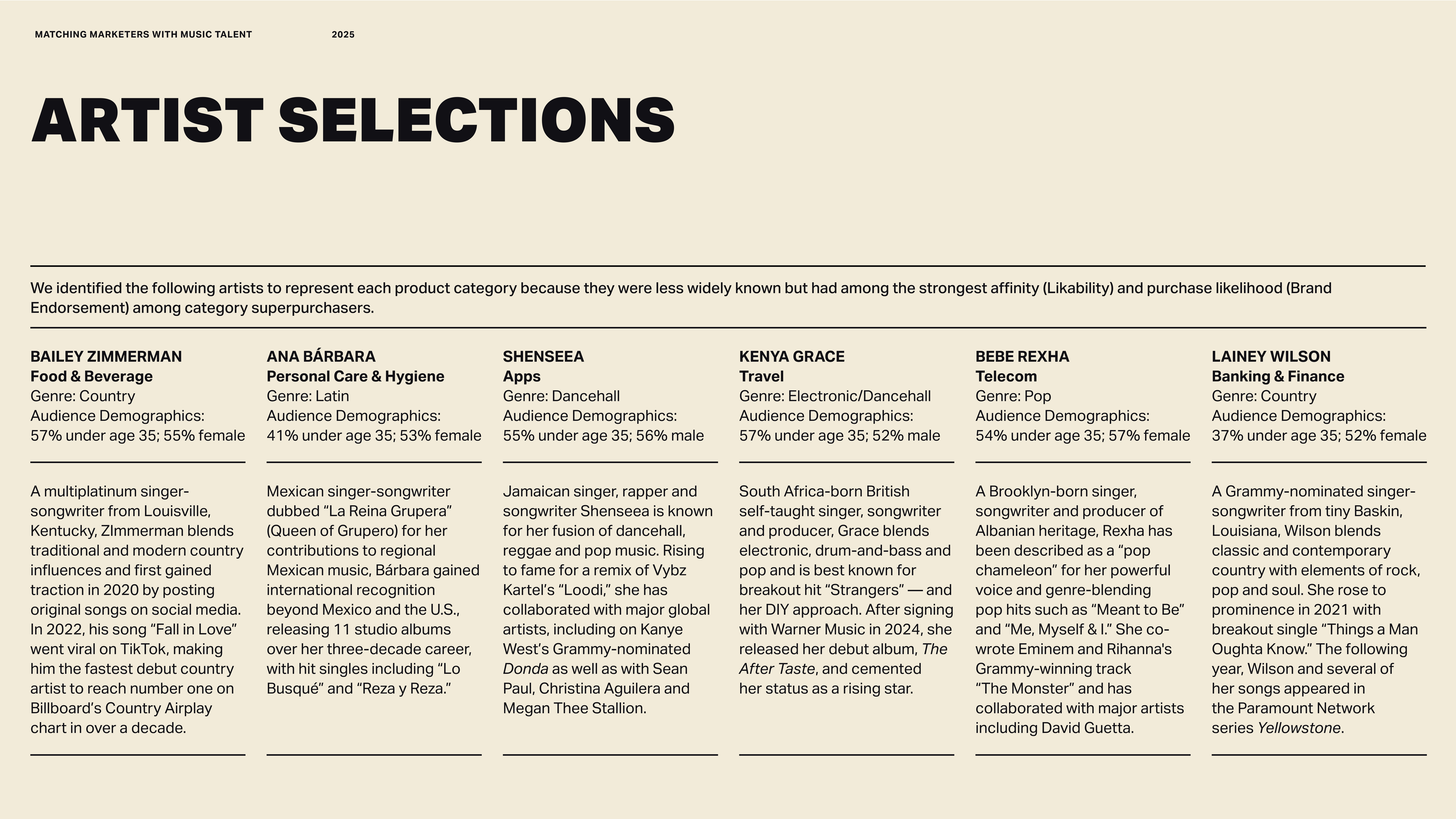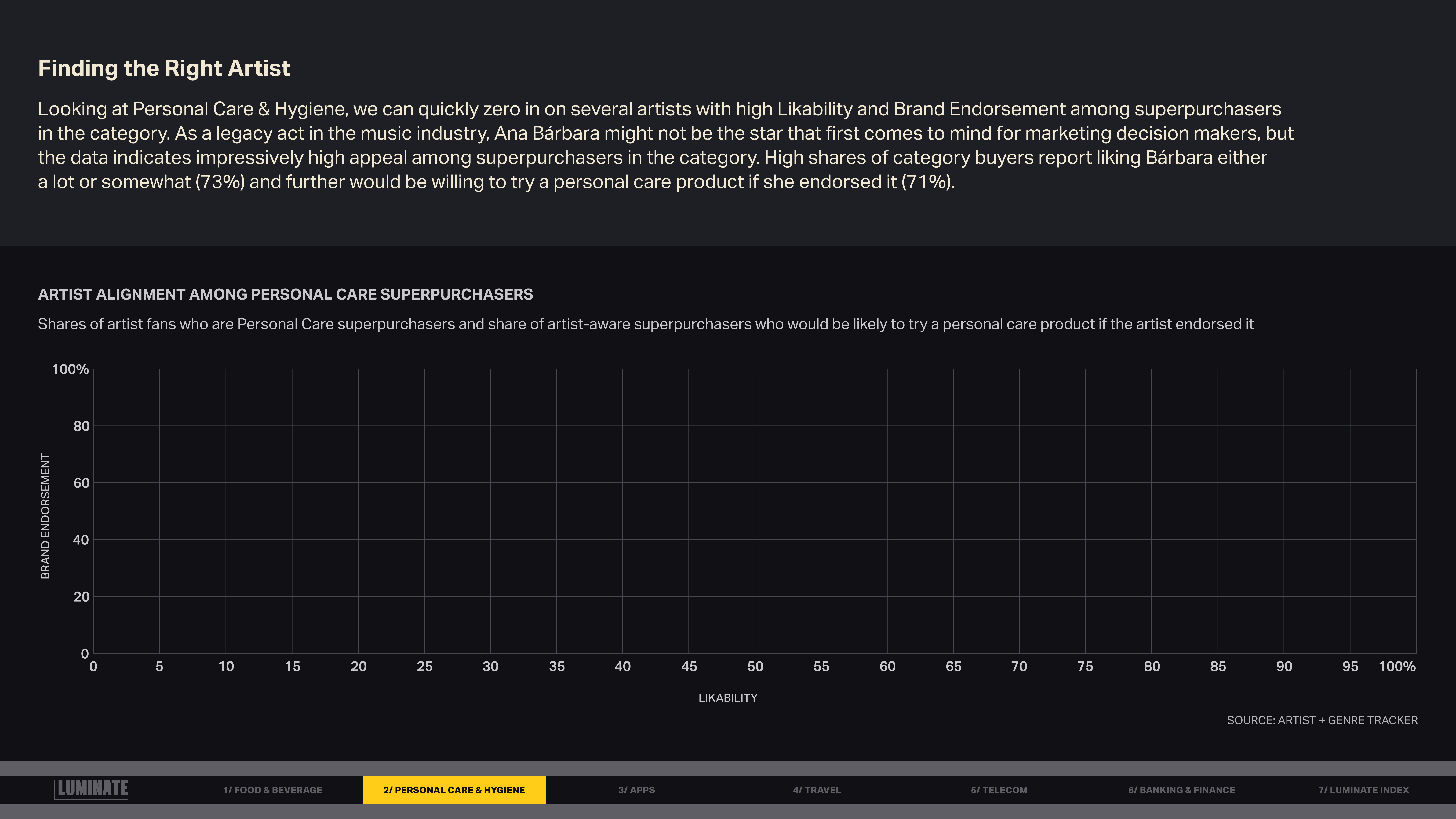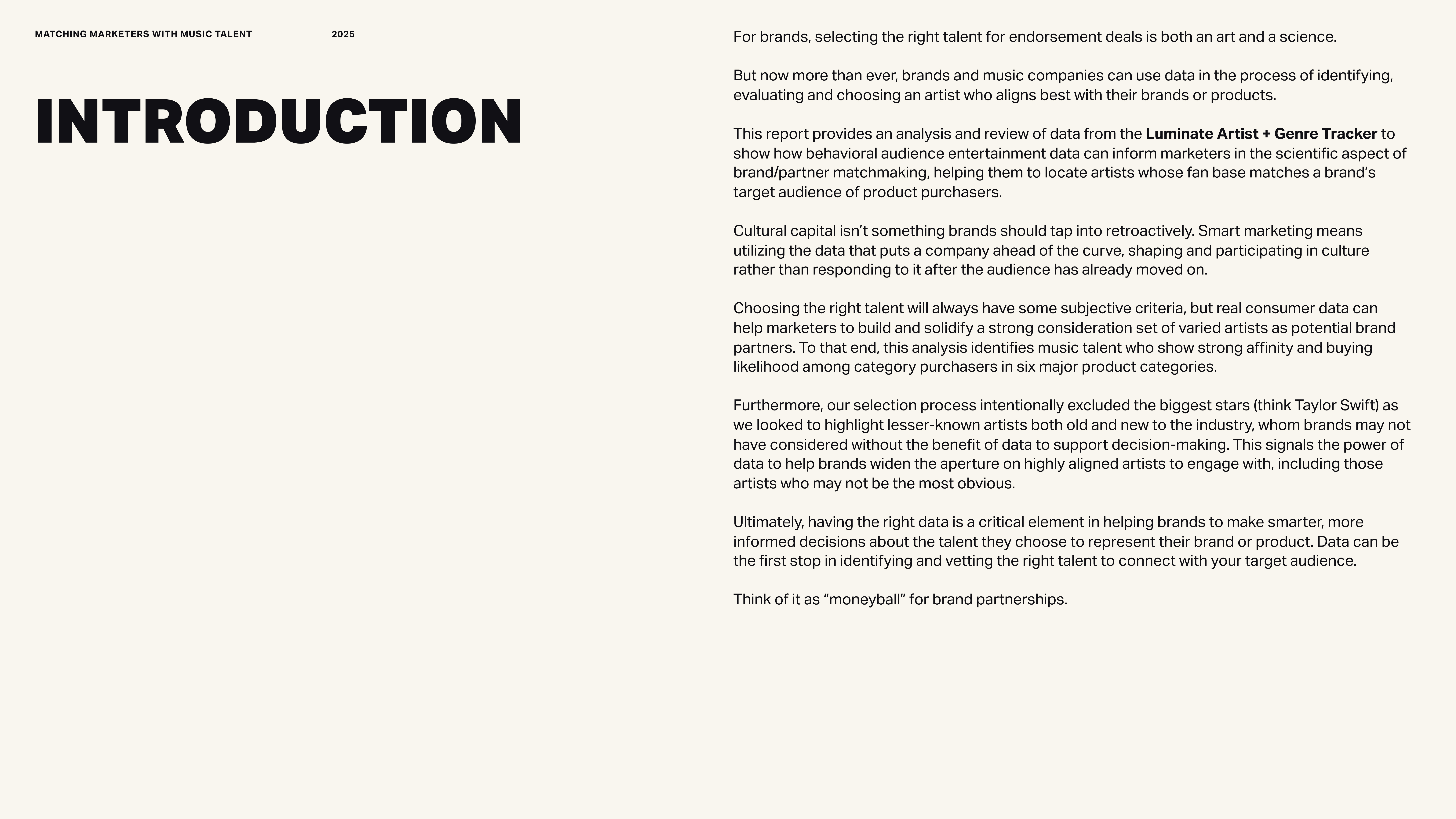 For brands, selecting the right talent for endorsement deals is both an art and a science. But now more than ever, brands and music companies can use data in the process of identifying, evaluating and choosing an artist who aligns best with their brands or products. This report provides an analysis and review of data from the Luminate Artist + Genre Tracker to show how behavioral audience entertainment data can inform marketers in the scientific aspect of brand/partner matchmaking, helping them to locate artists whose fan base matches a brand’s target audience of product purchasers. Cultural capital isn’t something brands should tap into retroactively. Smart marketing means utilizing the data that puts a company ahead of the curve, shaping and participating in culture rather than responding to it after the audience has already moved on. Choosing the right talent will always have some subjective criteria, but real consumer data can help marketers to build and solidify a strong consideration set of varied artists as potential brand partners. To that end, this analysis identifies music talent who show strong affinity and buying likelihood among category purchasers in six major product categories. Furthermore, our selection process intentionally excluded the biggest stars (think Taylor Swift) as we looked to highlight lesser-known artists both old and new to the industry, whom brands may not have considered without the benefit of data to support decision-making. This signals the power of data to help brands widen the aperture on highly aligned artists to engage with, including those artists who may not be the most obvious. Ultimately, having the right data is a critical element in helping brands to make smarter, more informed decisions about the talent they choose to represent their brand or product. Data can be the first stop in identifying and vetting the right talent to connect with your target audience.Think of it as “moneyball” for brand partnerships.