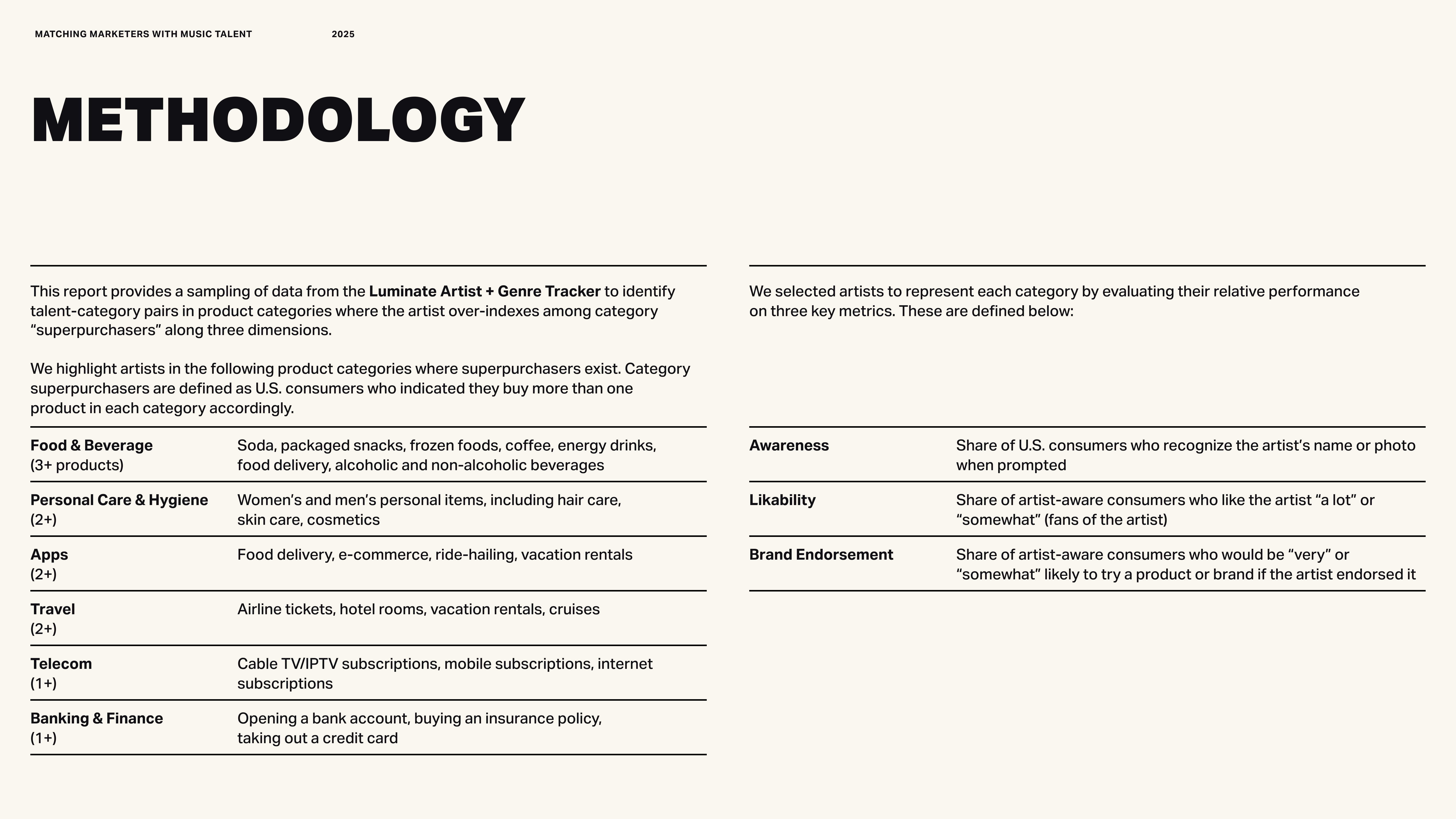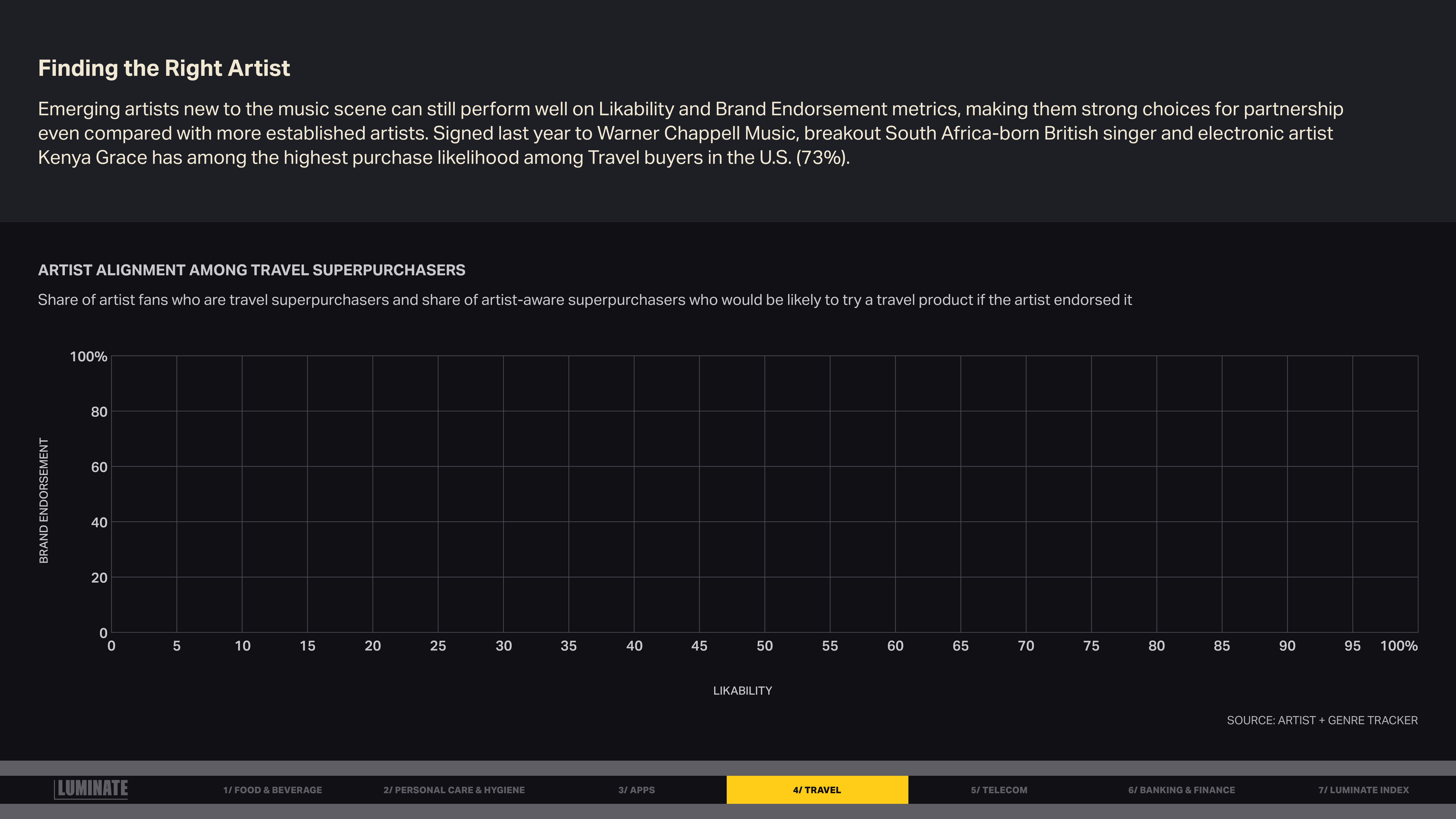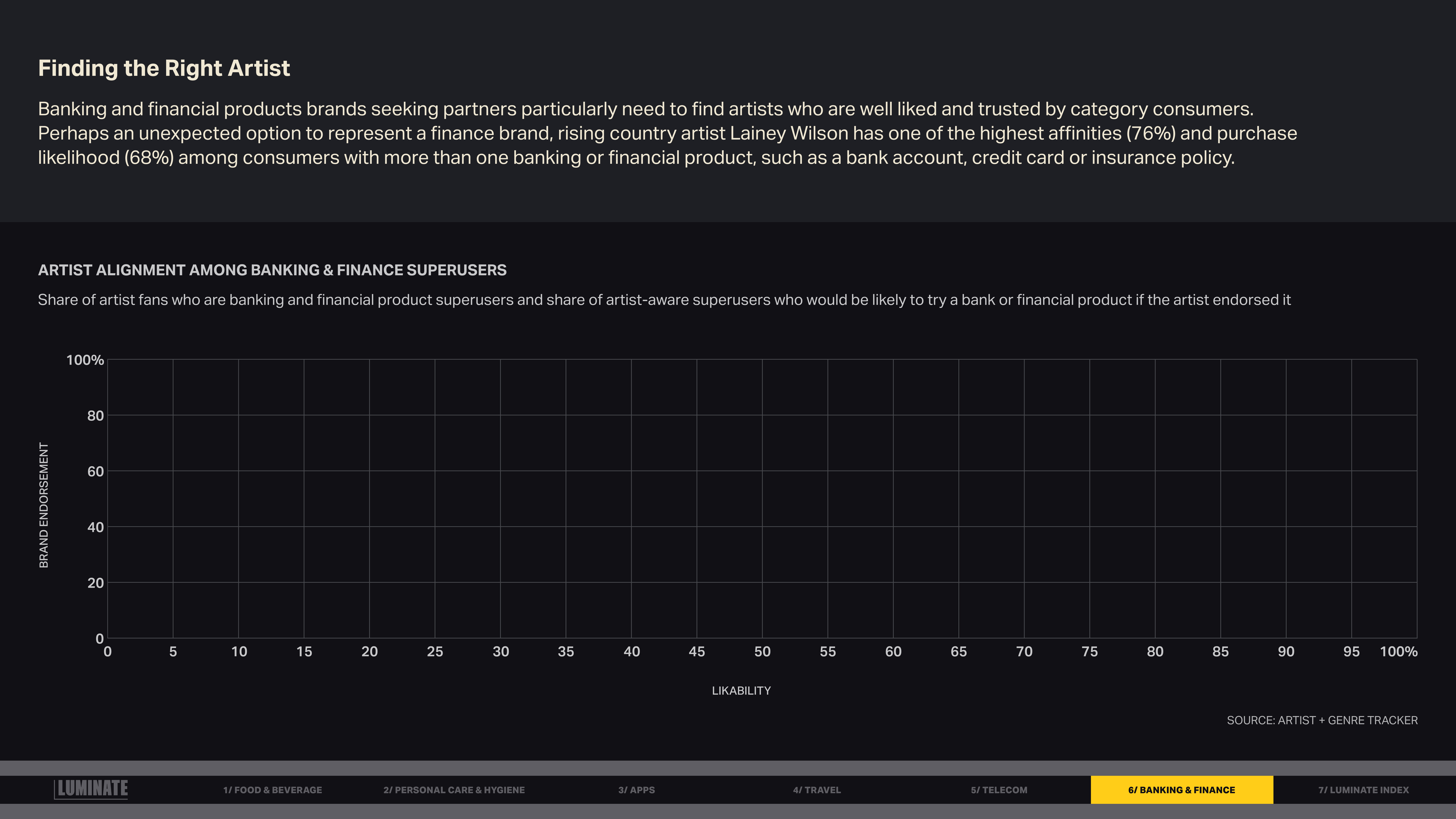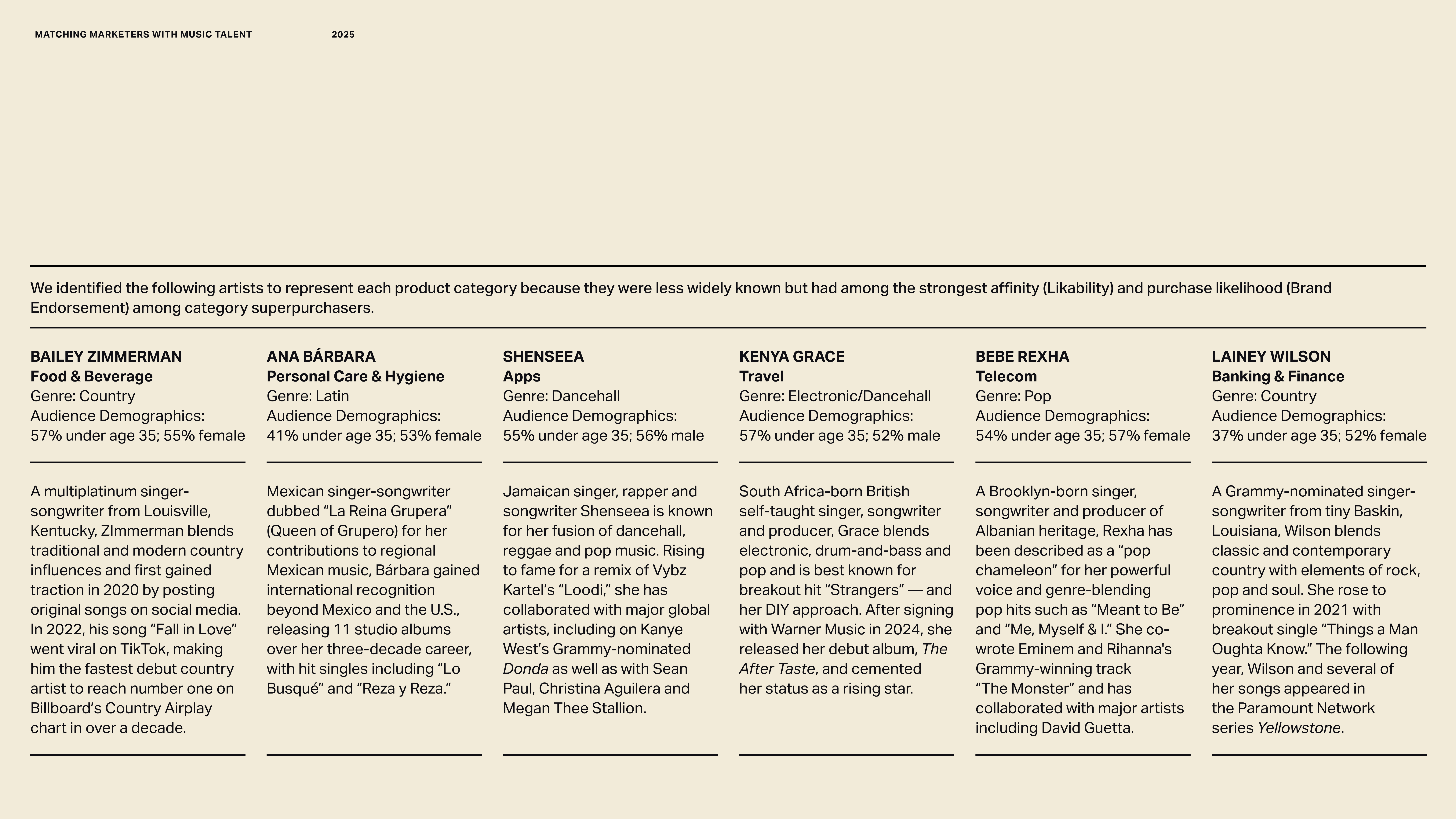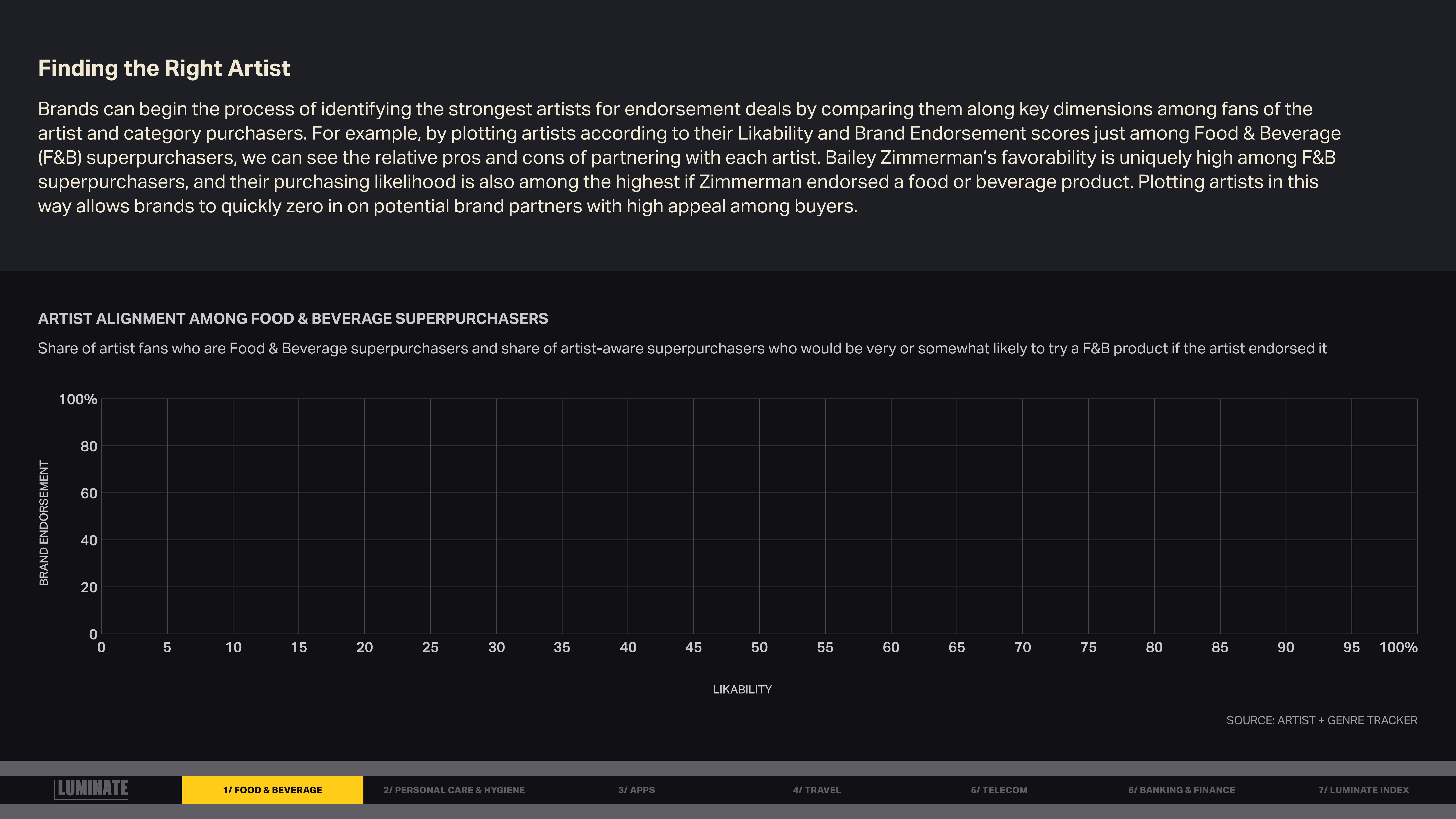 For brands, selecting the right talent for endorsement deals is both an art and a science. But now more than ever, brands and music companies can use data in the process of identifying, evaluating and choosing an artist who aligns best with their brands or products. This report provides an analysis and review of data from the Luminate Artist + Genre Tracker to show how behavioral audience entertainment data can inform marketers in the scientific aspect of brand/partner matchmaking, helping them to locate artists whose fan base matches a brand’s target audience of product purchasers. Cultural capital isn’t something brands should tap into retroactively. Smart marketing means utilizing the data that puts a company ahead of the curve, shaping and participating in culture rather than responding to it after the audience has already moved on. Choosing the right talent will always have some subjective criteria, but real consumer data can help marketers to build and solidify a strong consideration set of varied artists as potential brand partners. To that end, this analysis identifies music talent who show strong affinity and buying likelihood among category purchasers in six major product categories. Furthermore, our selection process intentionally excluded the biggest stars (think Taylor Swift) as we looked to highlight lesser-known artists both old and new to the industry, whom brands may not have considered without the benefit of data to support decision-making. This signals the power of data to help brands widen the aperture on highly aligned artists to engage with, including those artists who may not be the most obvious. Ultimately, having the right data is a critical element in helping brands to make smarter, more informed decisions about the talent they choose to represent their brand or product. Data can be the first stop in identifying and vetting the right talent to connect with your target audience.Think of it as “moneyball” for brand partnerships.