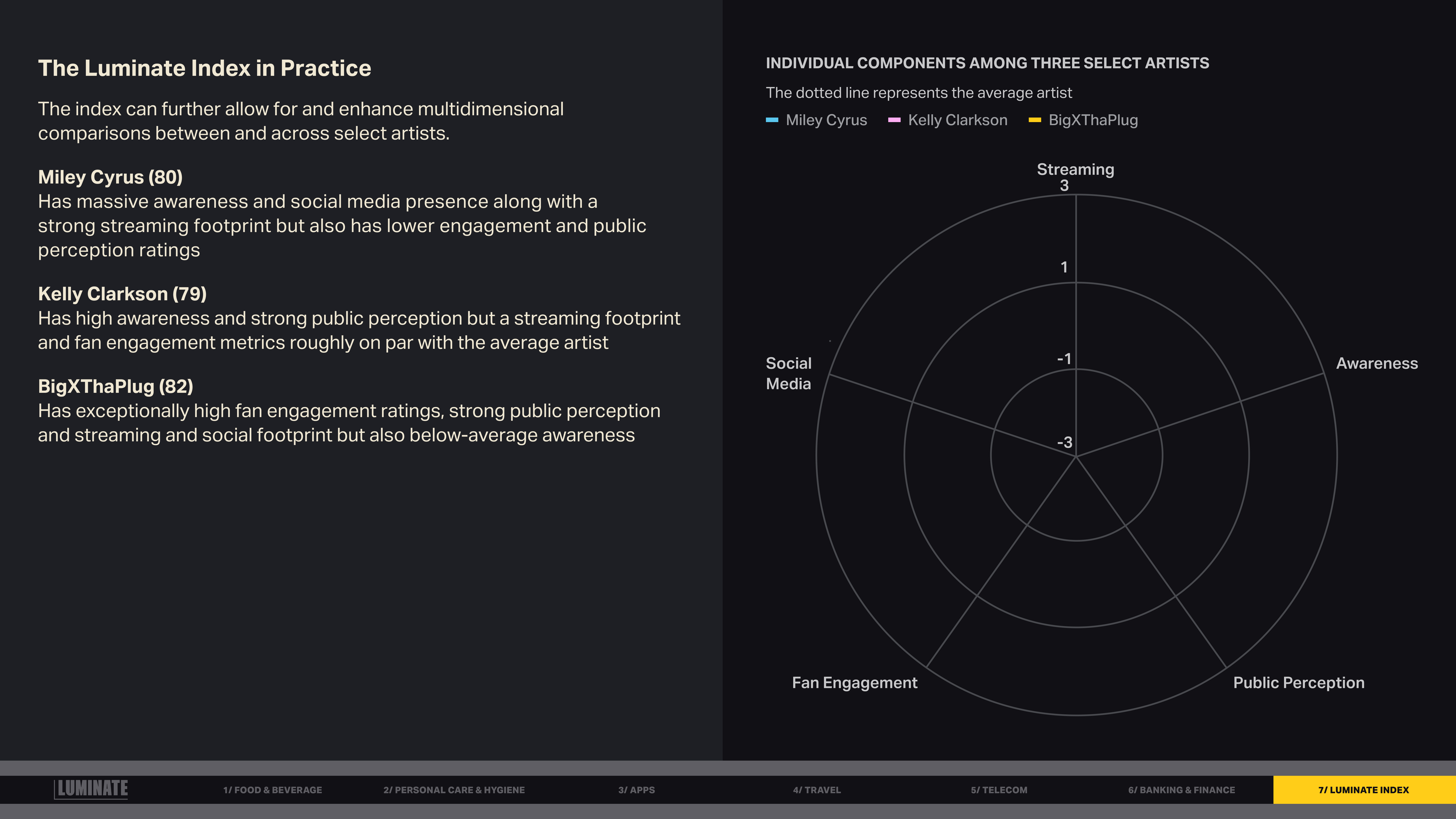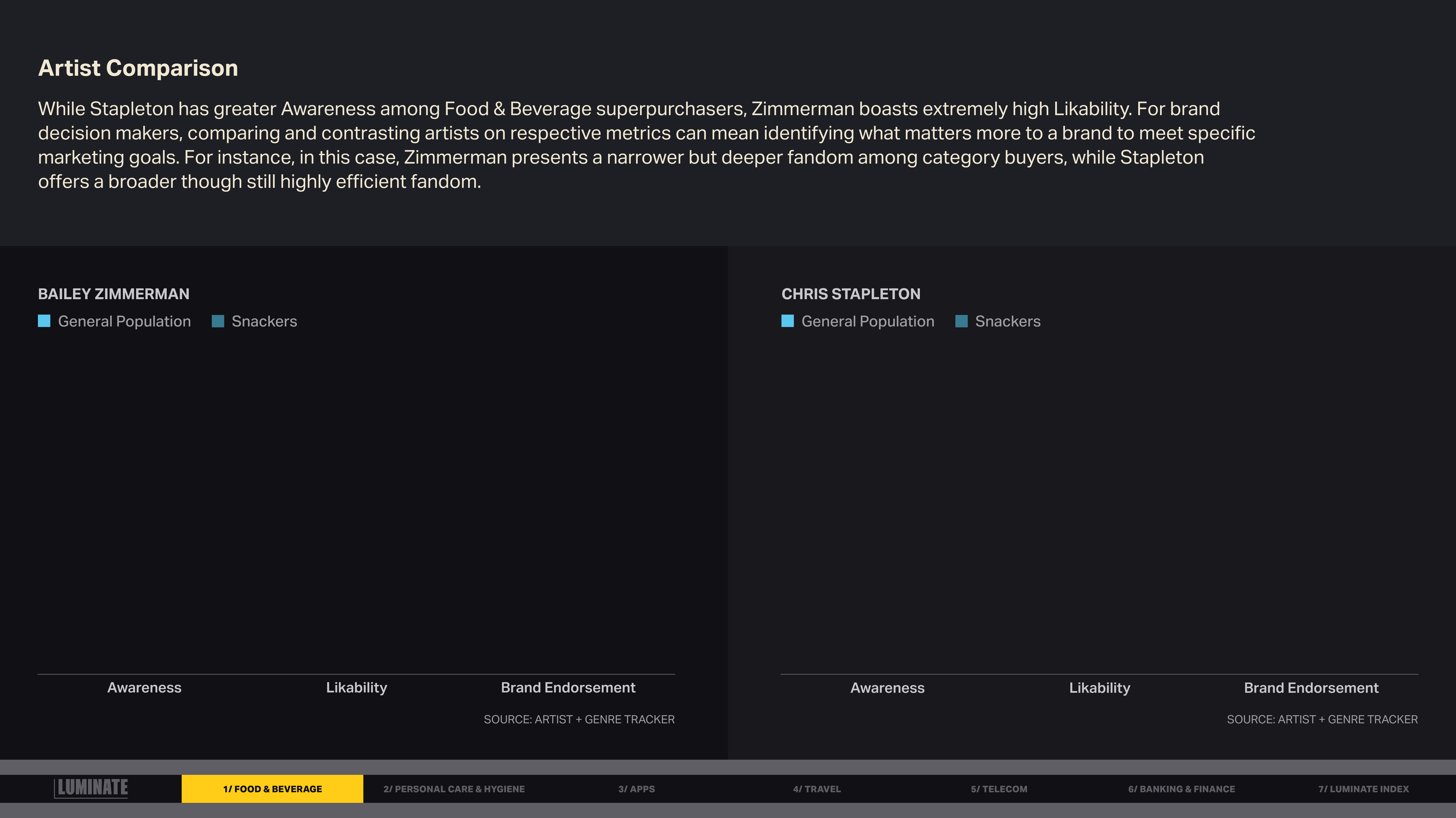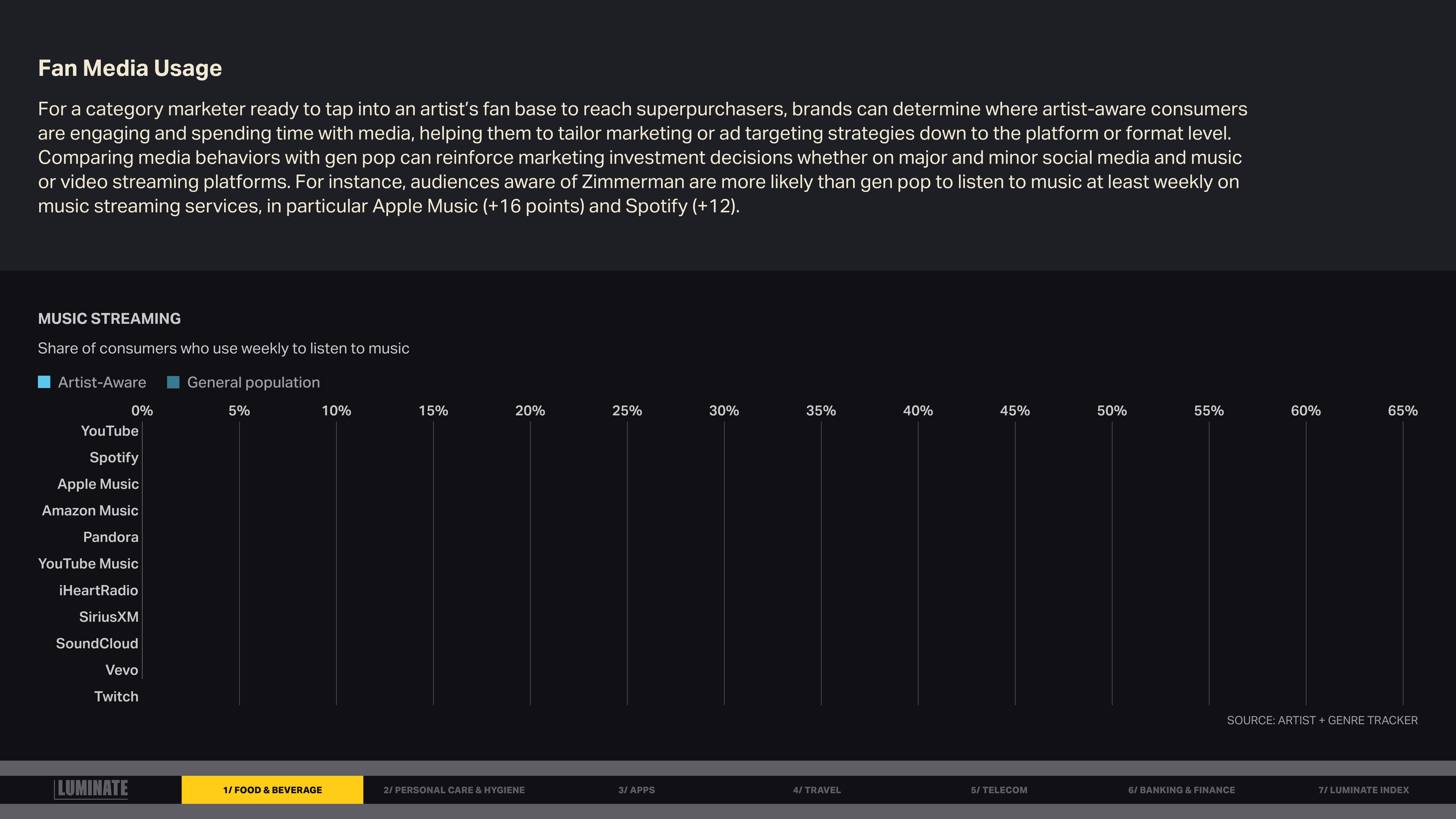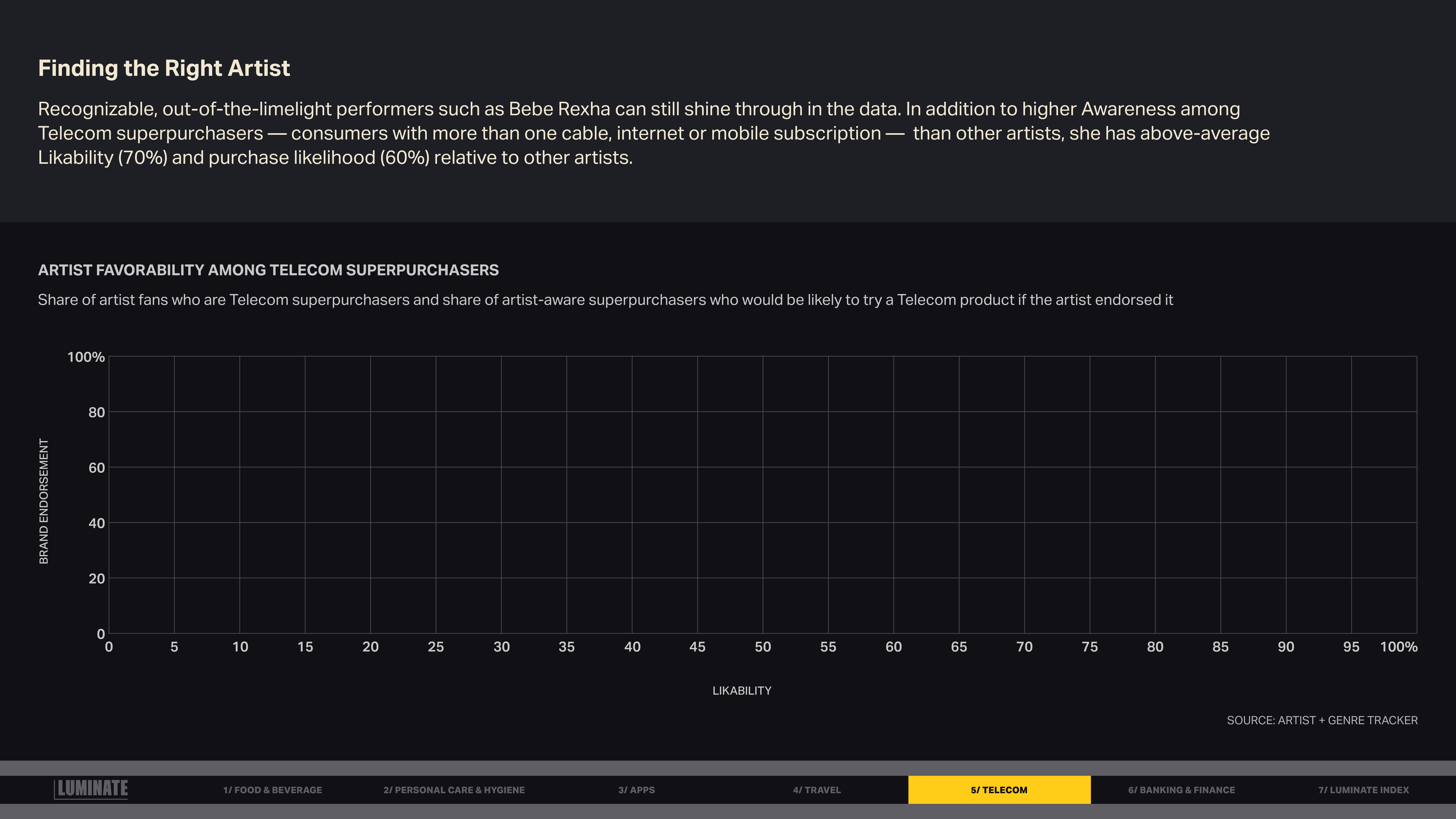 For brands, selecting the right talent for endorsement deals is both an art and a science. But now more than ever, brands and music companies can use data in the process of identifying, evaluating and choosing an artist who aligns best with their brands or products. This report provides an analysis and review of data from the Luminate Artist + Genre Tracker to show how behavioral audience entertainment data can inform marketers in the scientific aspect of brand/partner matchmaking, helping them to locate artists whose fan base matches a brand’s target audience of product purchasers. Cultural capital isn’t something brands should tap into retroactively. Smart marketing means utilizing the data that puts a company ahead of the curve, shaping and participating in culture rather than responding to it after the audience has already moved on. Choosing the right talent will always have some subjective criteria, but real consumer data can help marketers to build and solidify a strong consideration set of varied artists as potential brand partners. To that end, this analysis identifies music talent who show strong affinity and buying likelihood among category purchasers in six major product categories. Furthermore, our selection process intentionally excluded the biggest stars (think Taylor Swift) as we looked to highlight lesser-known artists both old and new to the industry, whom brands may not have considered without the benefit of data to support decision-making. This signals the power of data to help brands widen the aperture on highly aligned artists to engage with, including those artists who may not be the most obvious. Ultimately, having the right data is a critical element in helping brands to make smarter, more informed decisions about the talent they choose to represent their brand or product. Data can be the first stop in identifying and vetting the right talent to connect with your target audience.Think of it as “moneyball” for brand partnerships.