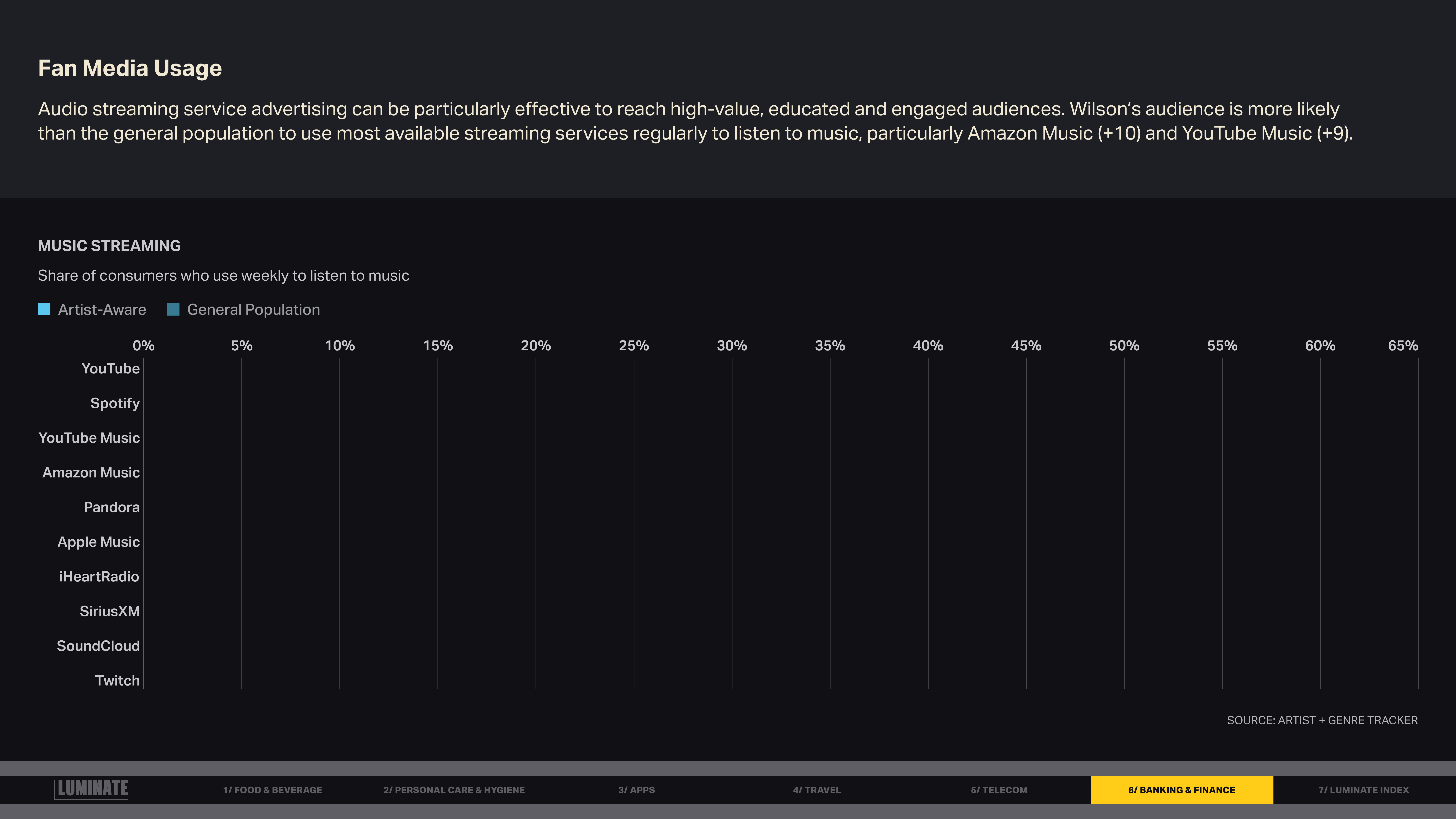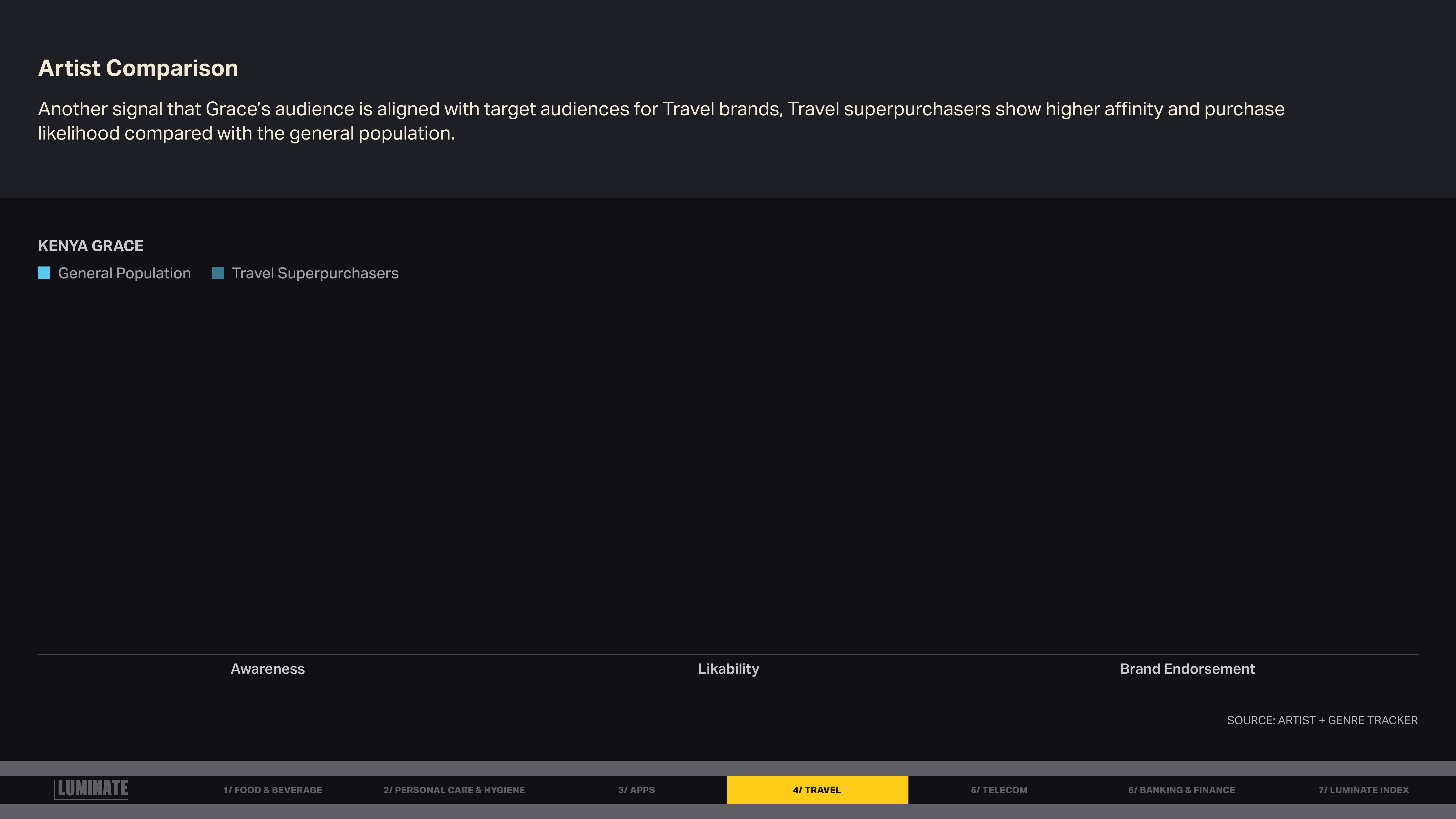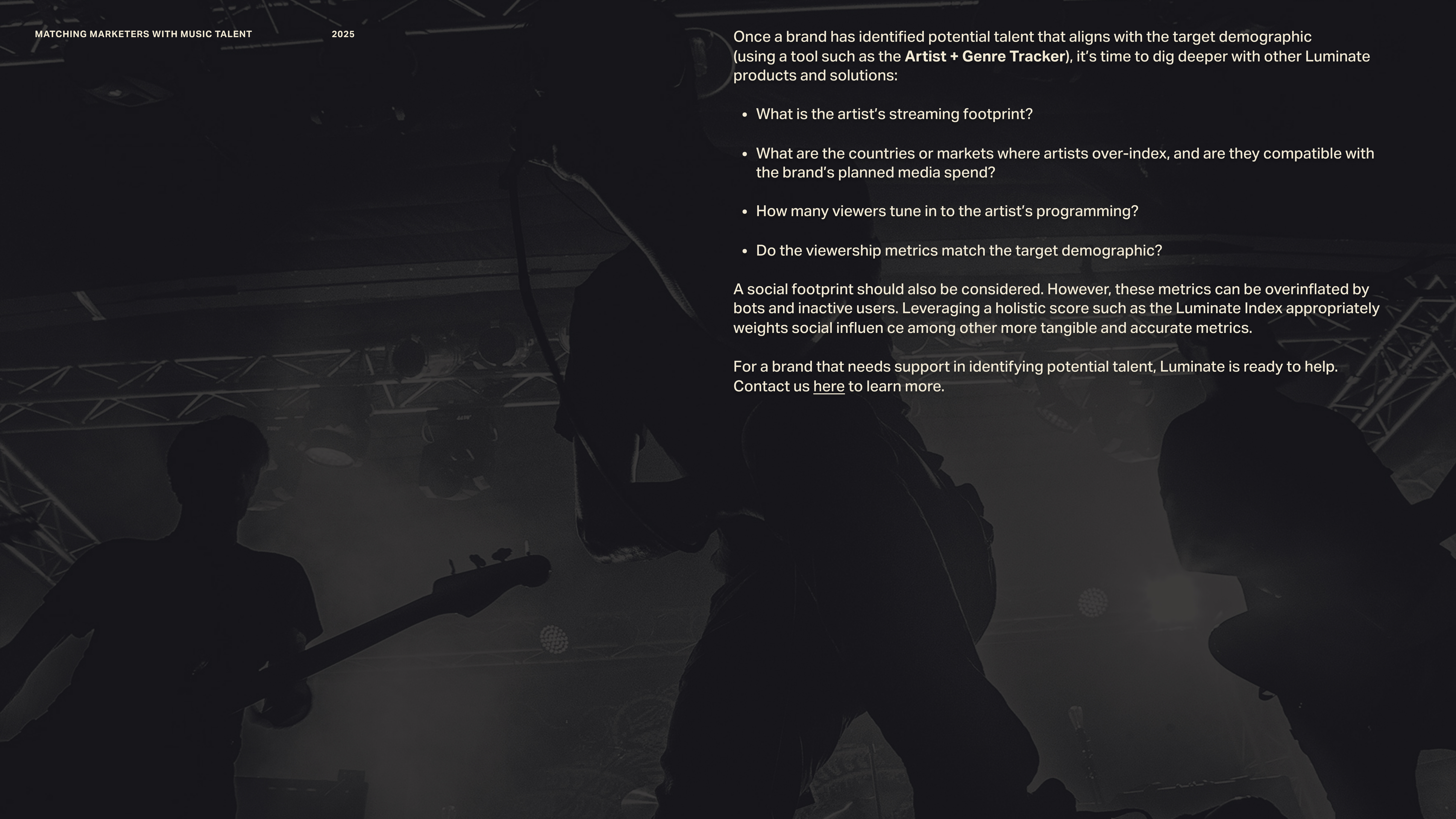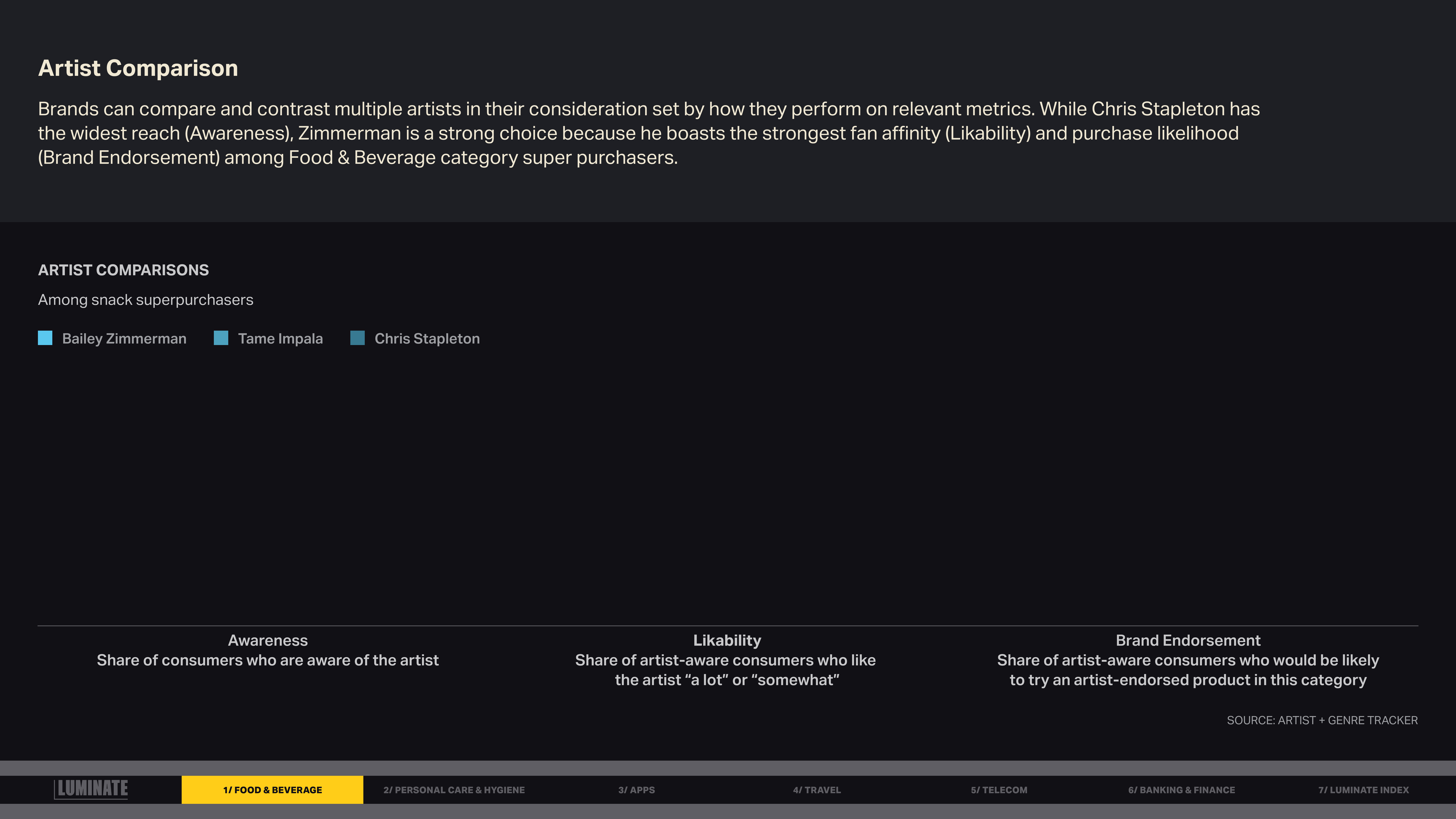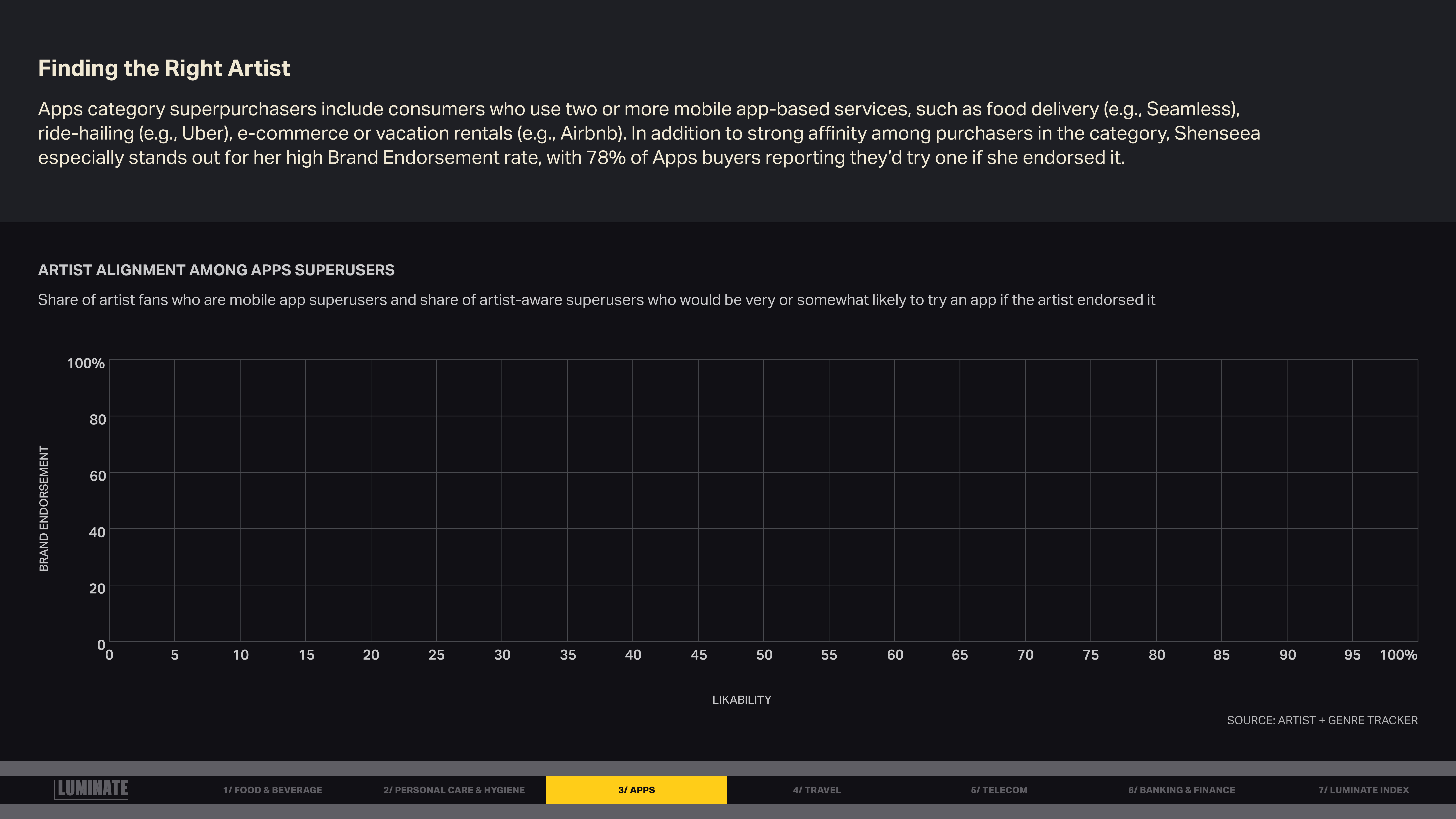 For brands, selecting the right talent for endorsement deals is both an art and a science. But now more than ever, brands and music companies can use data in the process of identifying, evaluating and choosing an artist who aligns best with their brands or products. This report provides an analysis and review of data from the Luminate Artist + Genre Tracker to show how behavioral audience entertainment data can inform marketers in the scientific aspect of brand/partner matchmaking, helping them to locate artists whose fan base matches a brand’s target audience of product purchasers. Cultural capital isn’t something brands should tap into retroactively. Smart marketing means utilizing the data that puts a company ahead of the curve, shaping and participating in culture rather than responding to it after the audience has already moved on. Choosing the right talent will always have some subjective criteria, but real consumer data can help marketers to build and solidify a strong consideration set of varied artists as potential brand partners. To that end, this analysis identifies music talent who show strong affinity and buying likelihood among category purchasers in six major product categories. Furthermore, our selection process intentionally excluded the biggest stars (think Taylor Swift) as we looked to highlight lesser-known artists both old and new to the industry, whom brands may not have considered without the benefit of data to support decision-making. This signals the power of data to help brands widen the aperture on highly aligned artists to engage with, including those artists who may not be the most obvious. Ultimately, having the right data is a critical element in helping brands to make smarter, more informed decisions about the talent they choose to represent their brand or product. Data can be the first stop in identifying and vetting the right talent to connect with your target audience.Think of it as “moneyball” for brand partnerships.