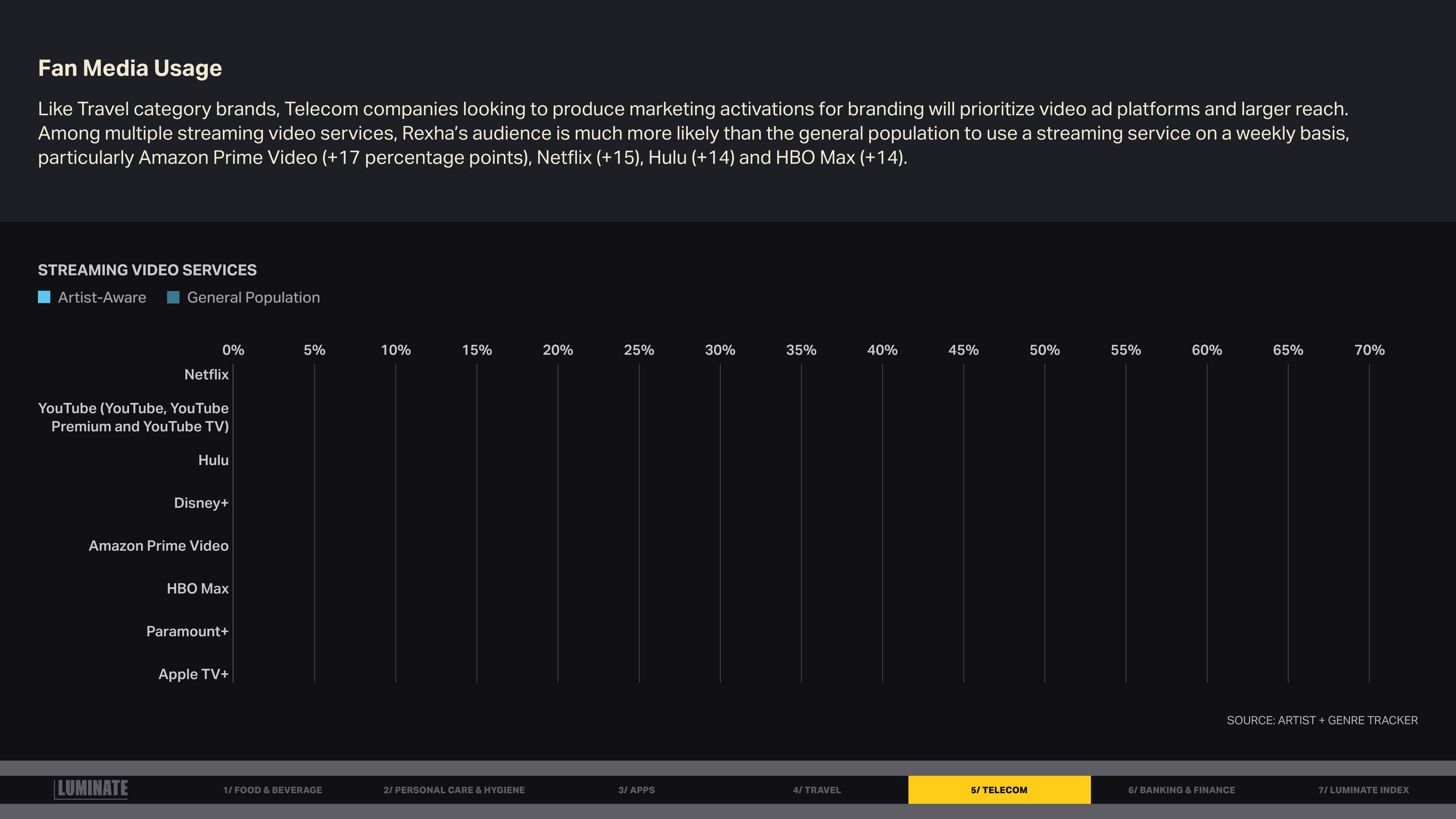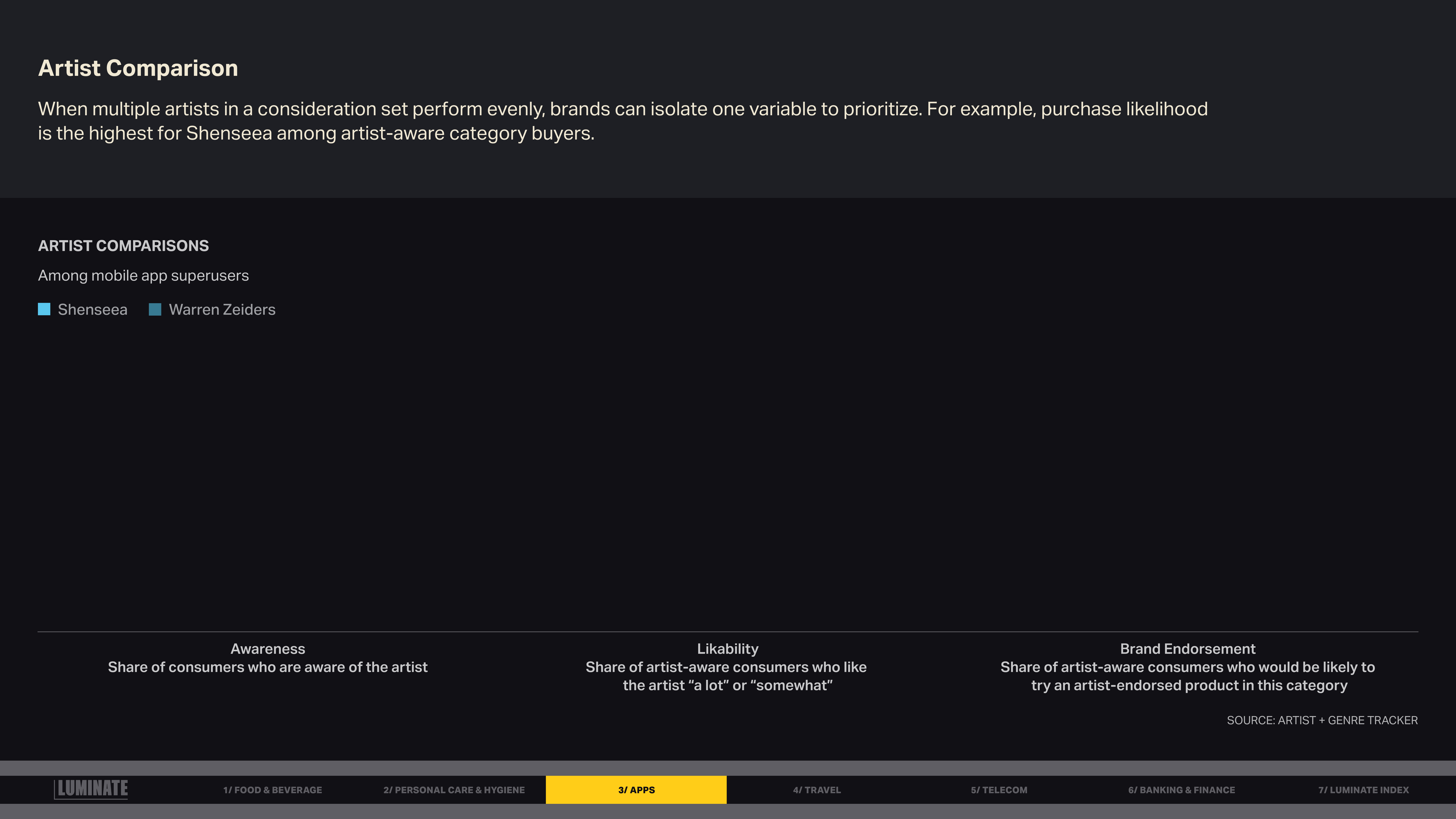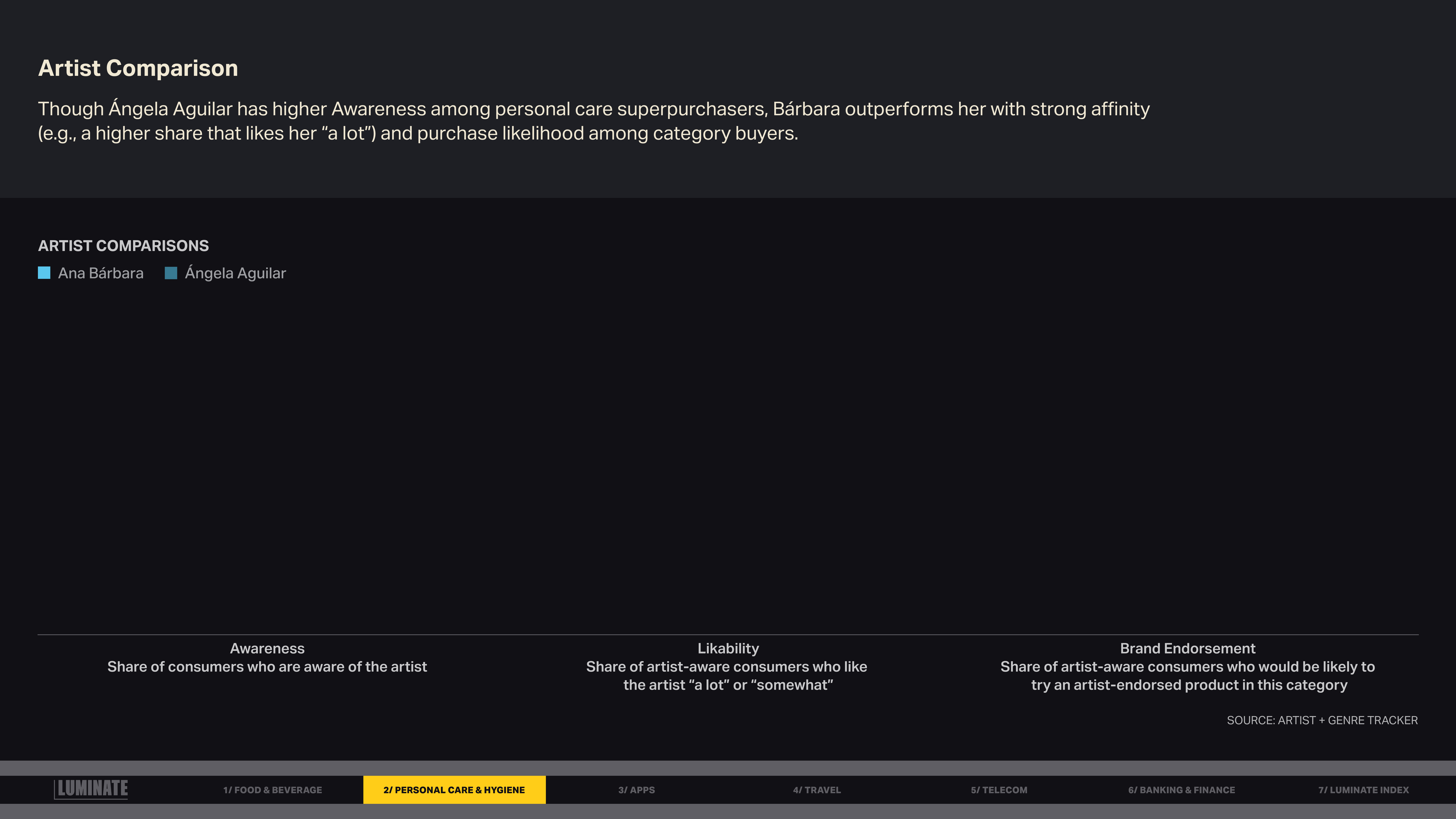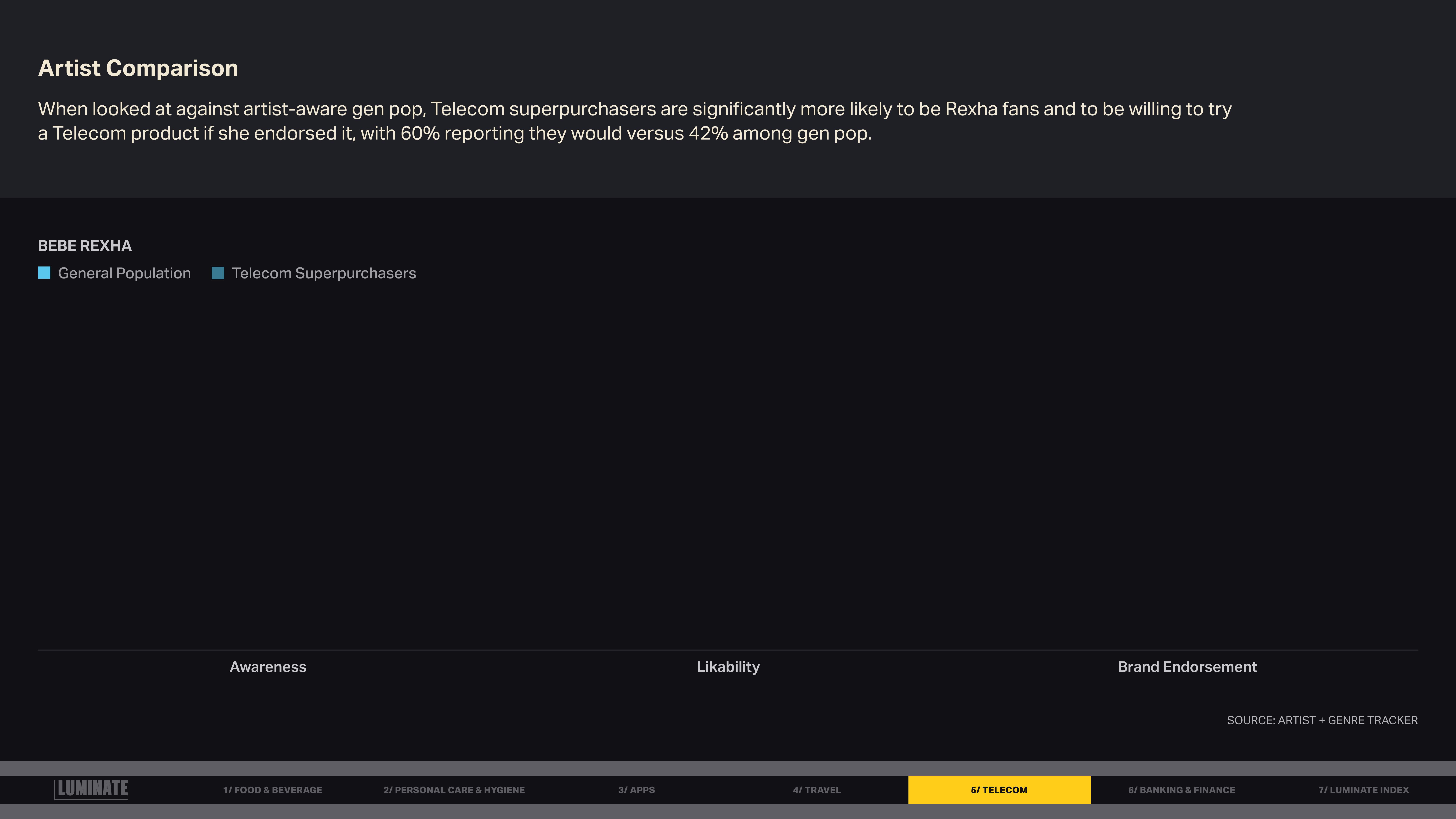 For brands, selecting the right talent for endorsement deals is both an art and a science. But now more than ever, brands and music companies can use data in the process of identifying, evaluating and choosing an artist who aligns best with their brands or products. This report provides an analysis and review of data from the Luminate Artist + Genre Tracker to show how behavioral audience entertainment data can inform marketers in the scientific aspect of brand/partner matchmaking, helping them to locate artists whose fan base matches a brand’s target audience of product purchasers. Cultural capital isn’t something brands should tap into retroactively. Smart marketing means utilizing the data that puts a company ahead of the curve, shaping and participating in culture rather than responding to it after the audience has already moved on. Choosing the right talent will always have some subjective criteria, but real consumer data can help marketers to build and solidify a strong consideration set of varied artists as potential brand partners. To that end, this analysis identifies music talent who show strong affinity and buying likelihood among category purchasers in six major product categories. Furthermore, our selection process intentionally excluded the biggest stars (think Taylor Swift) as we looked to highlight lesser-known artists both old and new to the industry, whom brands may not have considered without the benefit of data to support decision-making. This signals the power of data to help brands widen the aperture on highly aligned artists to engage with, including those artists who may not be the most obvious. Ultimately, having the right data is a critical element in helping brands to make smarter, more informed decisions about the talent they choose to represent their brand or product. Data can be the first stop in identifying and vetting the right talent to connect with your target audience.Think of it as “moneyball” for brand partnerships.