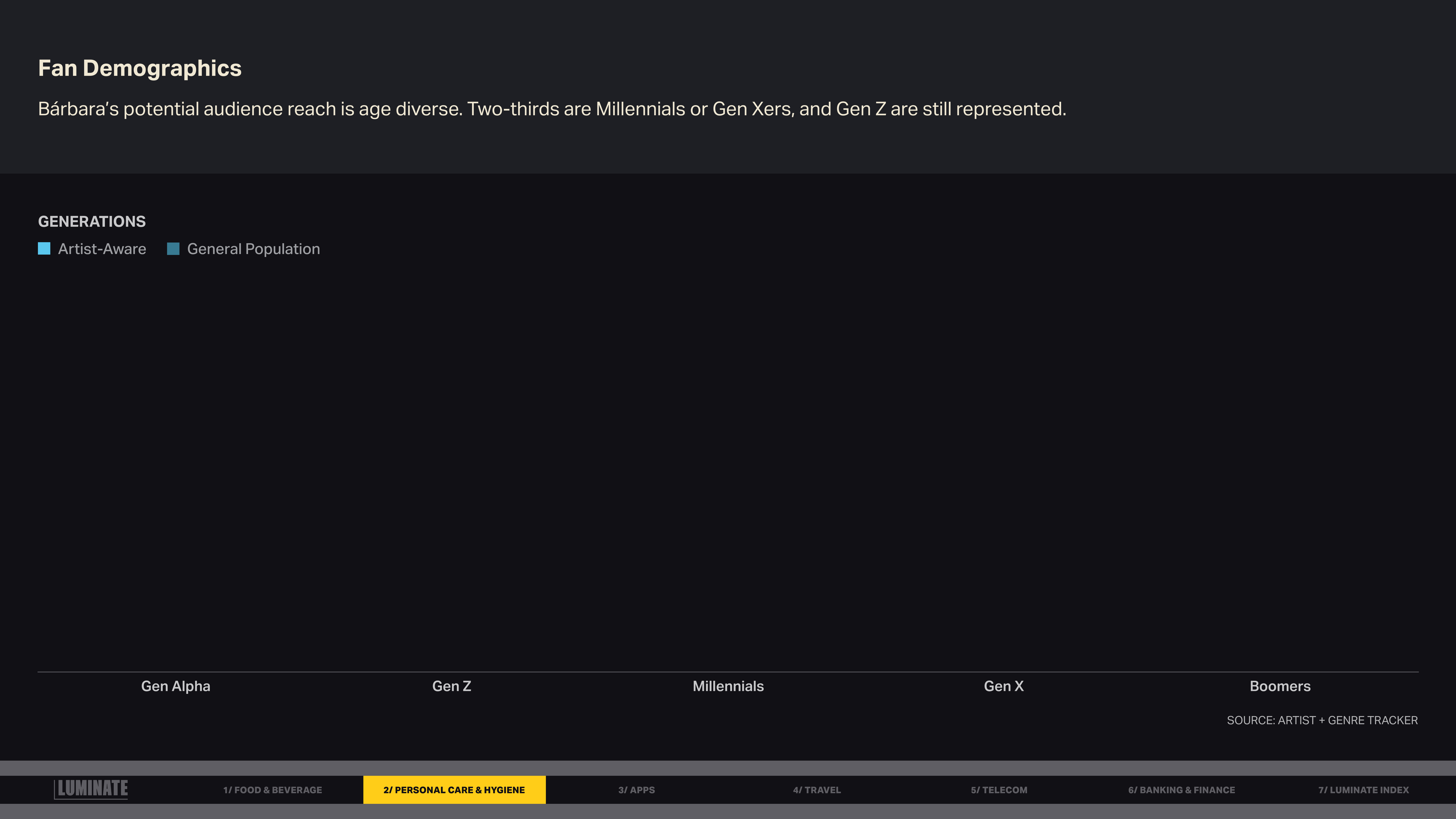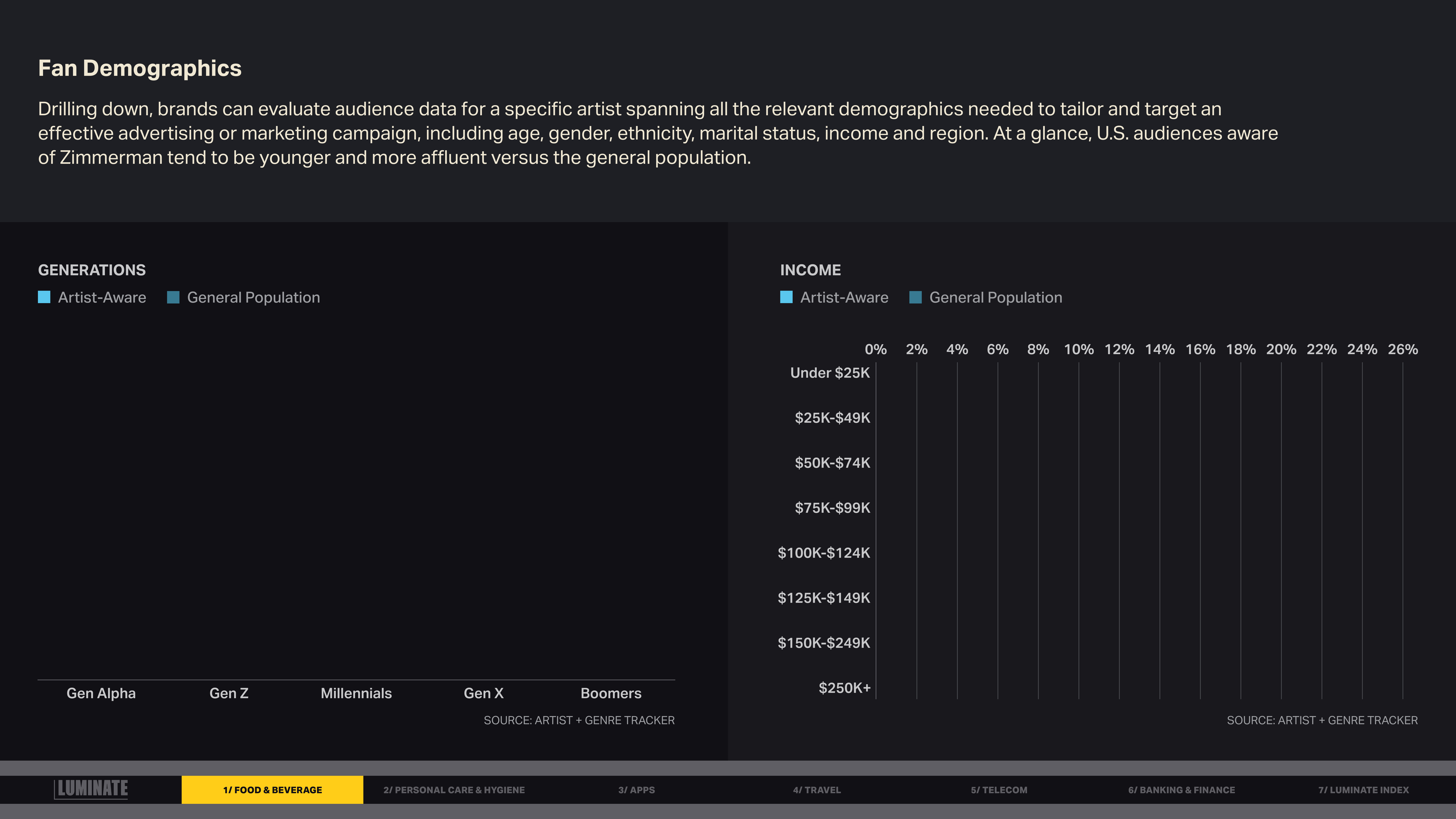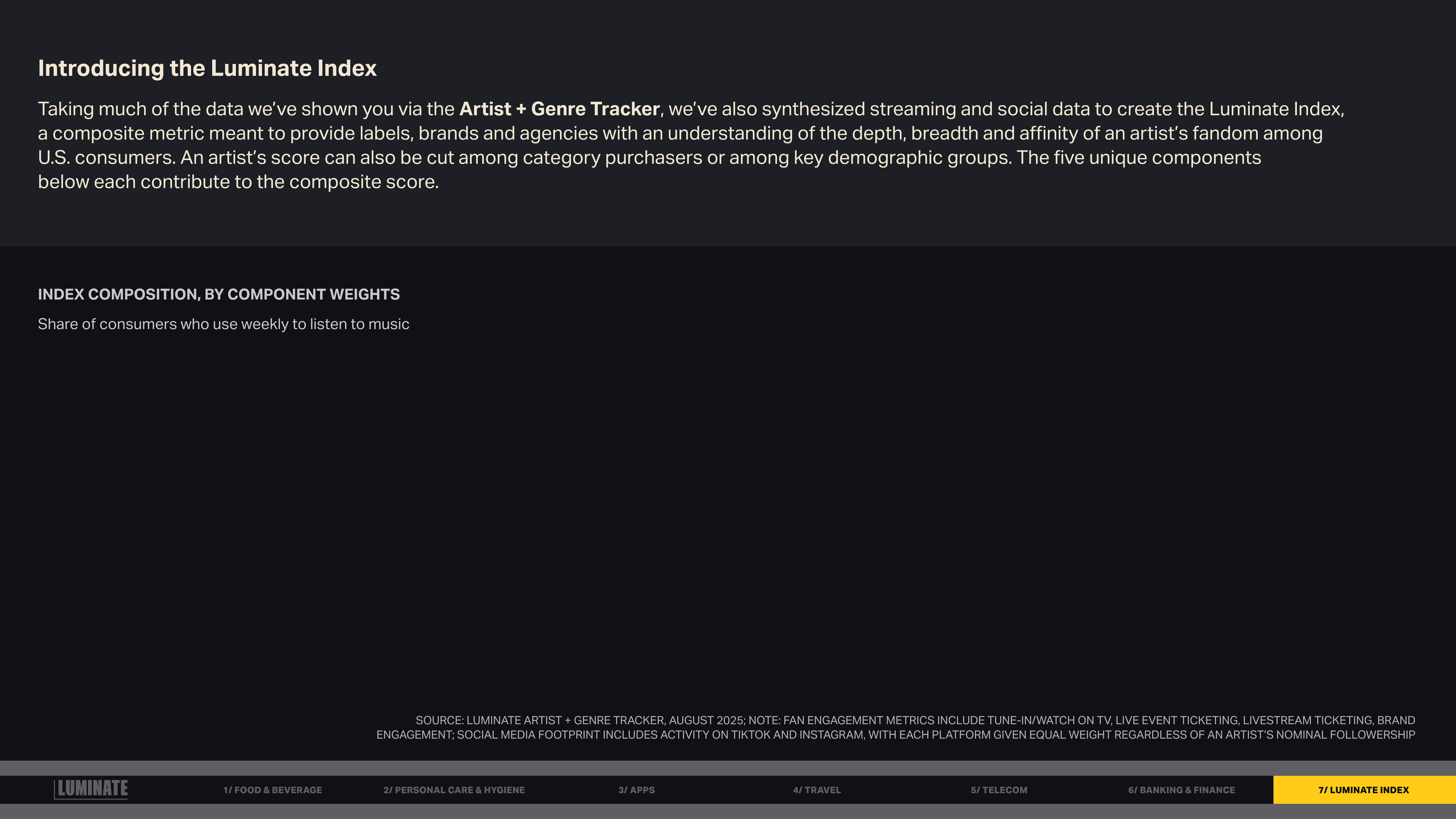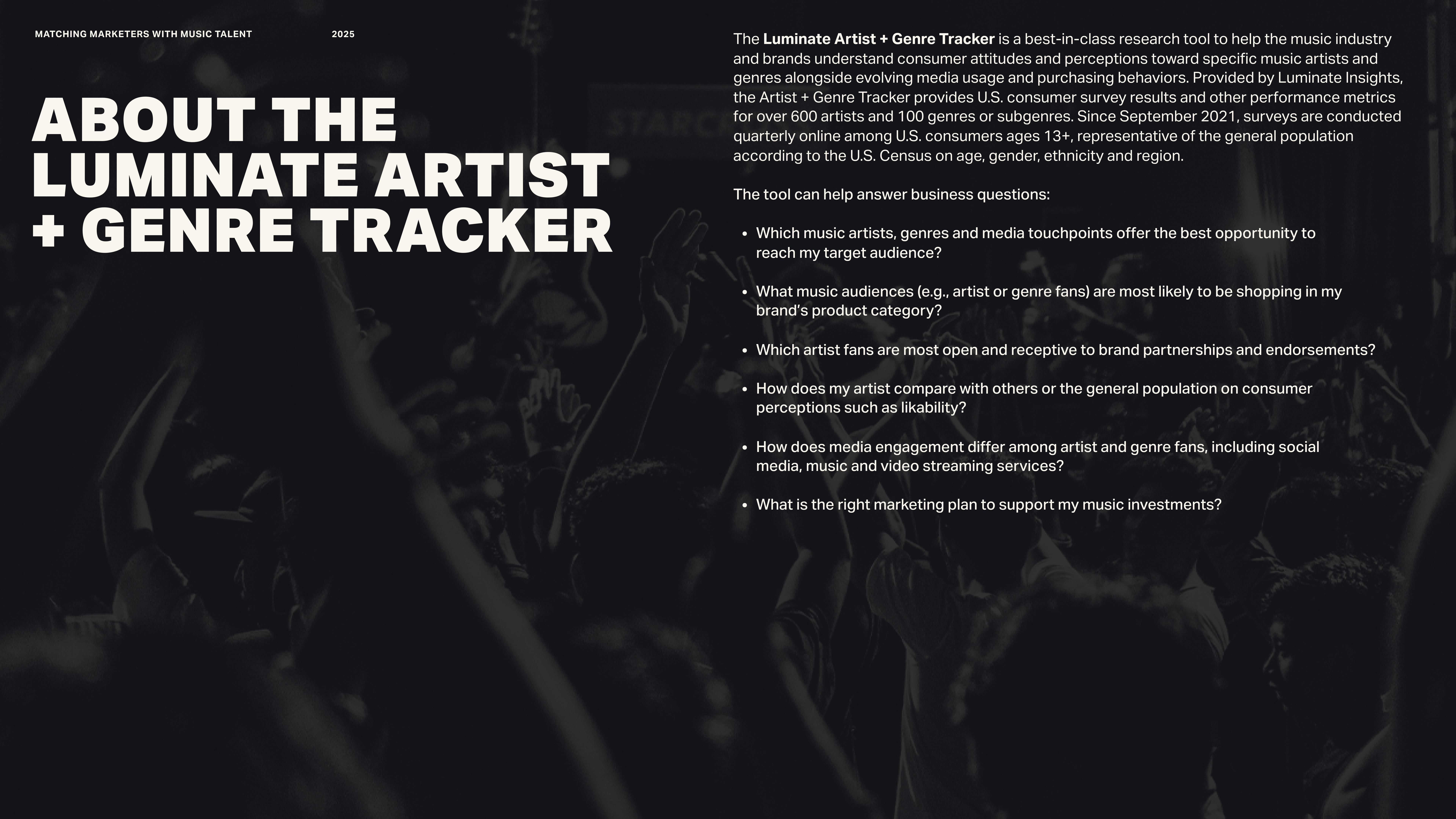 The Luminate Artist + Genre Tracker is a best-in-class research tool to help the music industry and brands understand consumer attitudes and perceptions toward specific music artists and genres alongside evolving media usage and purchasing behaviors. Provided by Luminate Insights, the Artist + Genre Tracker provides U.S. consumer survey results and other performance metrics for over 600 artists and 100 genres or subgenres. Since September 2021, surveys are conducted quarterly online among U.S. consumers ages 13+, representative of the general population according to the U.S. Census on age, gender, ethnicity and region. The tool can help answer business questions:
