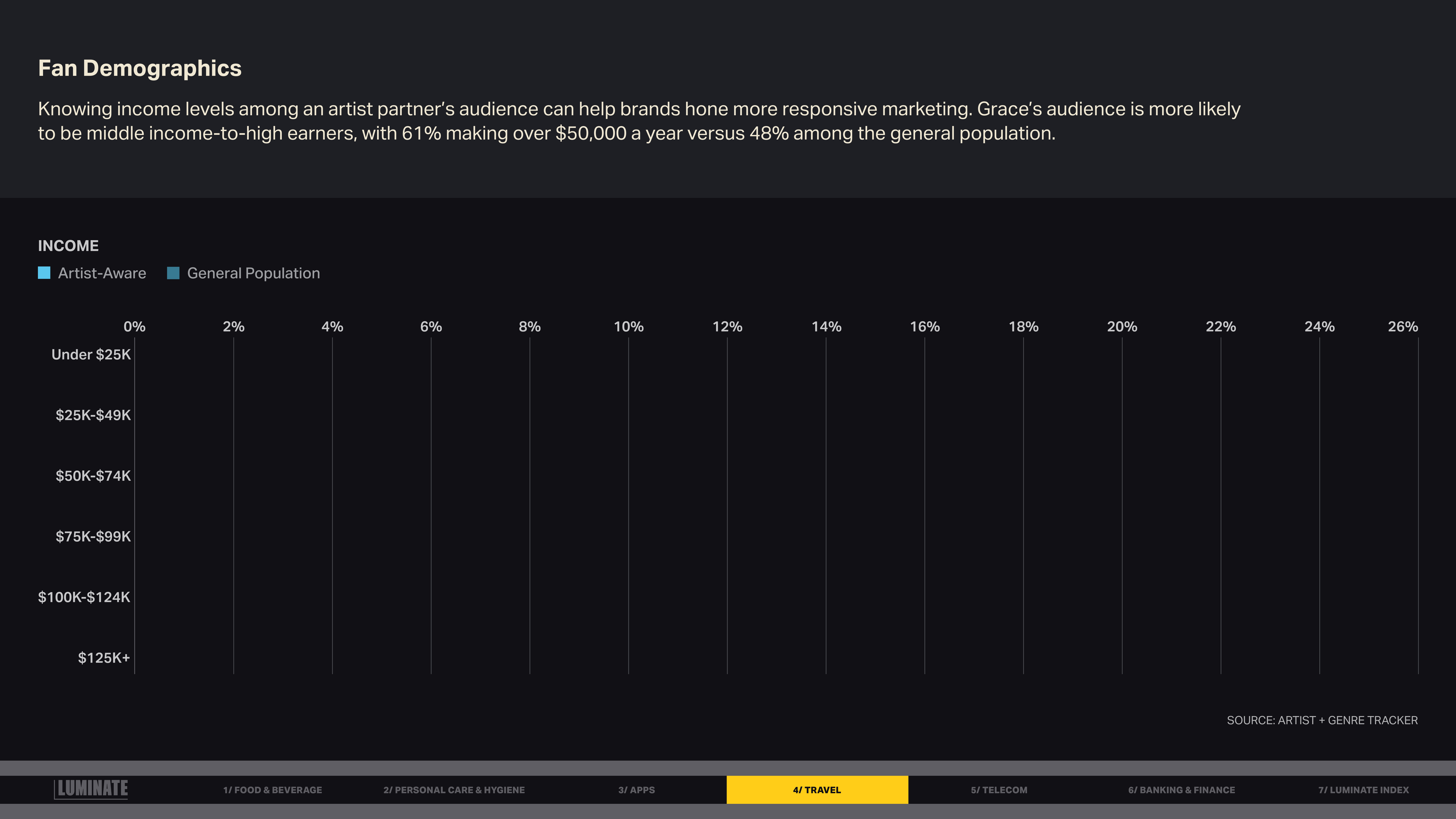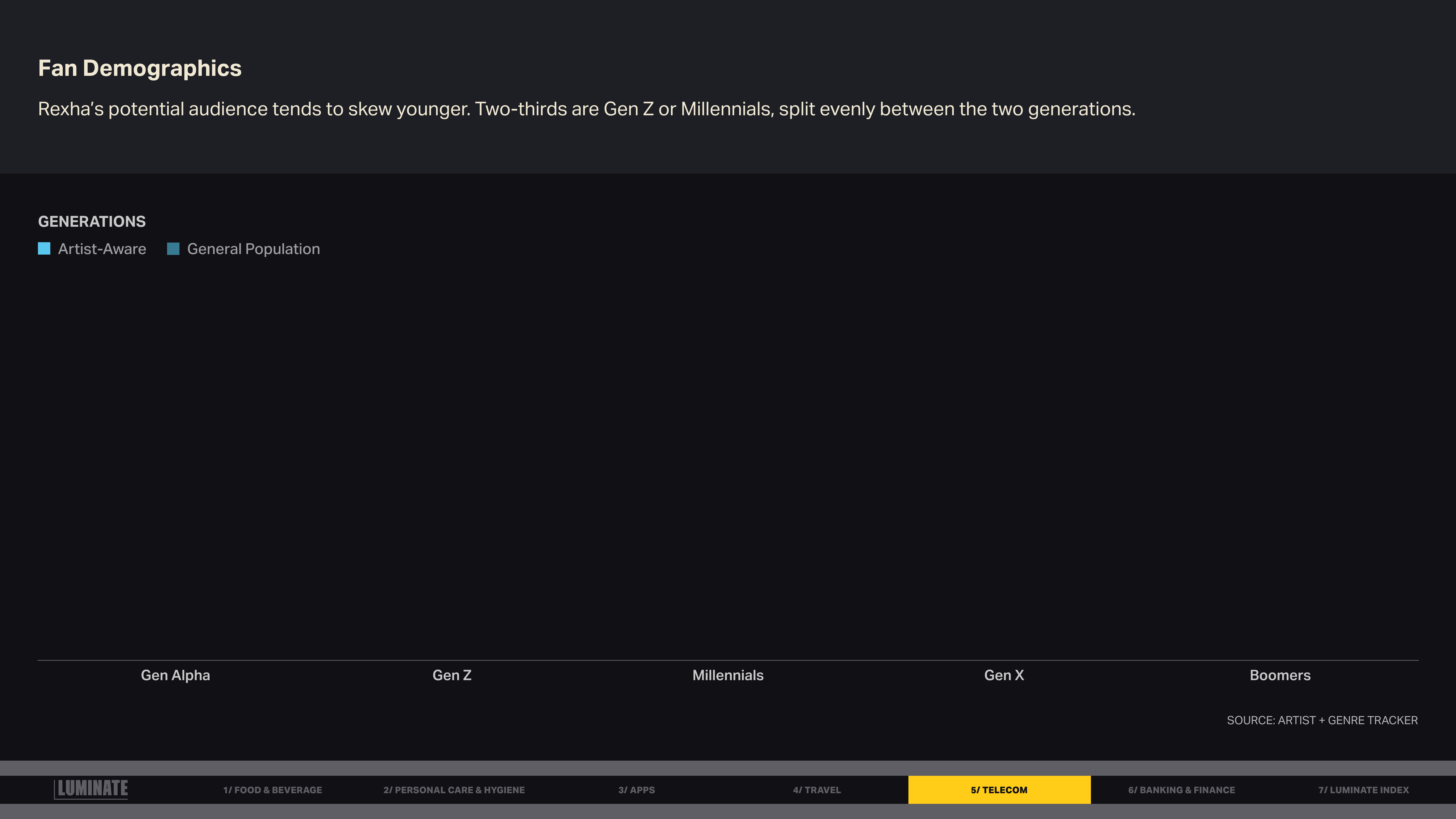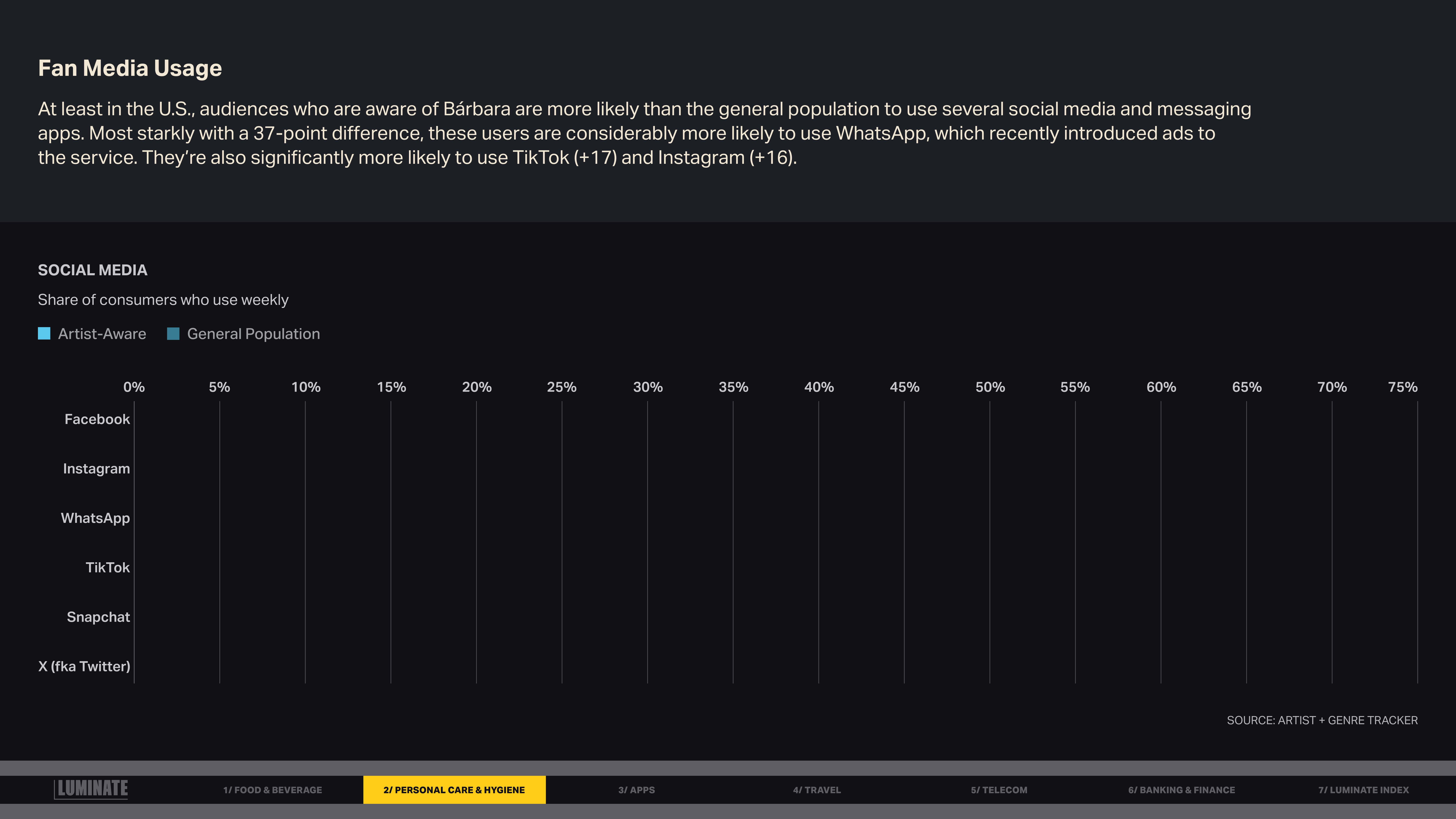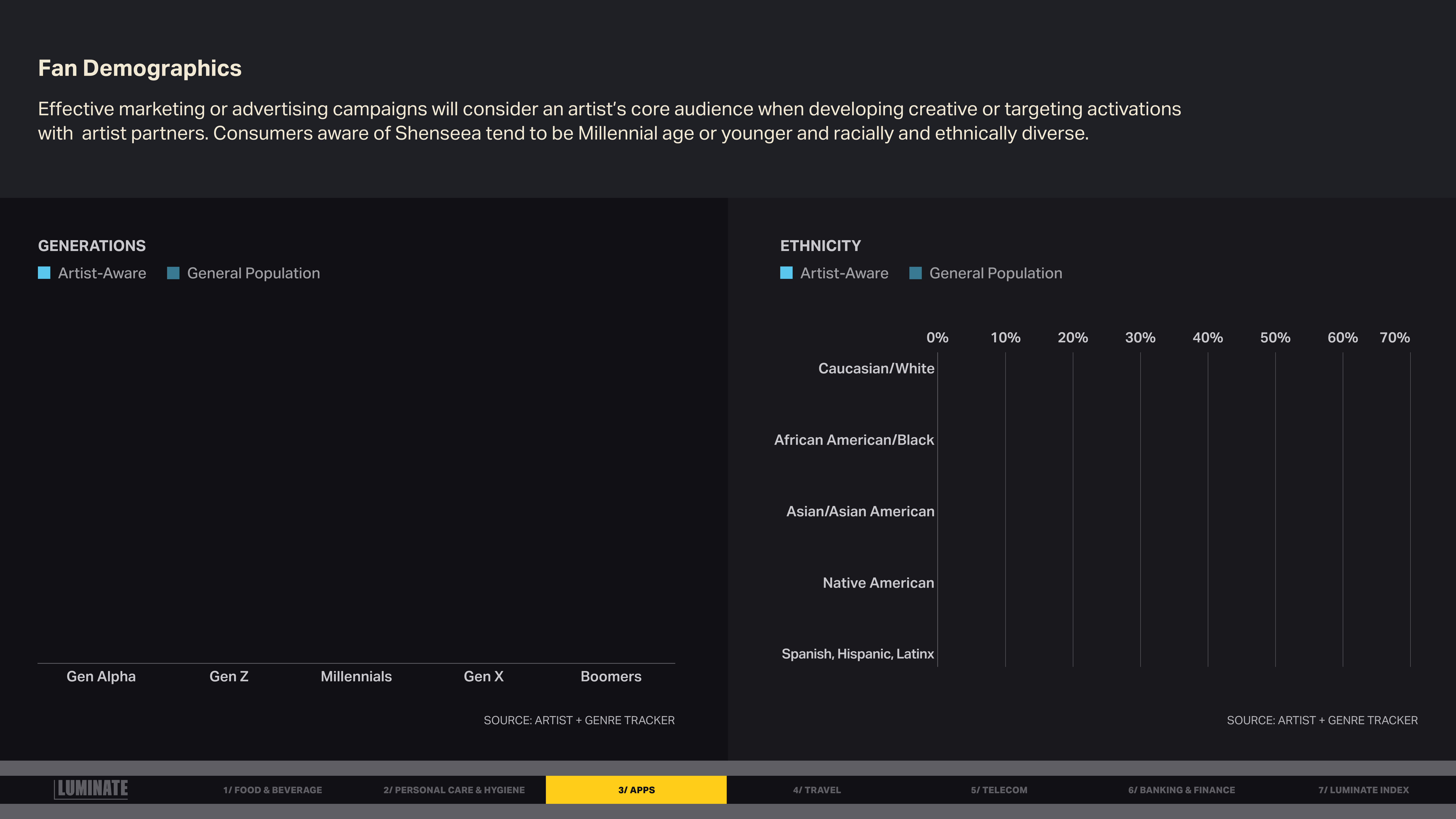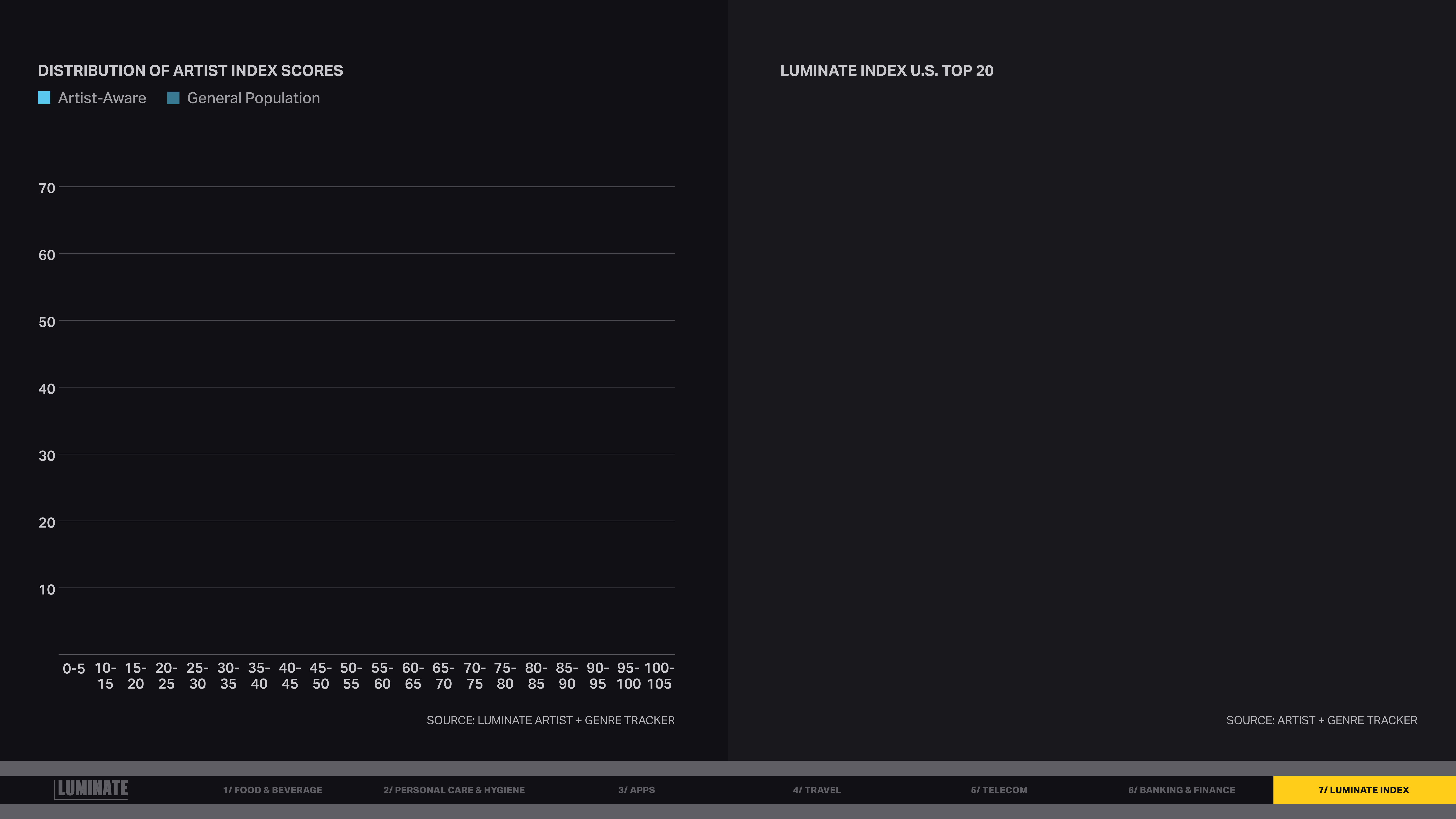 The Luminate Artist + Genre Tracker is a best-in-class research tool to help the music industry and brands understand consumer attitudes and perceptions toward specific music artists and genres alongside evolving media usage and purchasing behaviors. Provided by Luminate Insights, the Artist + Genre Tracker provides U.S. consumer survey results and other performance metrics for over 600 artists and 100 genres or subgenres. Since September 2021, surveys are conducted quarterly online among U.S. consumers ages 13+, representative of the general population according to the U.S. Census on age, gender, ethnicity and region. The tool can help answer business questions: