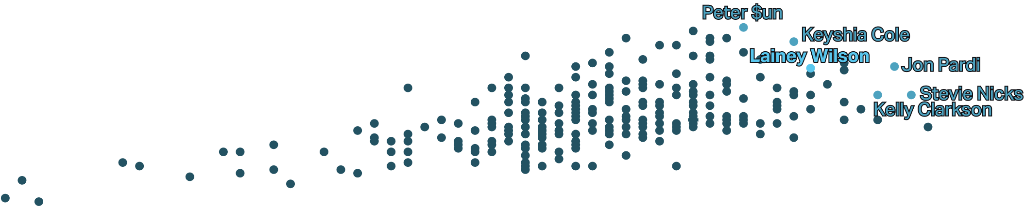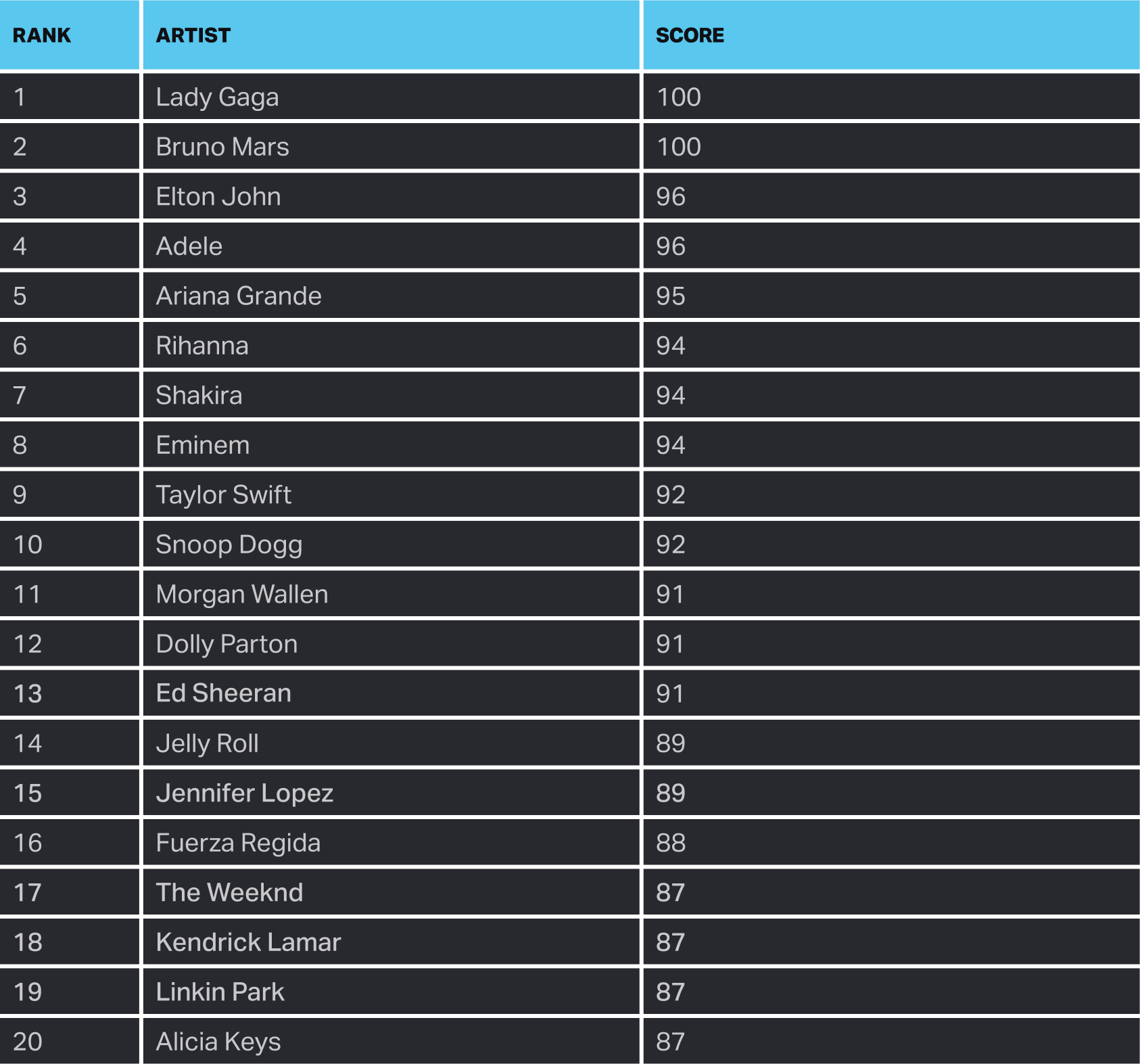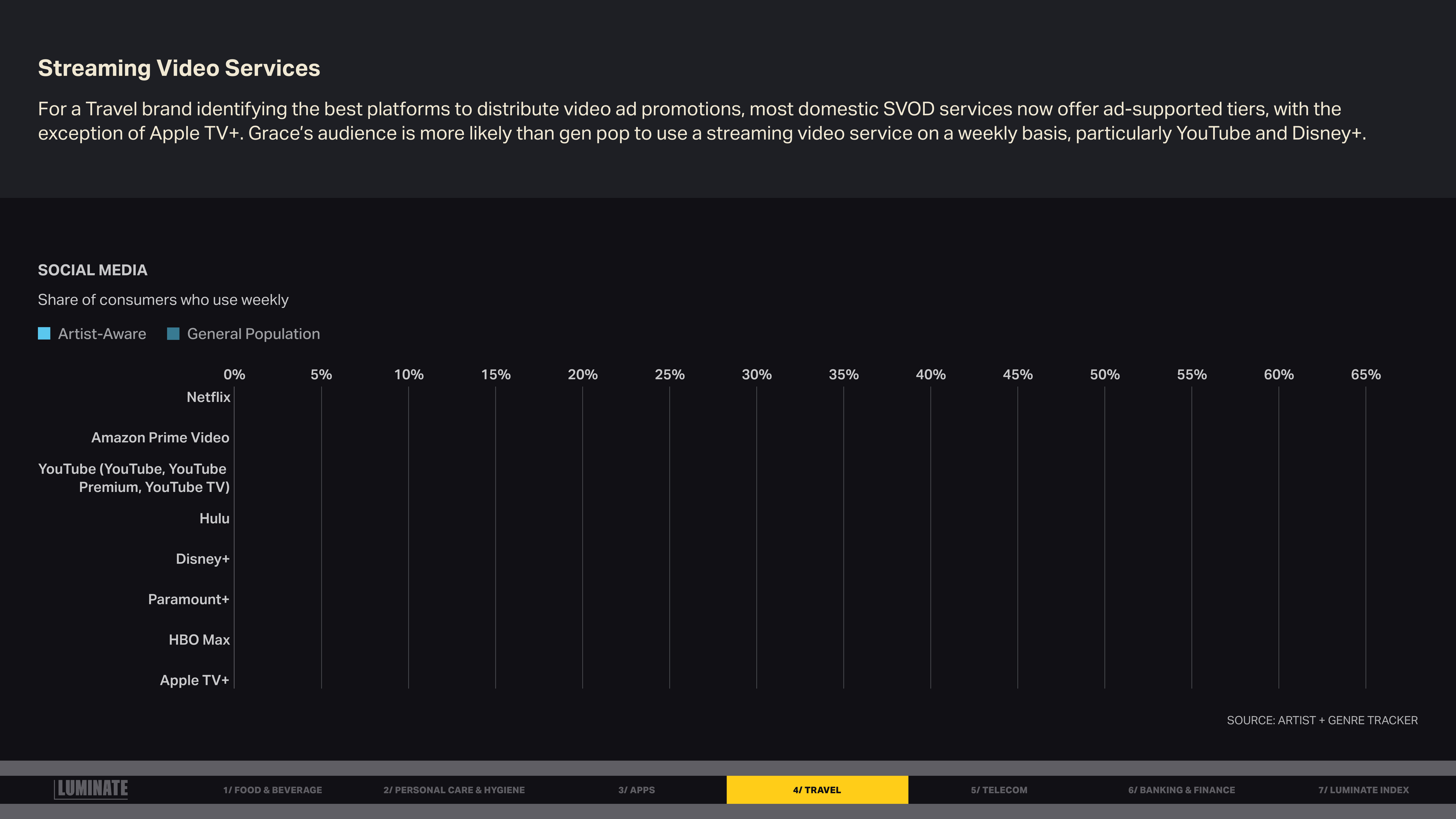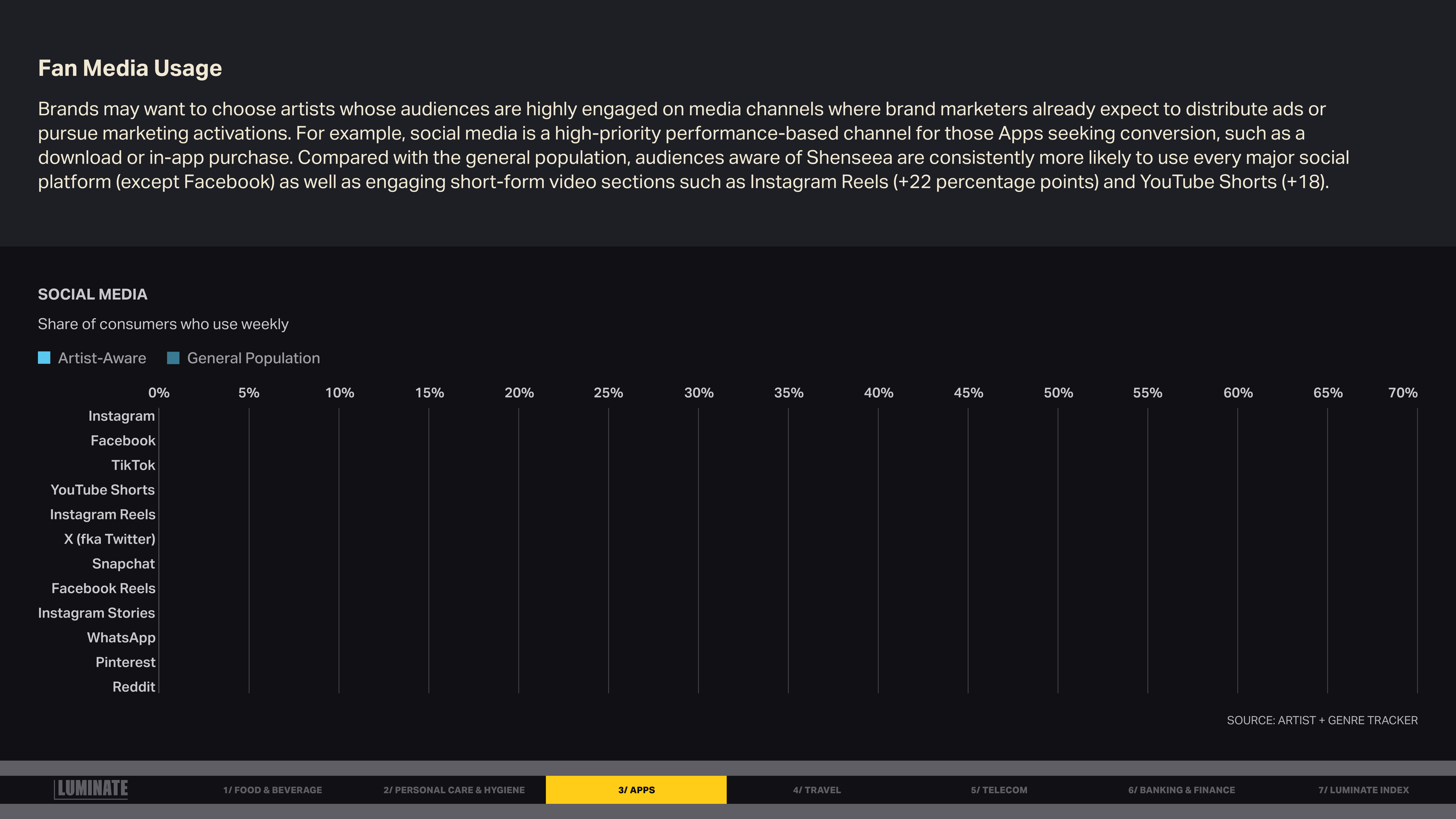 The Luminate Artist + Genre Tracker is a best-in-class research tool to help the music industry and brands understand consumer attitudes and perceptions toward specific music artists and genres alongside evolving media usage and purchasing behaviors. Provided by Luminate Insights, the Artist + Genre Tracker provides U.S. consumer survey results and other performance metrics for over 600 artists and 100 genres or subgenres. Since September 2021, surveys are conducted quarterly online among U.S. consumers ages 13+, representative of the general population according to the U.S. Census on age, gender, ethnicity and region. The tool can help answer business questions: