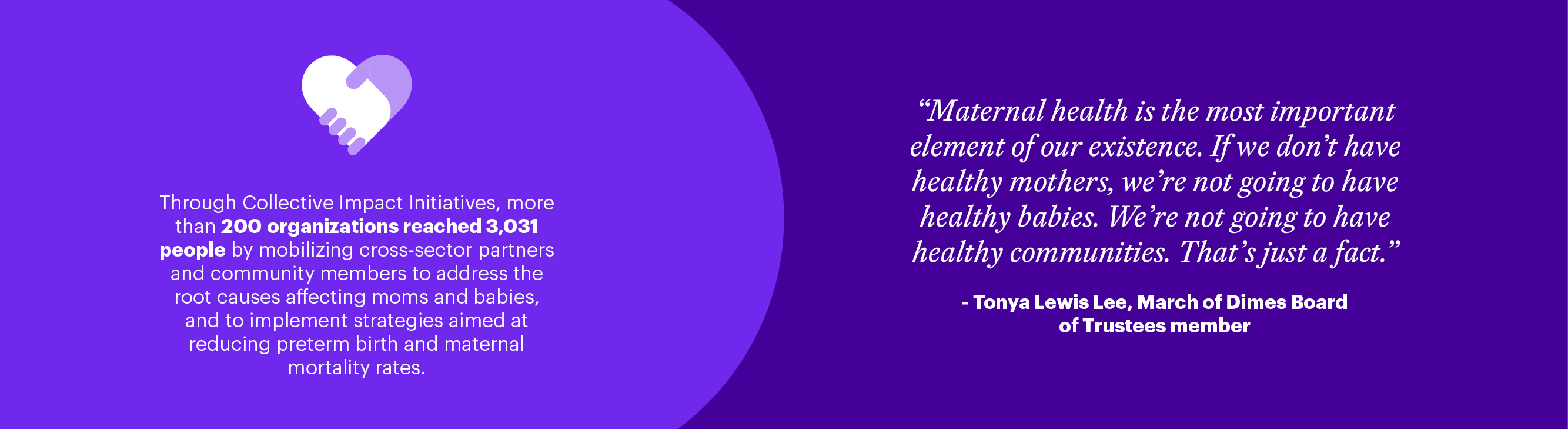 Together, we worked toward our goal to end preventable maternal health risks and death, end preterm birth, and close the health equity gap for healthy moms and strong babies. We were wherever families needed us—in their communities with programs and fundraisers, on their digital devices sharing the latest info, and rallying everyone along the way on the grassroots and corporate level.