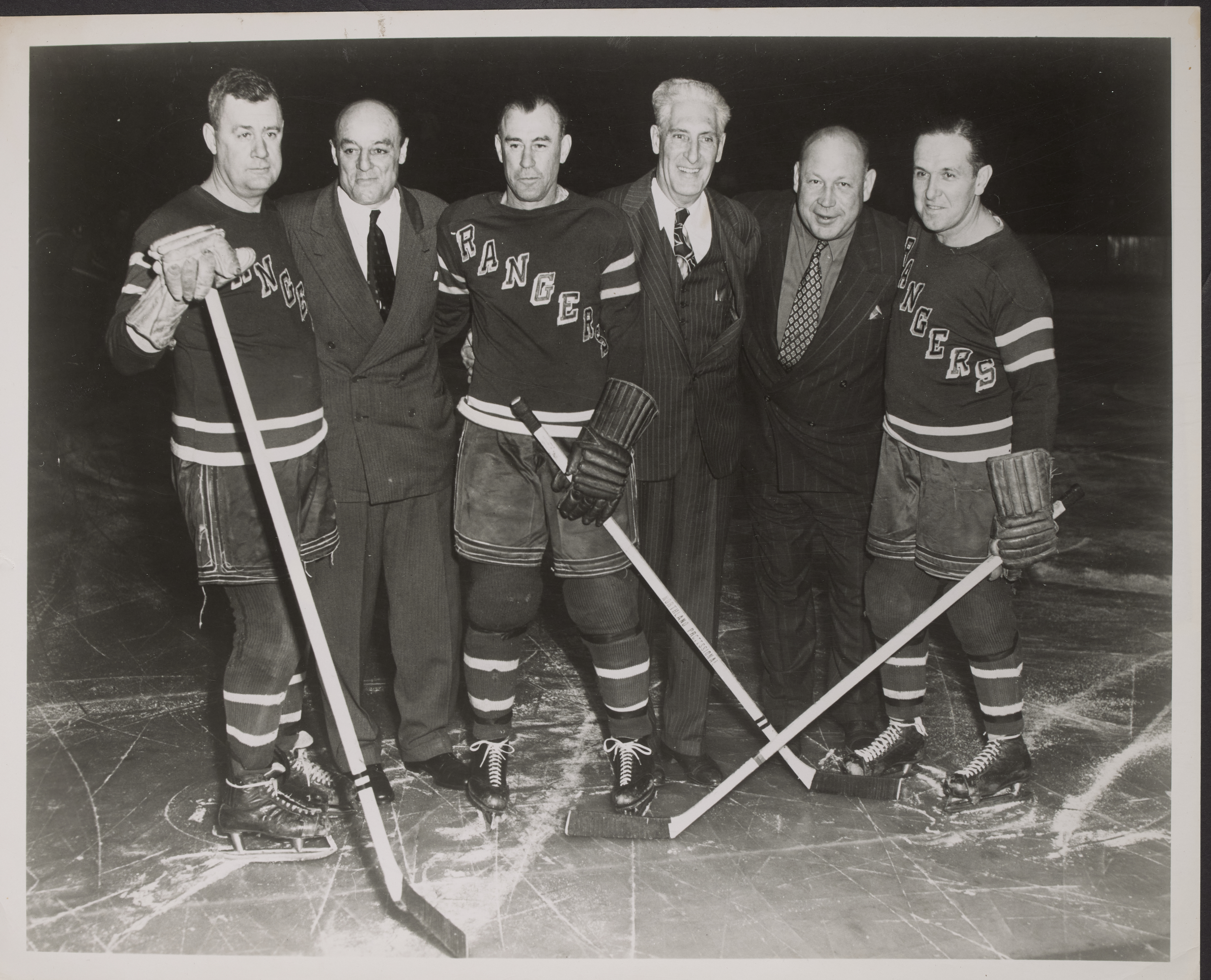 Patrick and the first starting lineup in Rangers history. From left to right, it’s Fred “Bun” Cook, Ivan “Ching” Johnson, Bill Cook, Lester Patrick, Clarence “Taffy” Abel, and Frank Boucher The night we honored Lester Patrick, 1947.