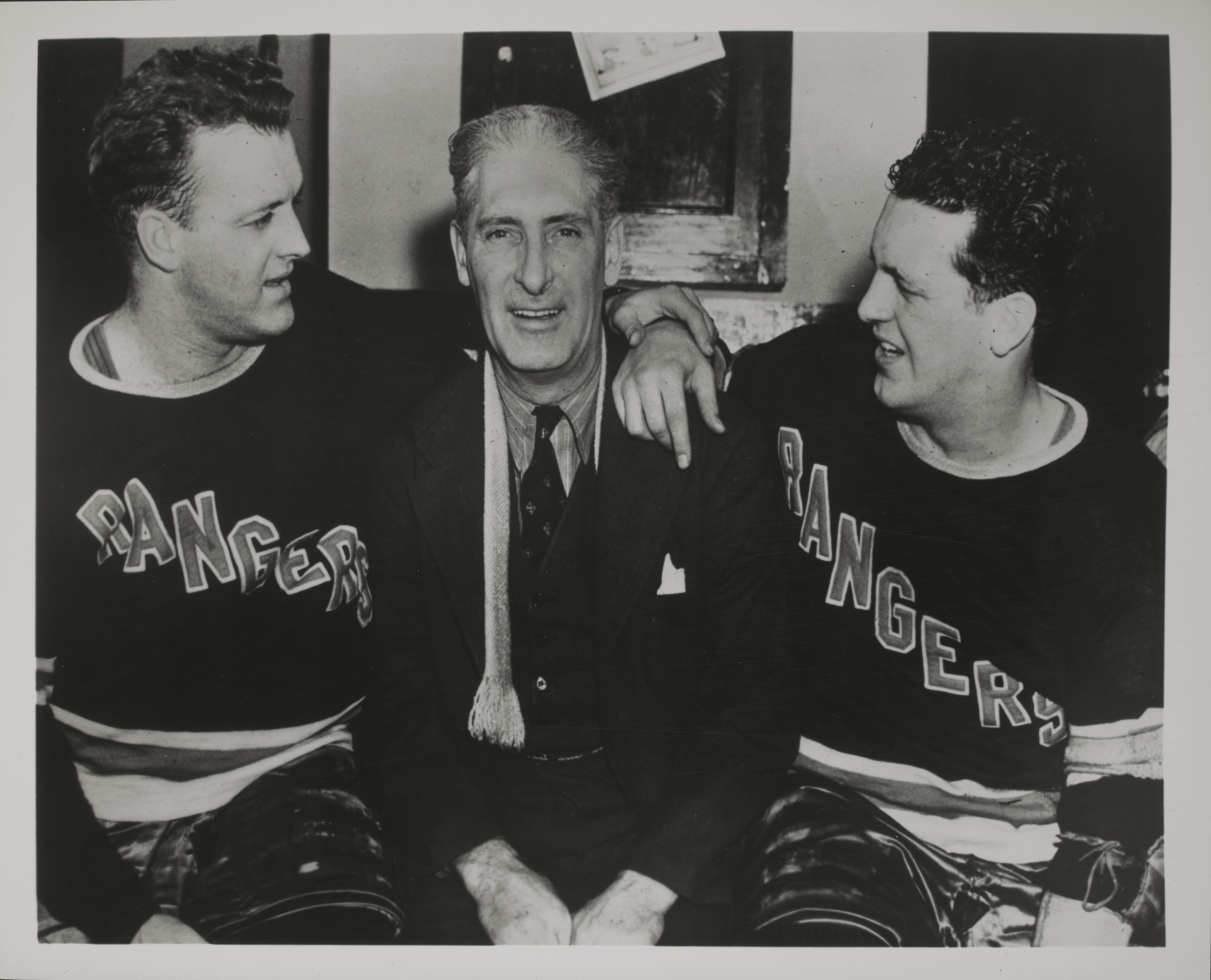 Group photograph of Lester Patrick (center) with sons Lynn Patrick (left) and Muzz Patrick (right).