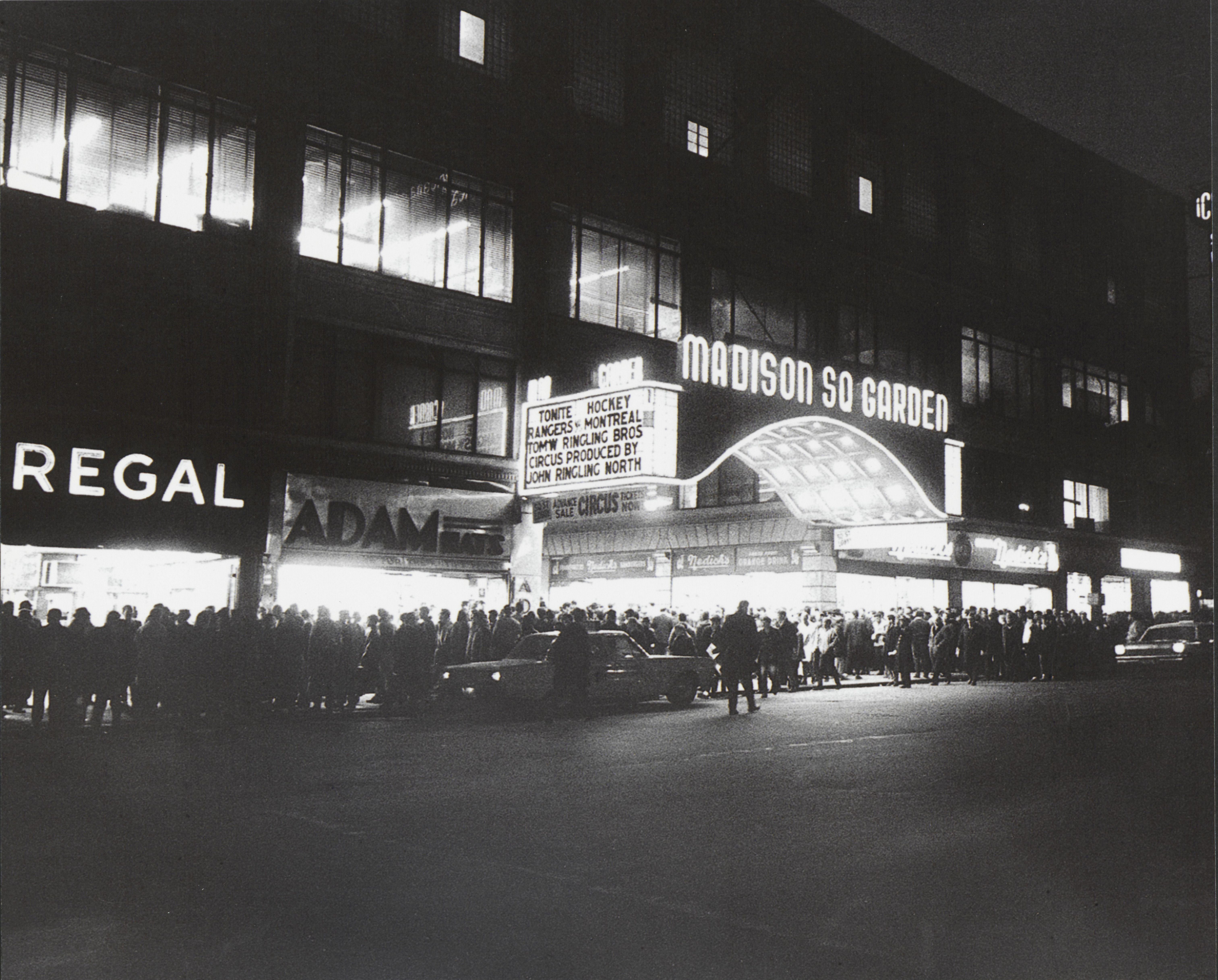 Print photograph of a crowd entering the Madison Square Garden III arena (1925-1968) for a Rangers game.