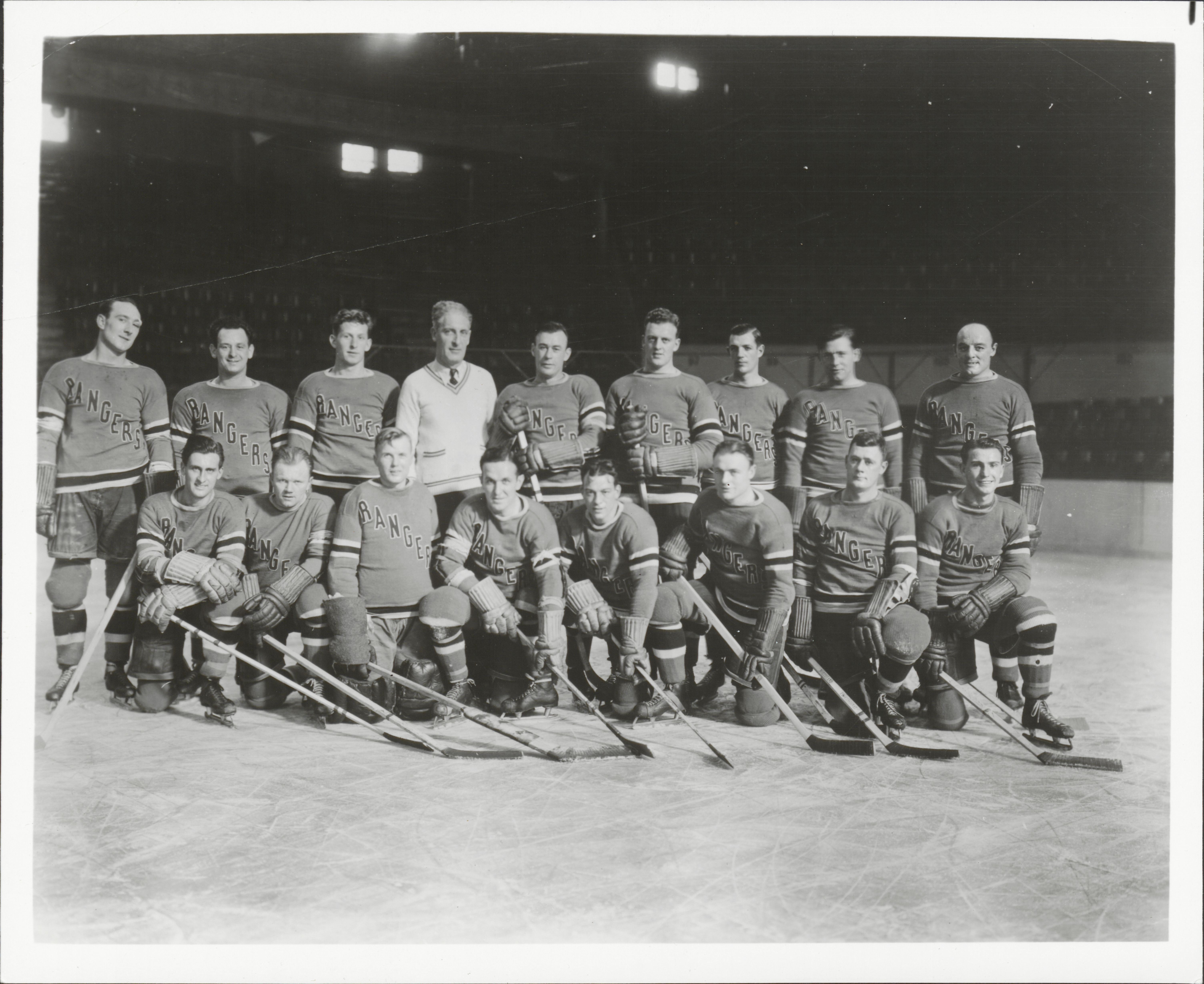 Bill Cook (middle of second row) was captain of the Rangers for 11 seasons, more than any other player in franchise history. He poses here in the team photo for 1934-35, the ninth of his 11 seasons with the Blueshirts.