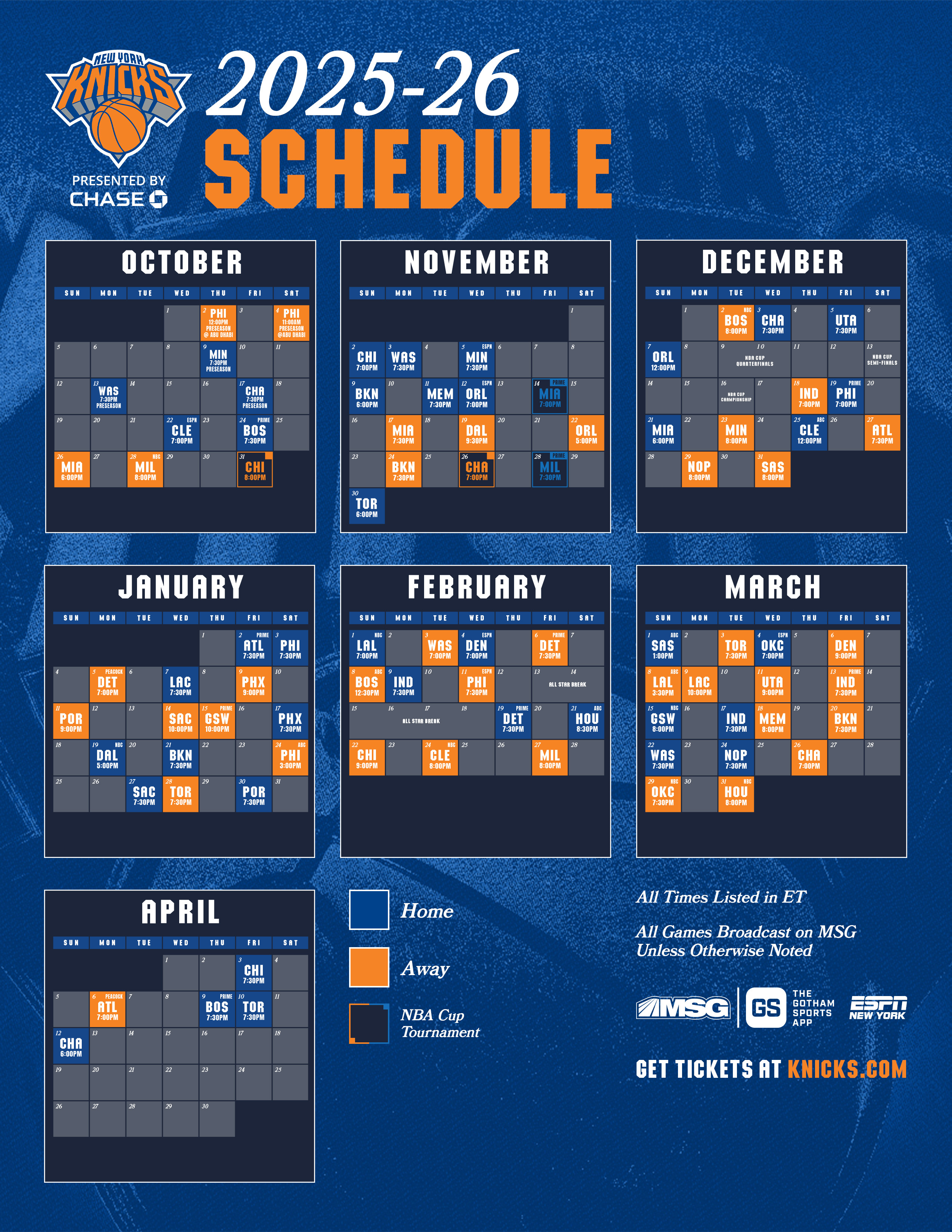 The Knicks 2025-26 schedule is here! Check it out, circle the games you want to experience, and we'll see you at The Garden for another unforgettable season of Knicks basketball.