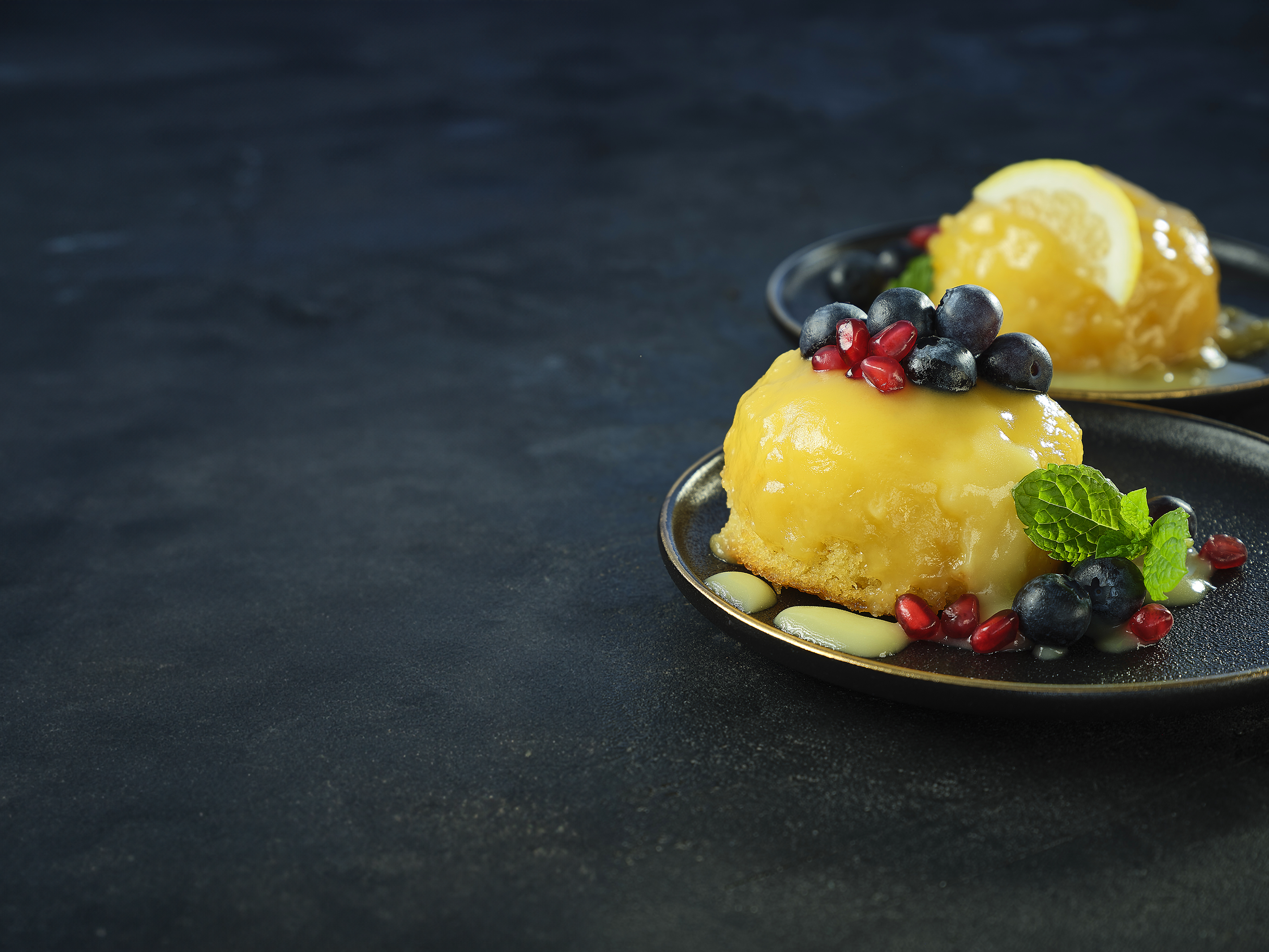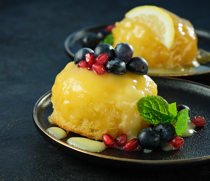 Simply Better All Butter Lemon Sponge Puddings baked with a layer of luscious lemon curd served with blueberries, pomegranate and mint