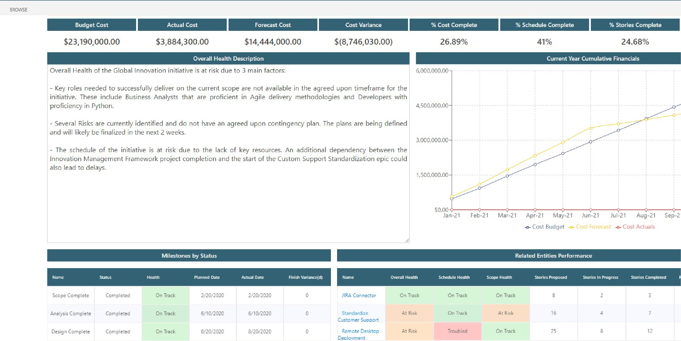 Monitor and evaluate crucial performance indicators spanning Strategic objectives, Financial outcomes, Value creation, Resource utilization, and Project execution in real-time.