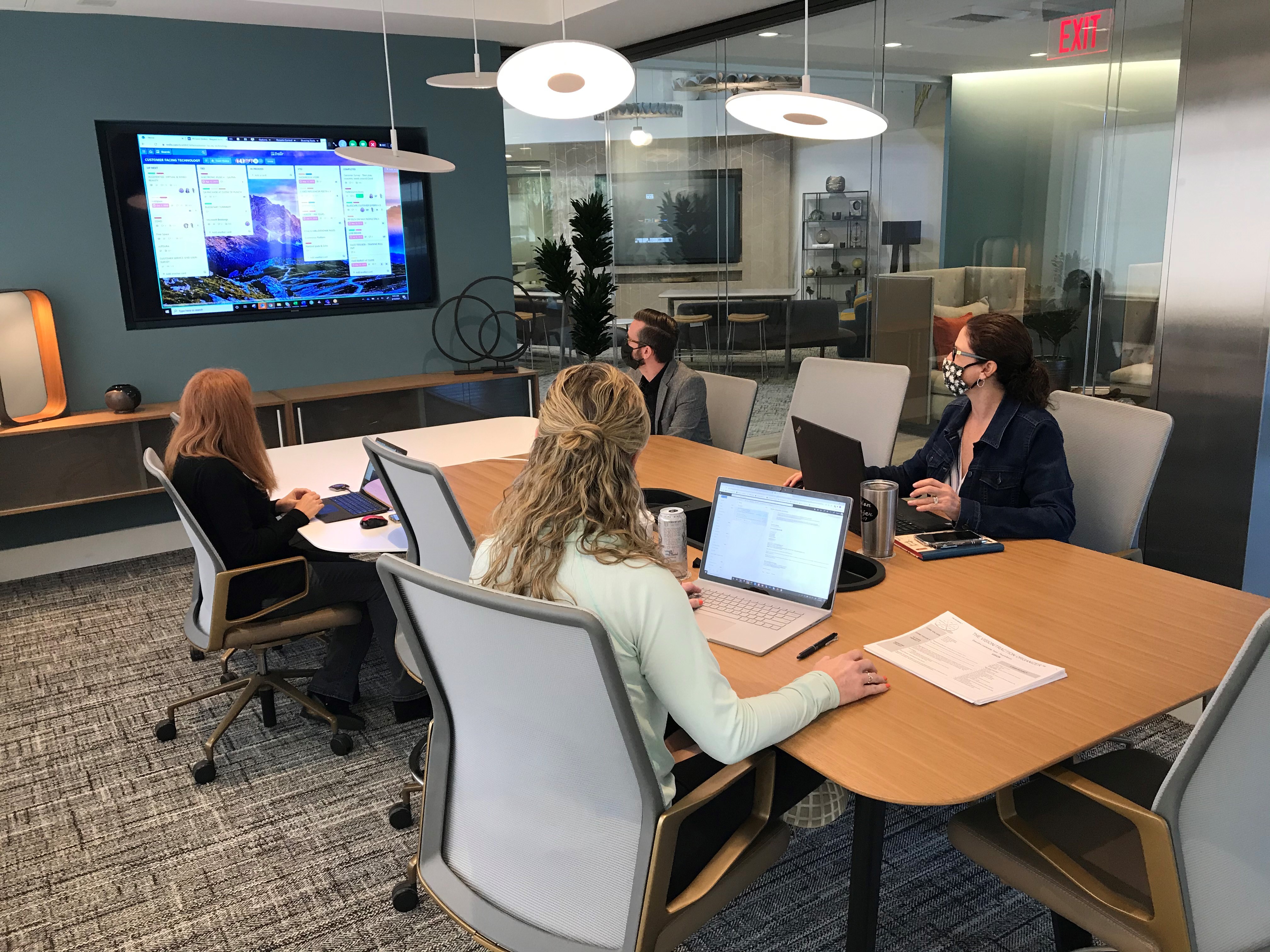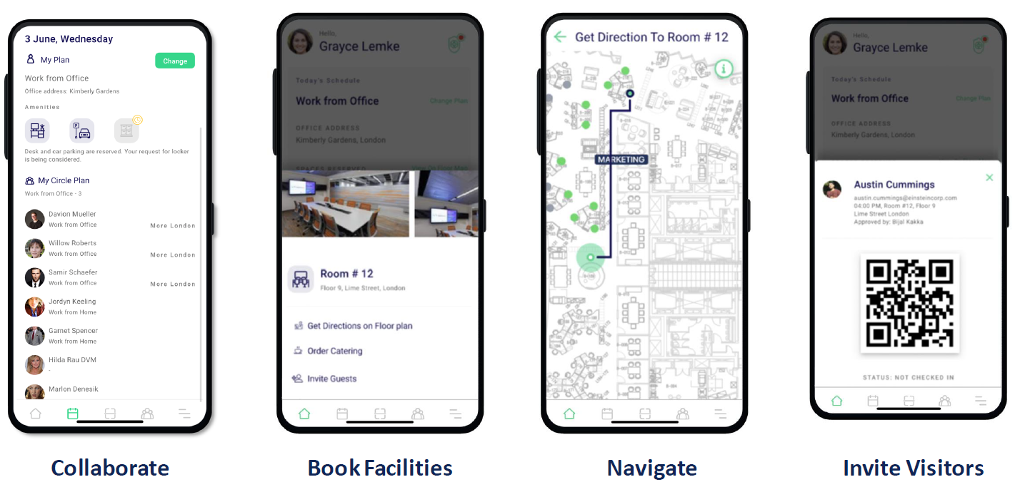 Team members use the Return to Workspace App to reserve a socially distanced desk or room at their preferred location ahead of the date of travel