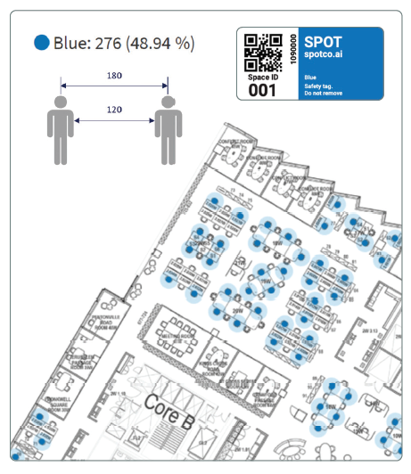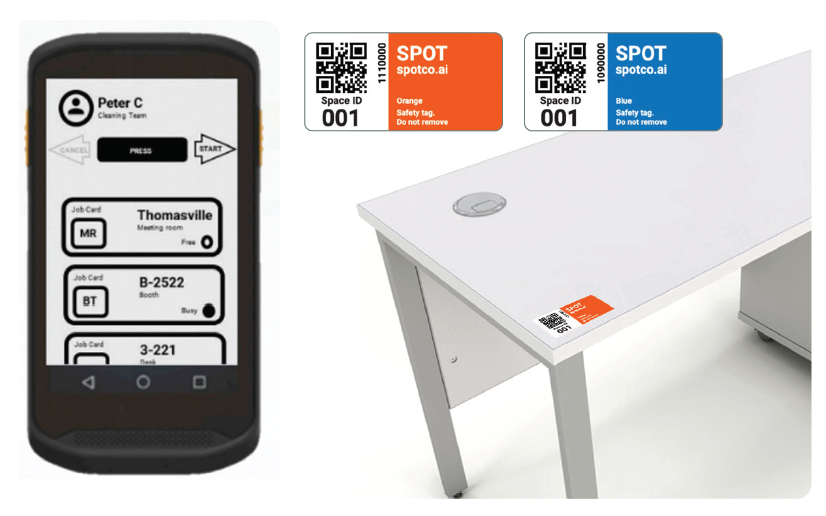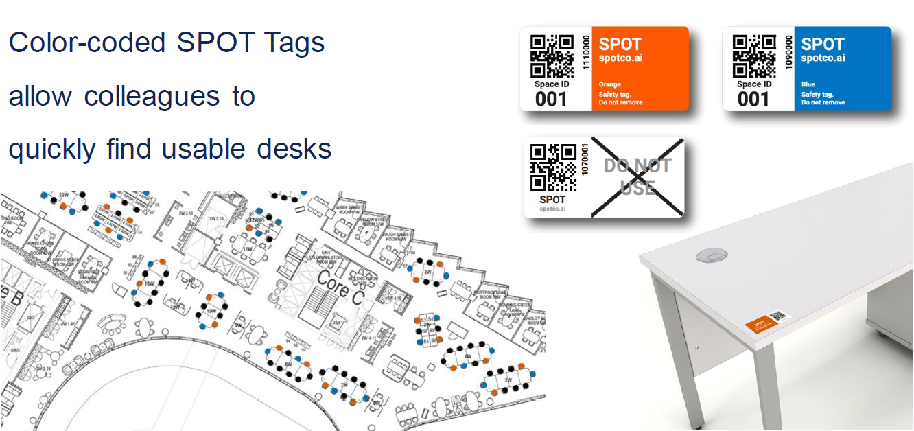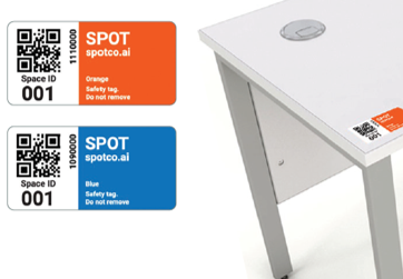 Desks are labeled using color coded QR SPOT Tags and are allocated the day before to ensure the right number of socially distanced spaces are cleaned and available