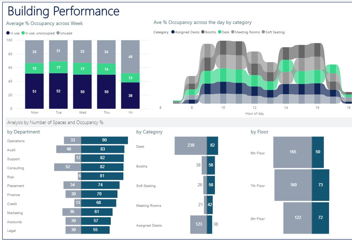 Full workspace reporting and analytics dashboard (usage by day, floor, department, category or more)