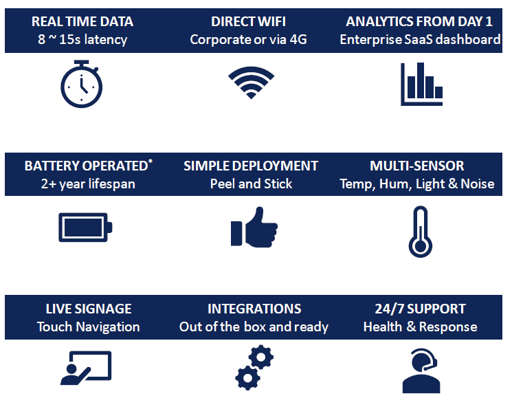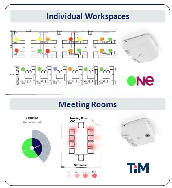 Sensors placed in common areas, meeting rooms, washrooms and under desks trigger alerts after workspaces are used