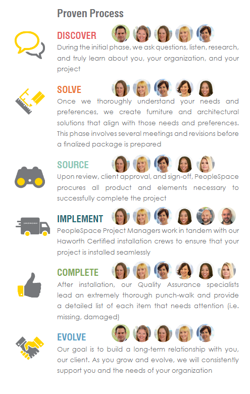 PeopleSpace works with you and your design partners to engineer a space that aligns with your business goals and actualizes the culture you want to create. We use analytical tools rooted in the latest research and recommend the right layout, furniture, fabrics, and accessories to achieve your vision. Our ability to provide unparalleled product sourcing services results from our access to a long list of suppliers and a long history of nurturing relationships within the industry. We do this through the Discover and Source phase of our Proven Process.