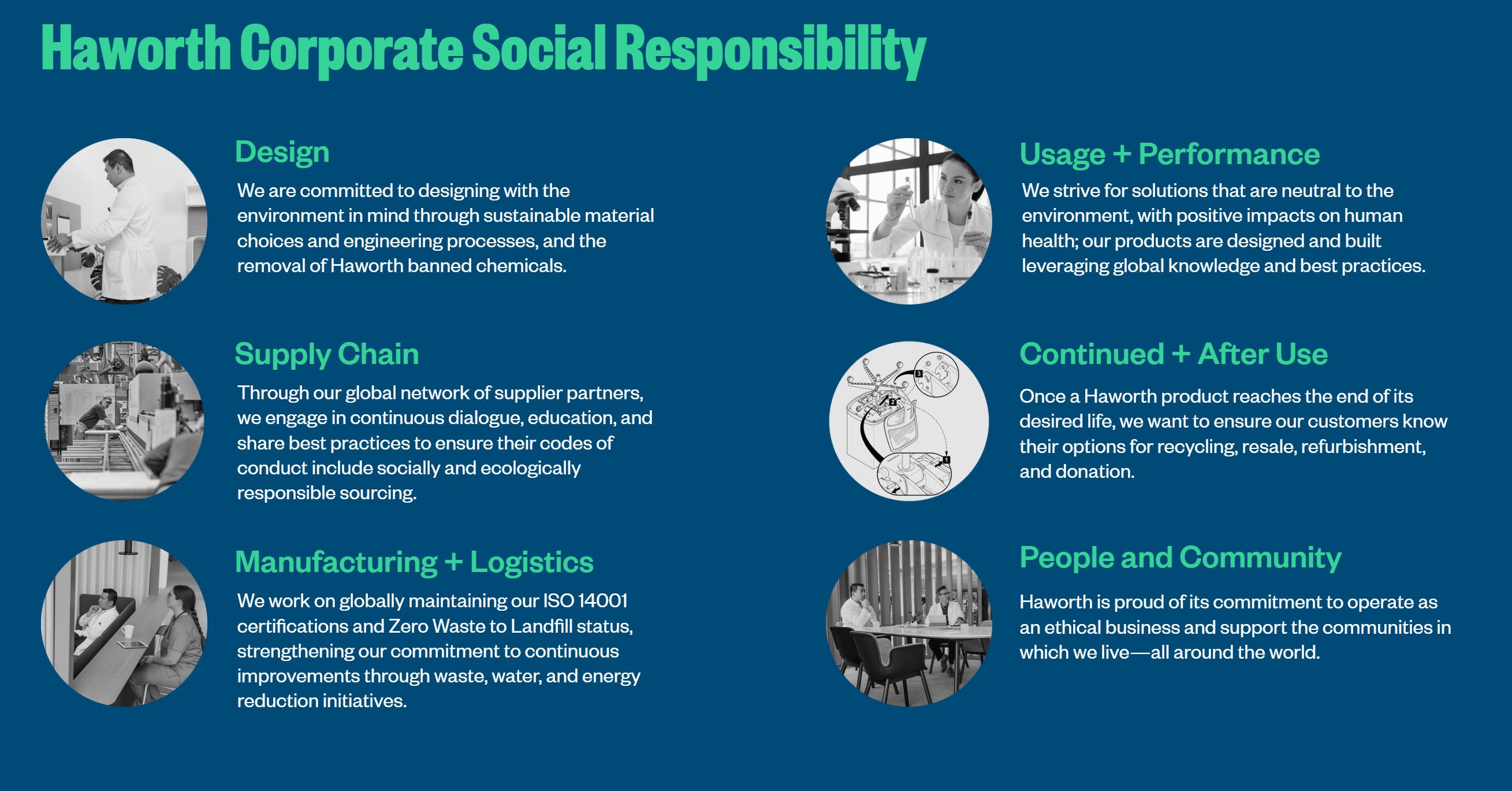 Haworth remains dedicated to maintaining the highest environmental standards in the market and will continue to be transparent in its efforts and progress reporting on its material transparency efforts. Complying with applicable legal requirements on chemicals, such as REACH, is a matter of course and is considered as minimum standard for all Haworth's operations. Haworth is working diligently toward reducing potentially hazardous chemicals beyond regulatory restrictions assosciated with its parts and materials.
