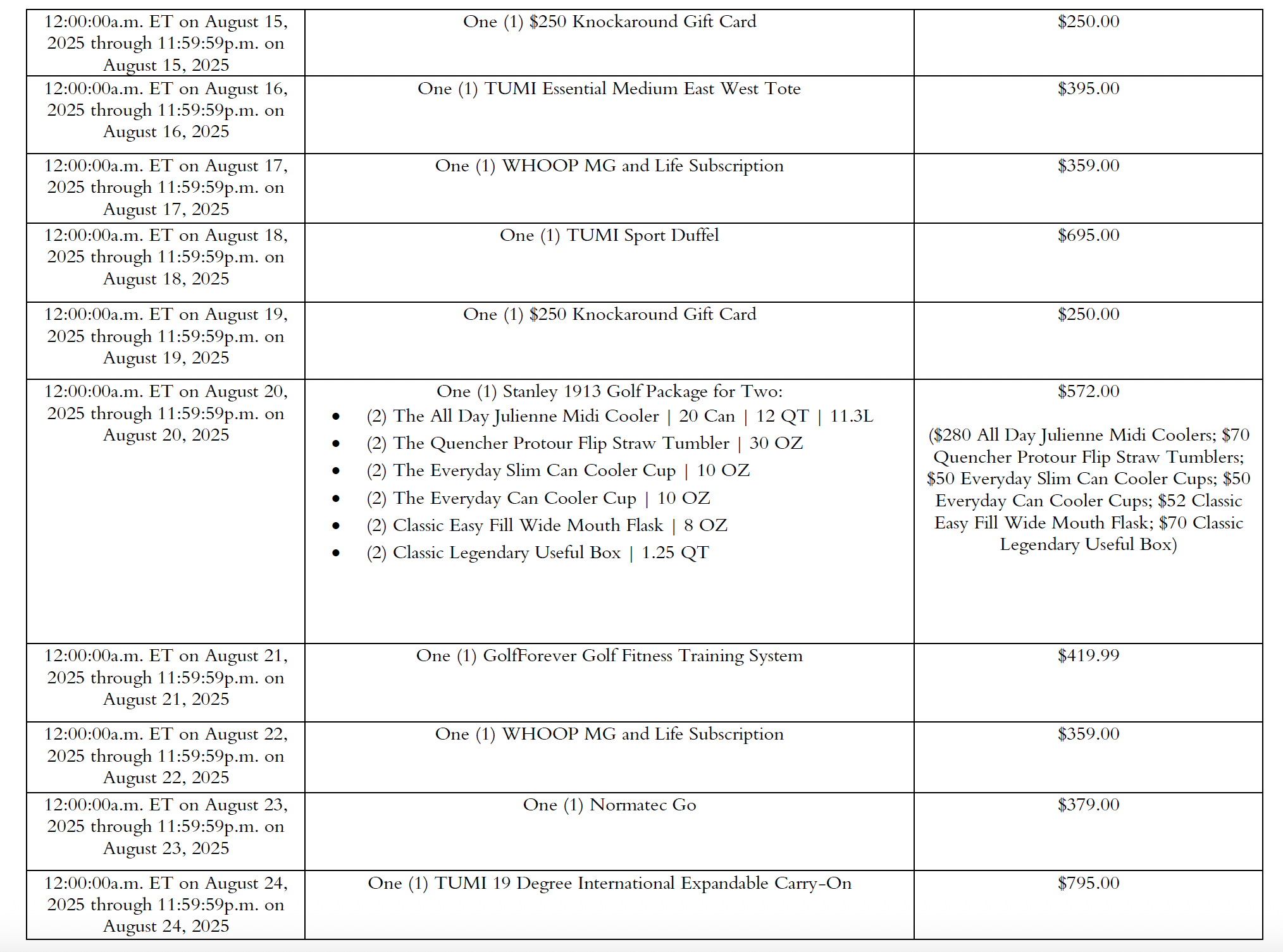 OVERVIEW. This promotion consists of twenty-one (21) individual sweepstakes (each an “Individual Promotion”). The sweepstakes will each take place over a twenty-four (24) hour entry period between August 4, 2025 and August 24, 2025. There will be an Individual Promotion that takes place on each of August 4, 2025; August 5, 2025; August 6, 2025; August 7, 2025; August 8, 2025; August 9, 2025; August 10, 2025; August 11, 2025; August 12, 2025; August 13, 2025; August 14, 2025; August 15, 2025; August 16, 2025; August 17, 2025; August 18, 2025; August 19, 2025; August 20, 2025; August 21, 2025; August 22, 2025; August 23, 2025; August 24, 2025 (each an “Individual Promotional Period”). Following the conclusion of each Individual Promotional Period, Sponsor (as defined below) will conduct a random drawing to select one (1) winner for each Individual Promotion. Important additional details regarding each Individual Promotion (i.e., the Individual Promotional Period, prizing, and additional information relating to such Individual Promotion) is set forth the attached Exhibit A.