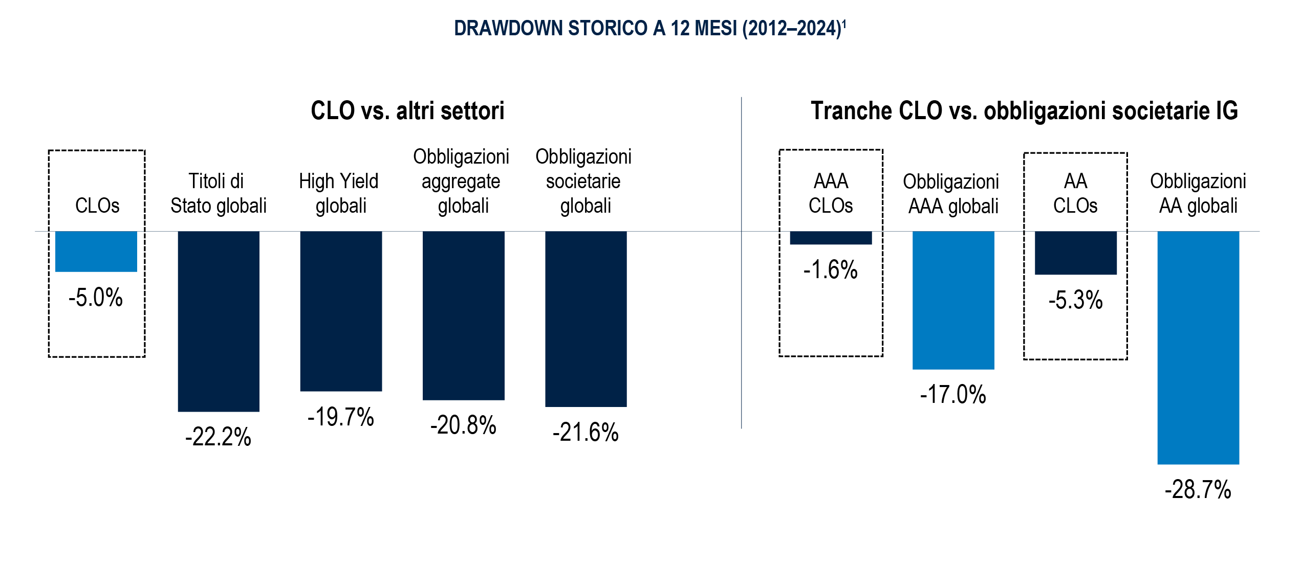 Fonte: Bloomberg e JP Morgan, al 30/09/2025. 1 La data di inizio comune più remota è il 30/12/2011. Tutti gli indici sono non gestiti. Non è possibile investire direttamente in un indice. CLOs: JPM CLOIE Index; Indice Global Agg Bond: Bloomberg BBG Global Aggregate Bond Index; Titoli di Stato Globali: Bloomberg Global Treasury Index Obbligazioni Societarie IG: Bloomberg Global Corporate Investment Grade High Yield Globali: Bloomberg Global High Yield Index; CLO AAA: JPM CLOIE AAA Index CLO AA: JPM CLOIE AA; Index CLO A: JPM CLOIE A Index CLO BBB: JPM CLOIE BBB Index
