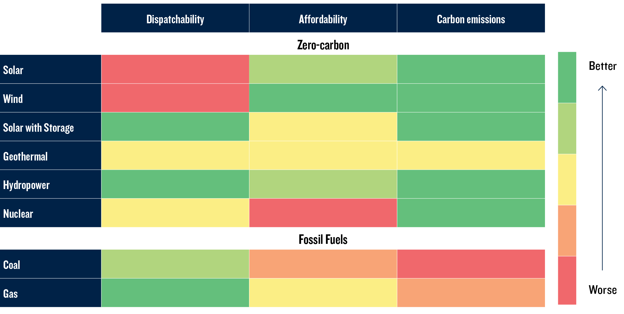 Note: Affordability is measured by the levelized cost of energy and carbon-emissions captures emissions per BTU.