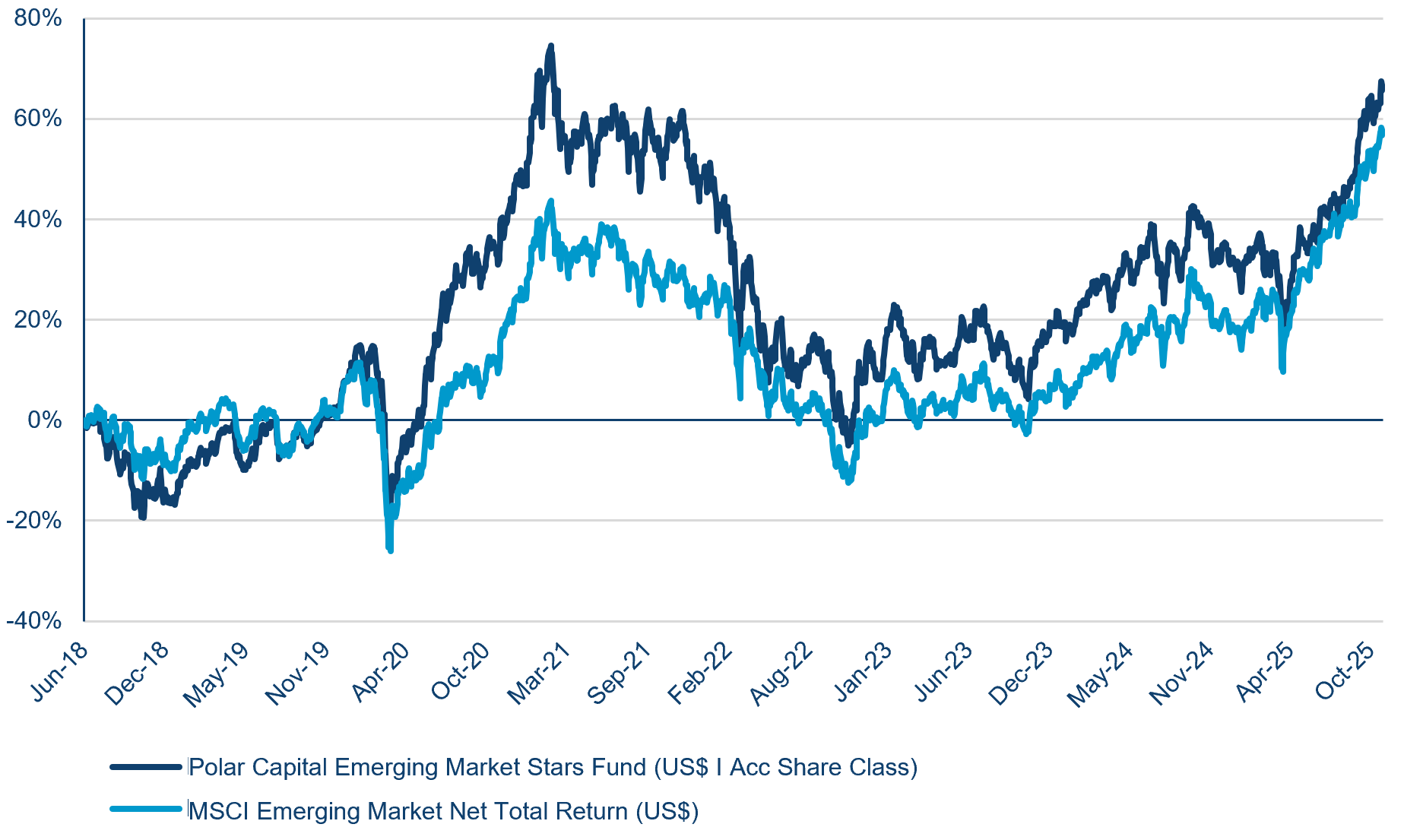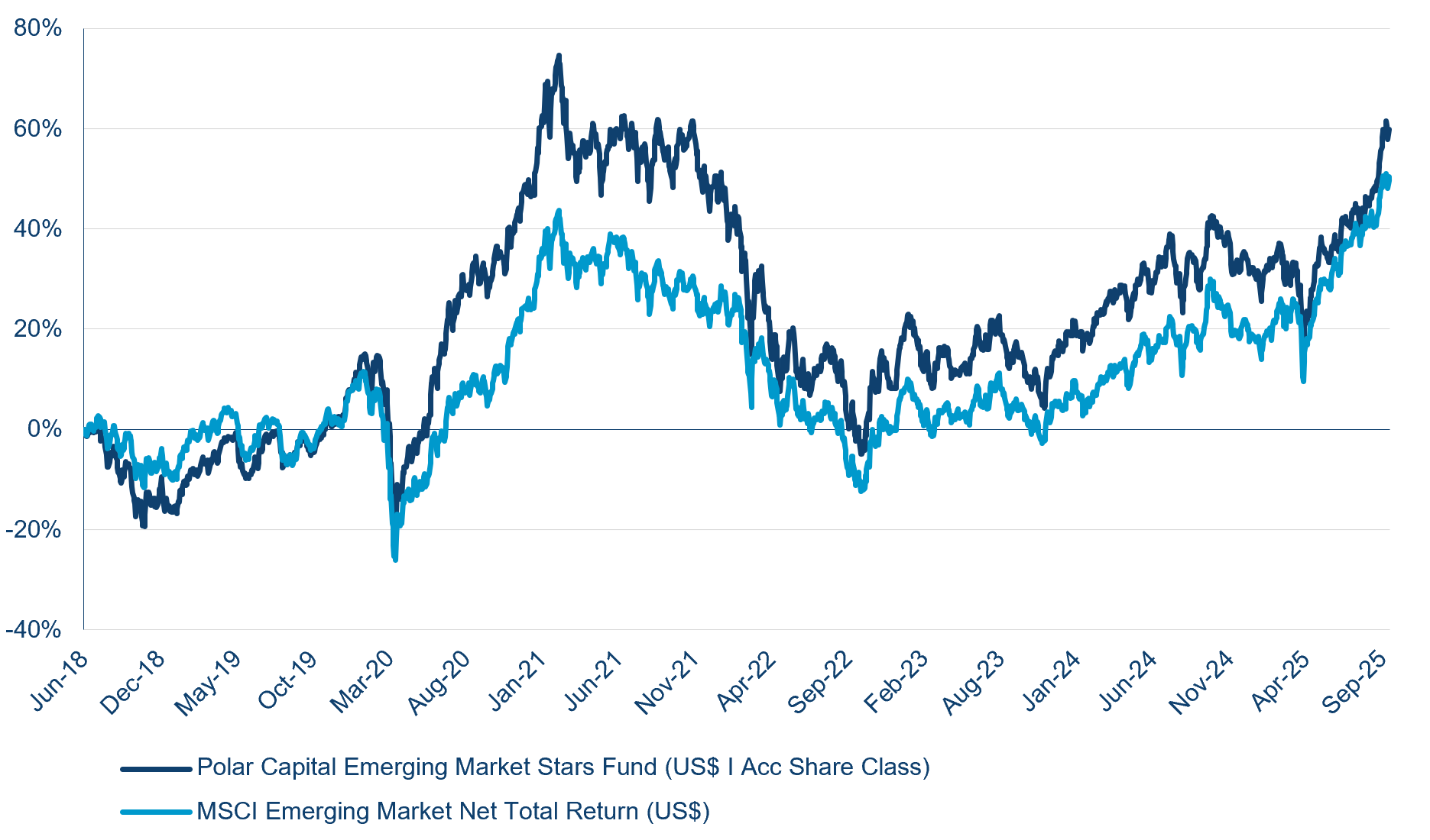 Past performance is not indicative or a guarantee of future returns. Source: Polar Capital, Bloomberg, US$ I Acc Share Class, 29 June 2018 to 30 September 2025. Net of fees. Benchmark: MSCI Emerging Markets Net Total Return Index (US$). The Fund was launched on 29 June 2018. Performance is shown Net of Fees. Totals may not sum due to rounding. Performance data takes account of fees paid by the fund but does not take account of any commissions or costs you may pay to third parties when subscribing for or redeeming shares or any taxes or securities account charges that you may pay on your investment in the fund. Such charges will reduce the performance of your investment. A 5% subscription fee can be charged at the Investment Managers discretion.