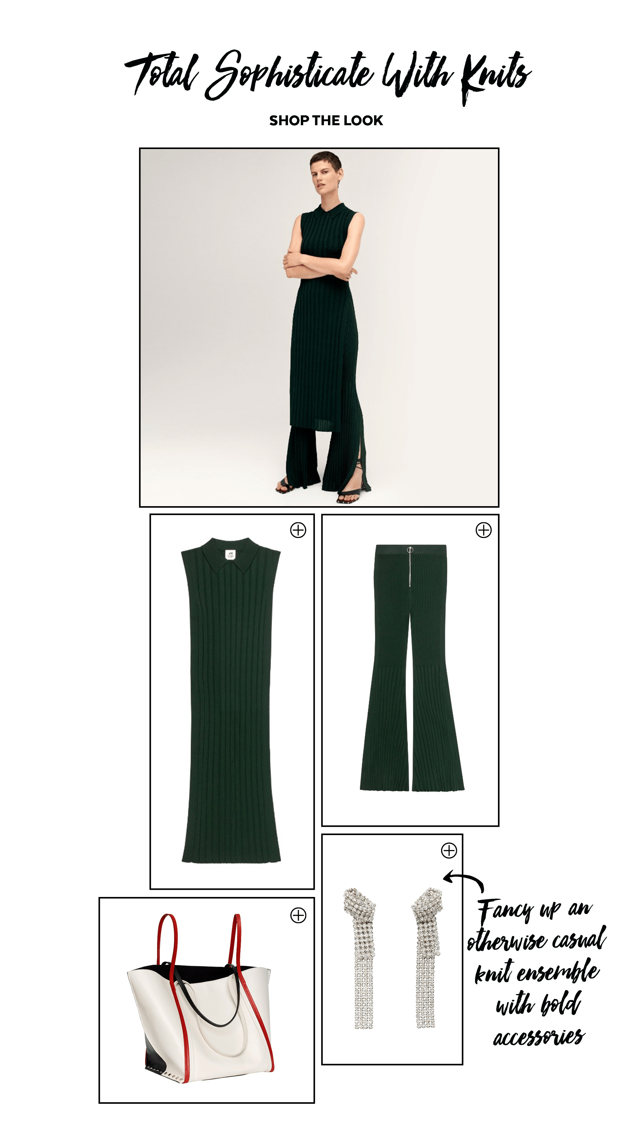 Hunter green pleated, flared knit trousers with dramatic side slit.