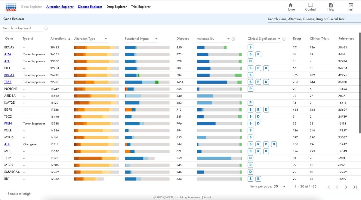 Easily view the alteration distribution for specific genes. When you hover over the data in Column B, a pop-up lists the alteration types (splicing, frameshift, etc.) by priority of distribution.