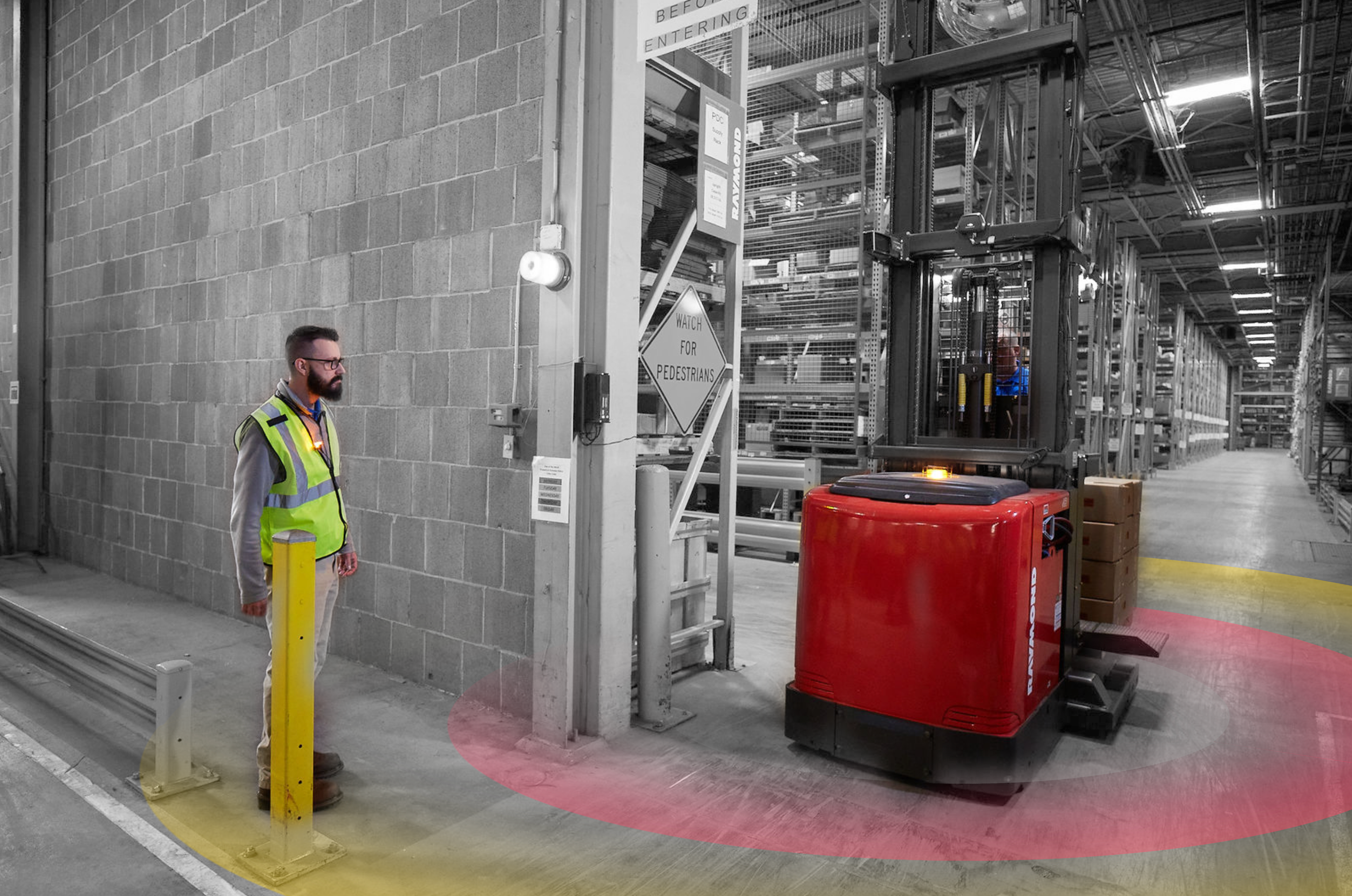 360-degree magnetic field technology detects and alerts operators to nearby: Pedestrians (equipped with notification devices), equipment, and facility structures.