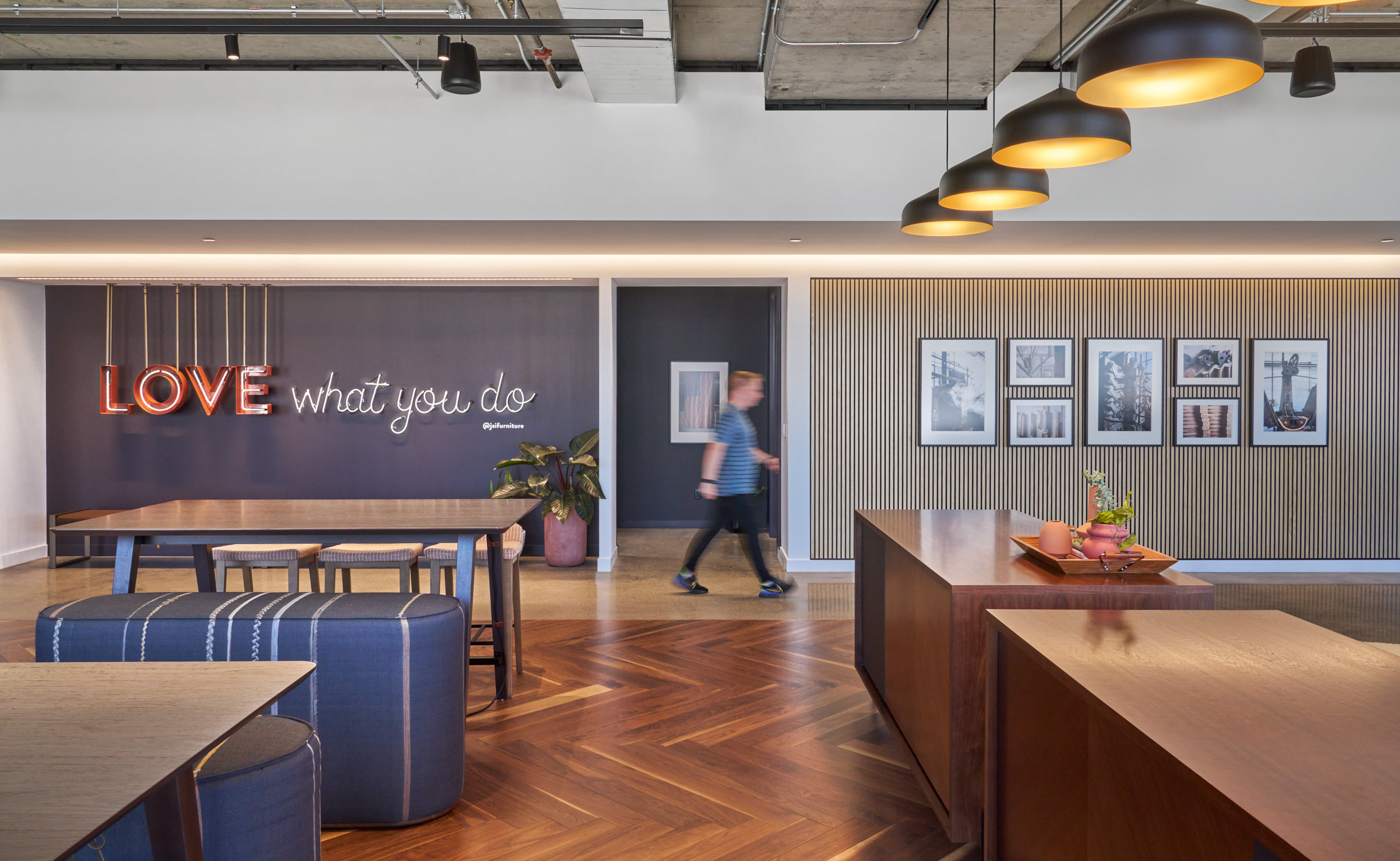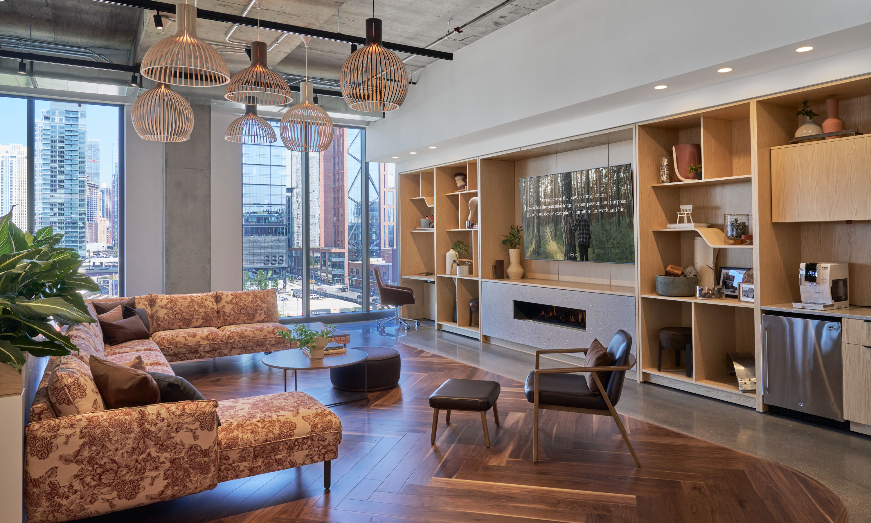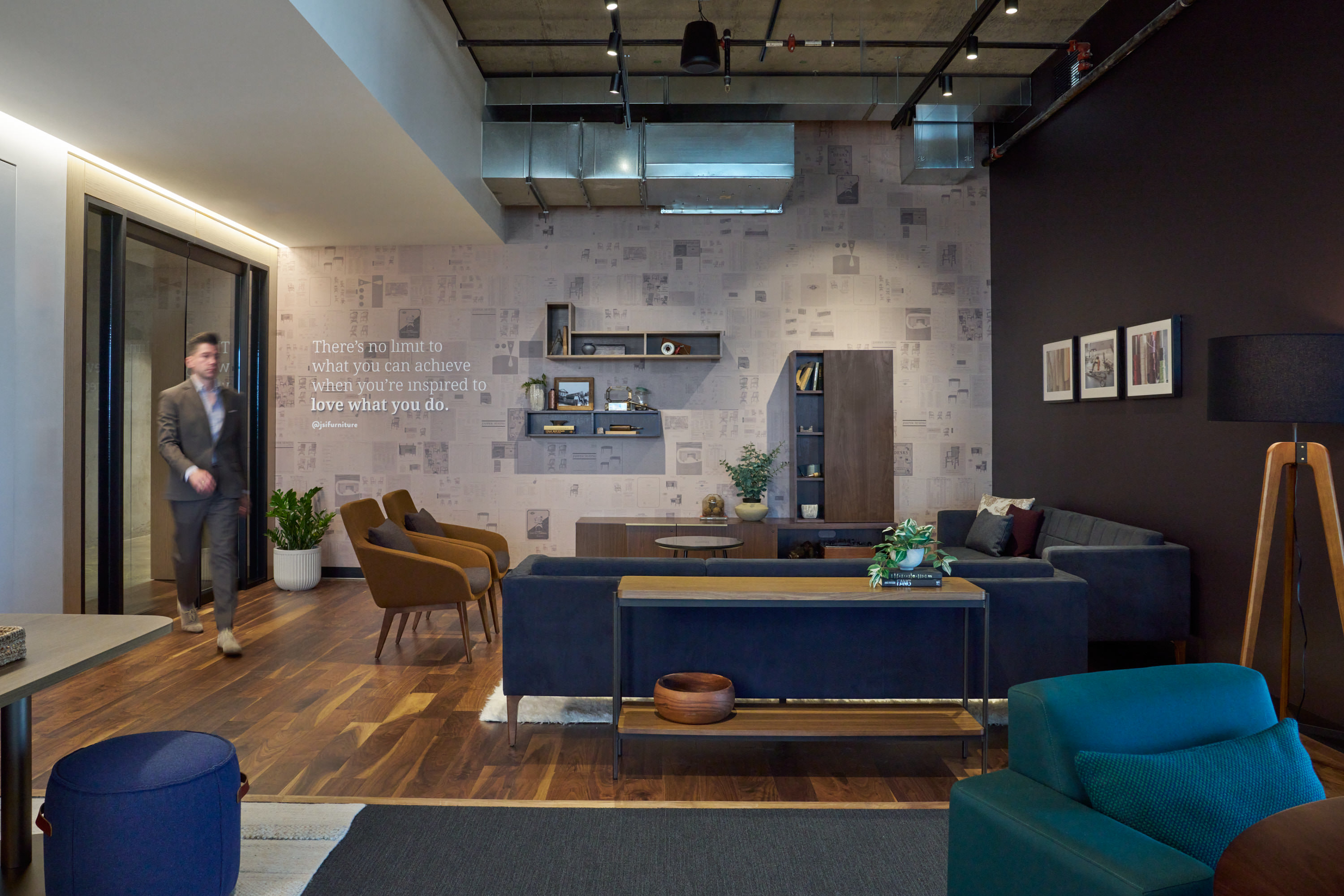 Nydree's Walnut Natural flooring ties the entire JSI Showroom together through a variety of rich tones in different patterns that bring a cohesive yet intriguing air of sophistication.