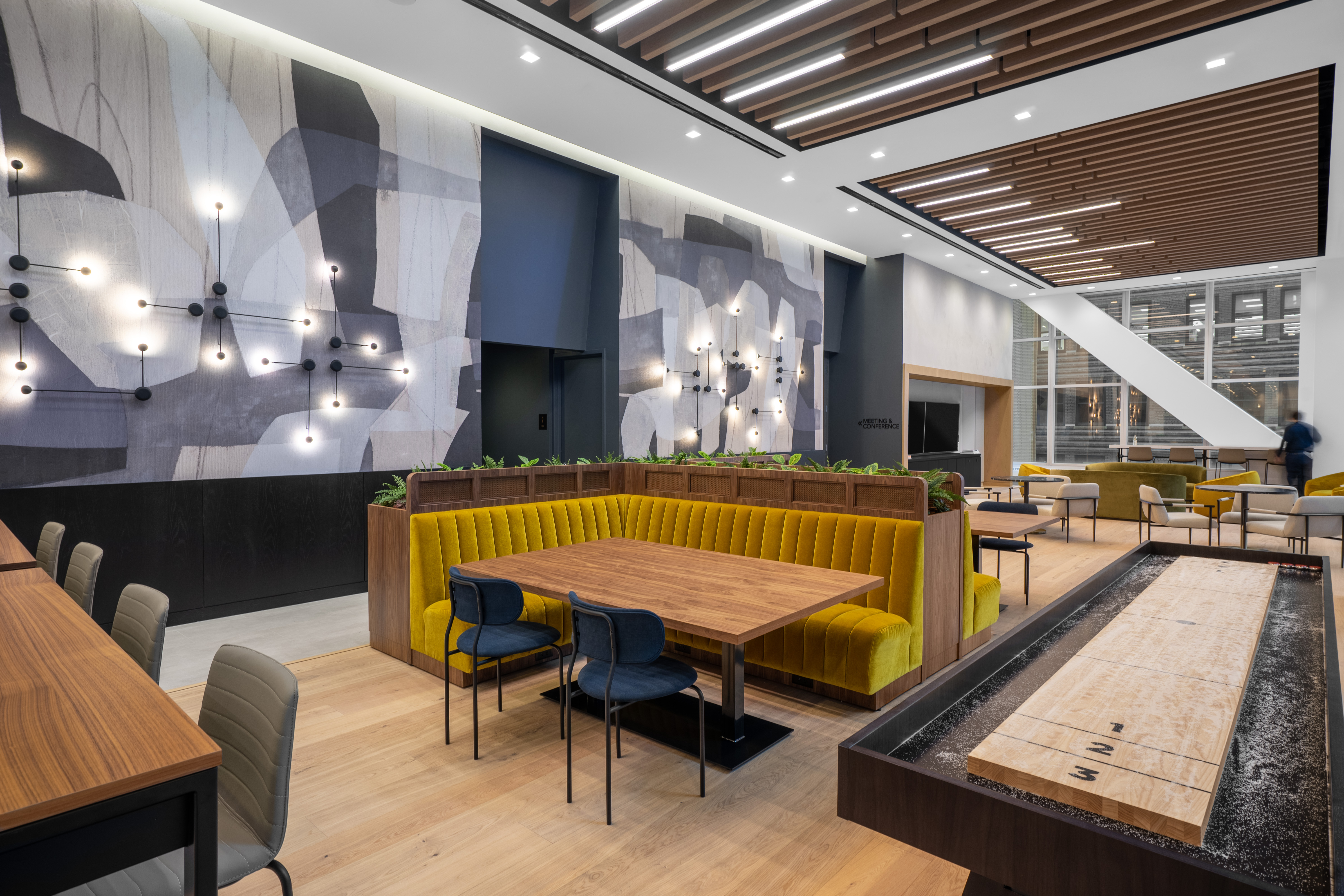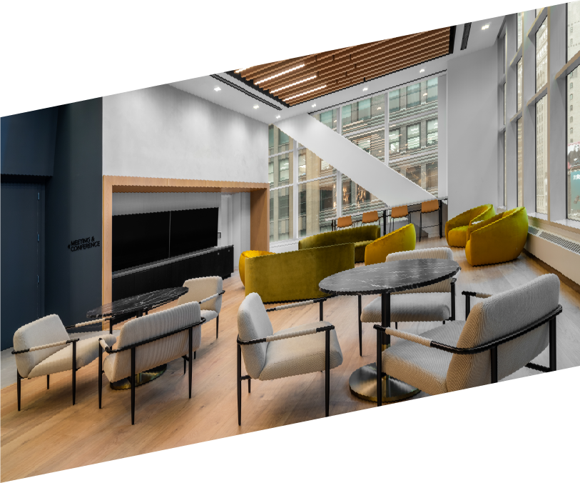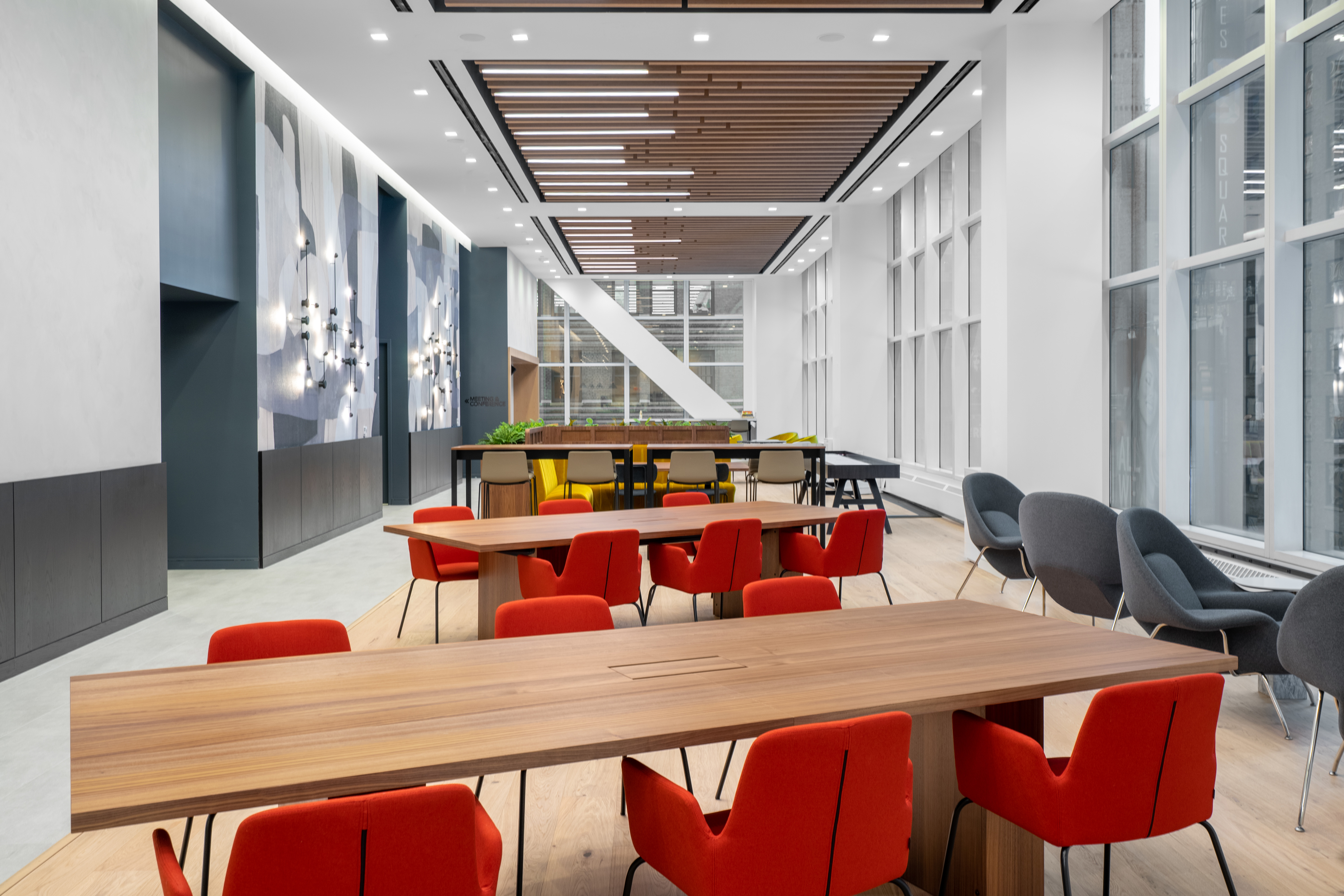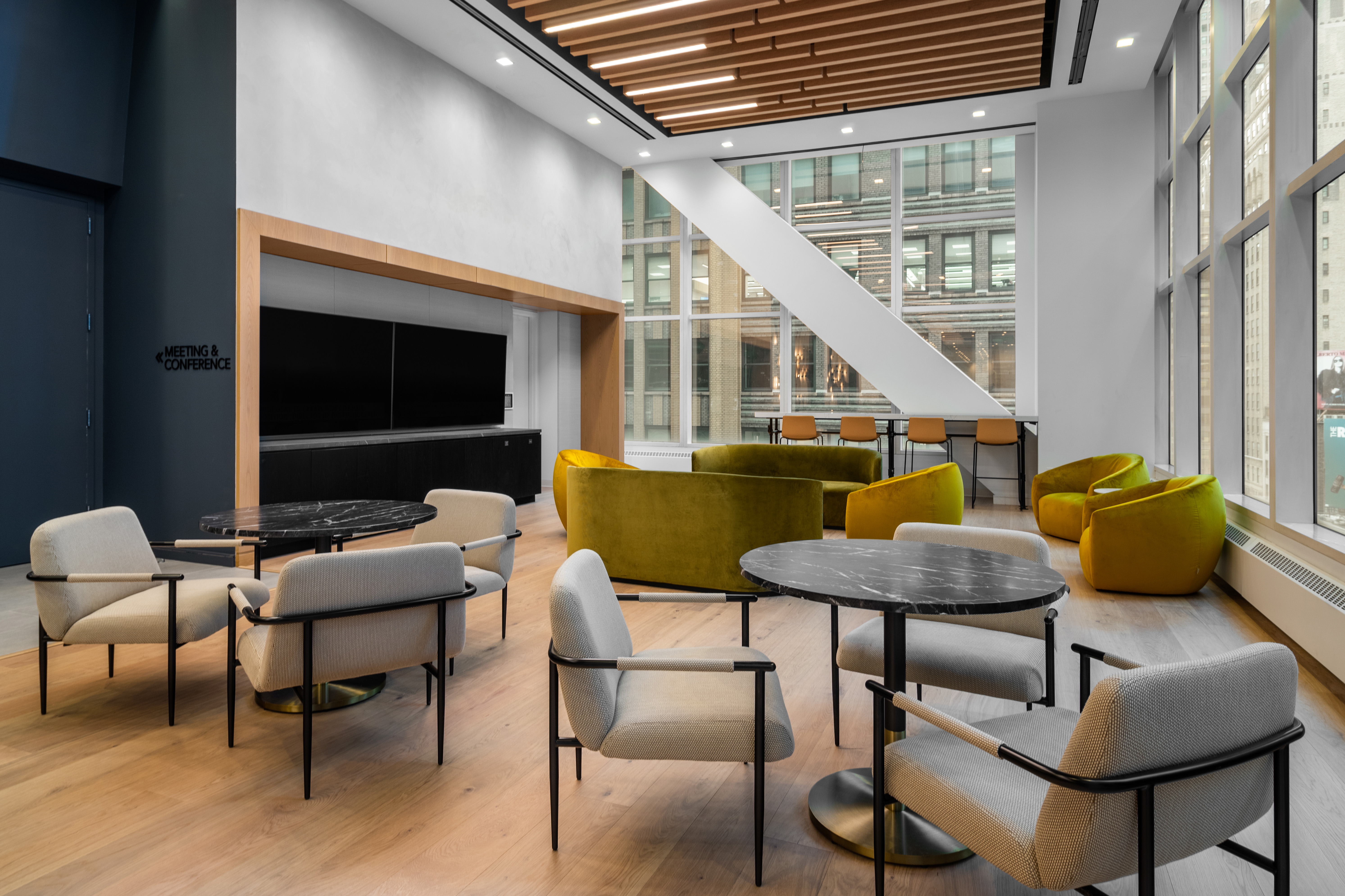 Maverick Bridgewater Oak flooring creates a warm and modern environment in this communal space — counter to its bustling Times Square locale — with natural tones that evoke tranquility.