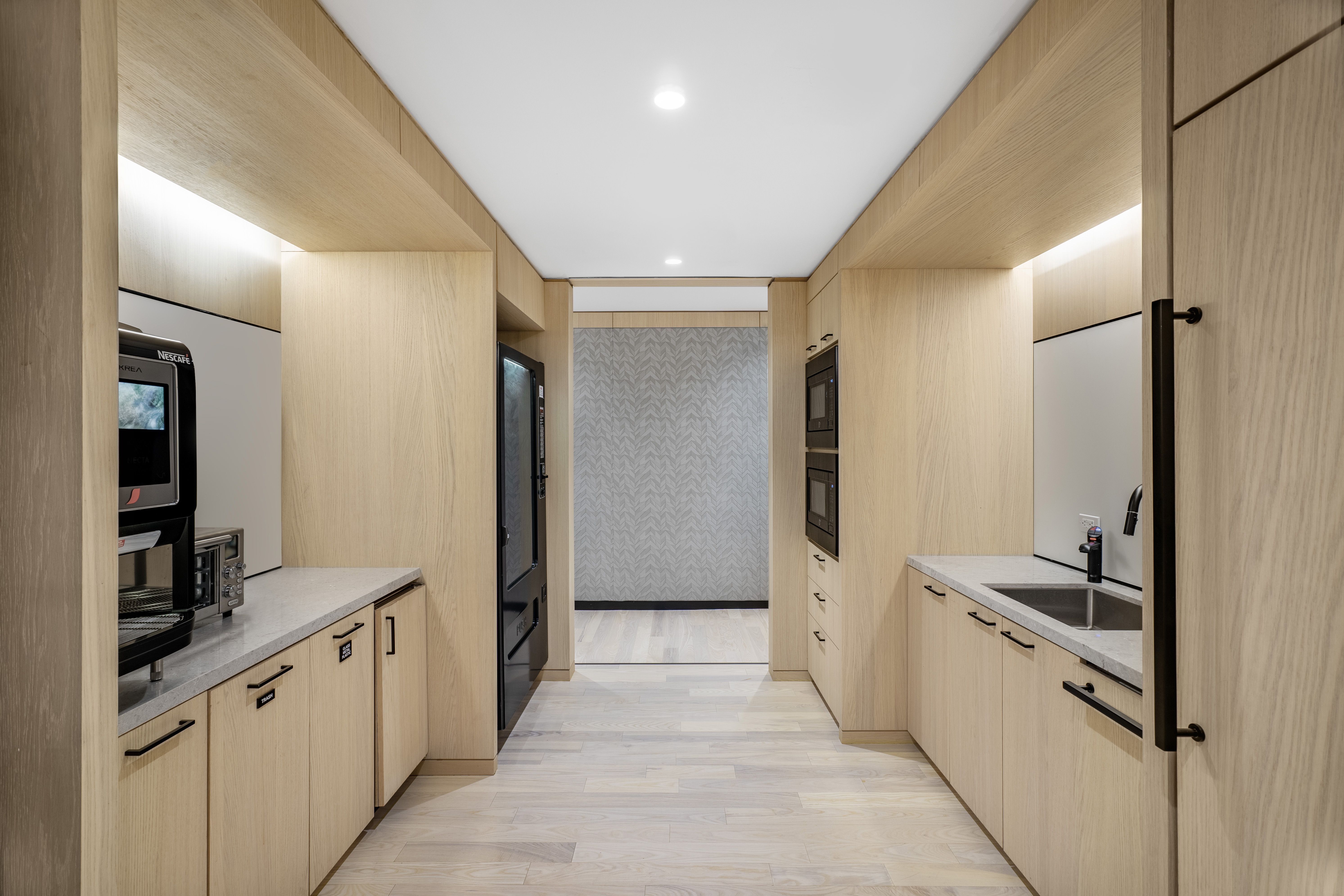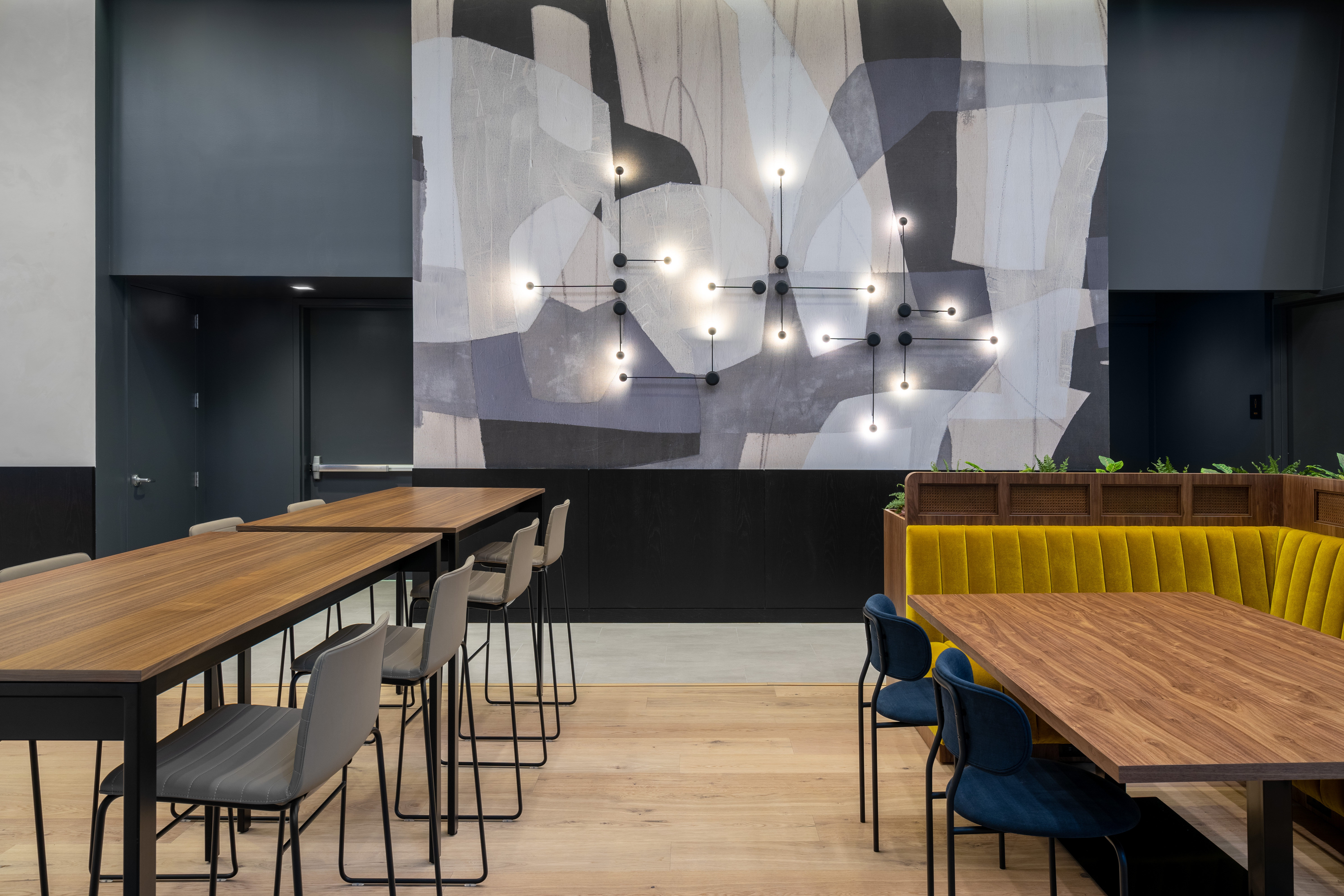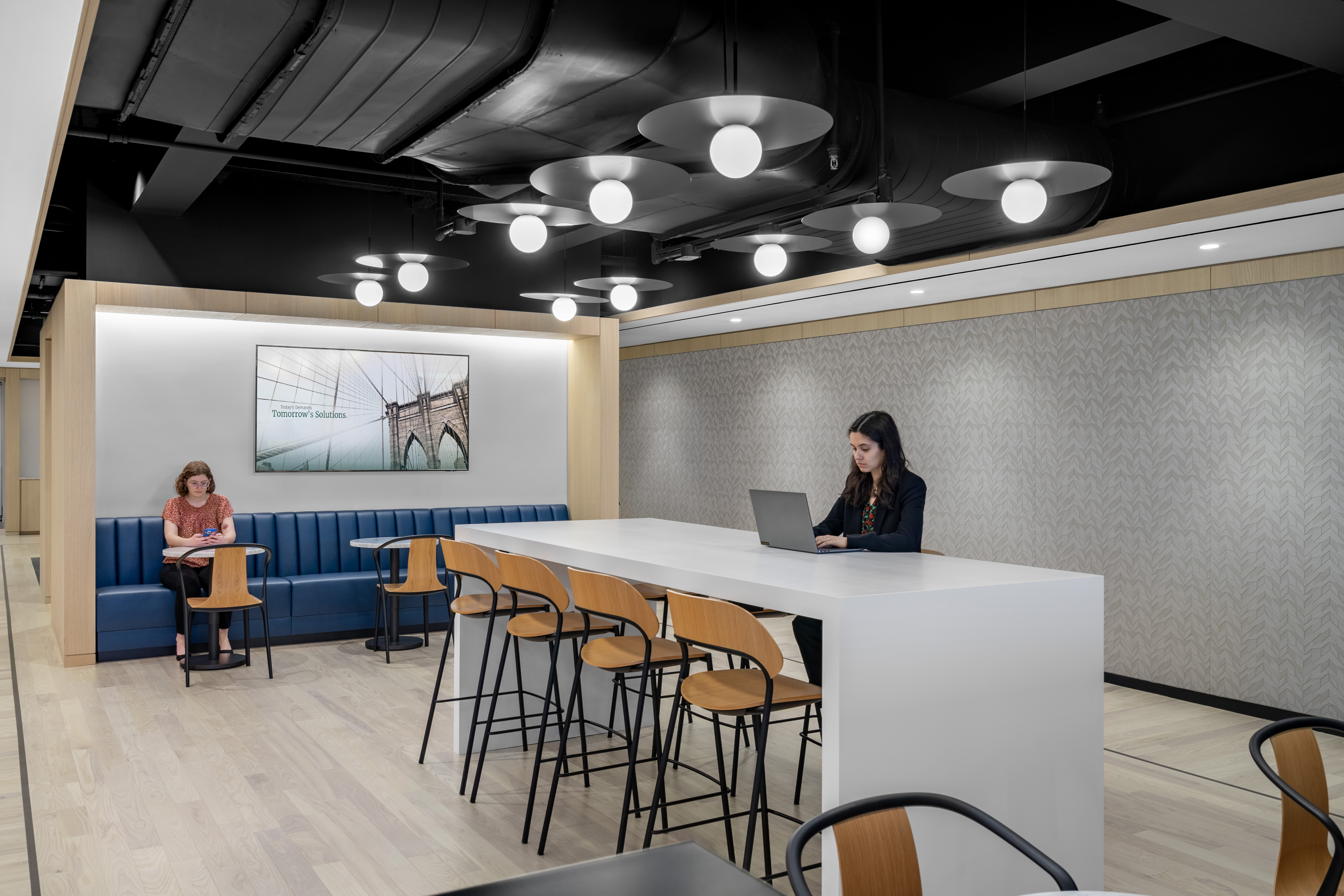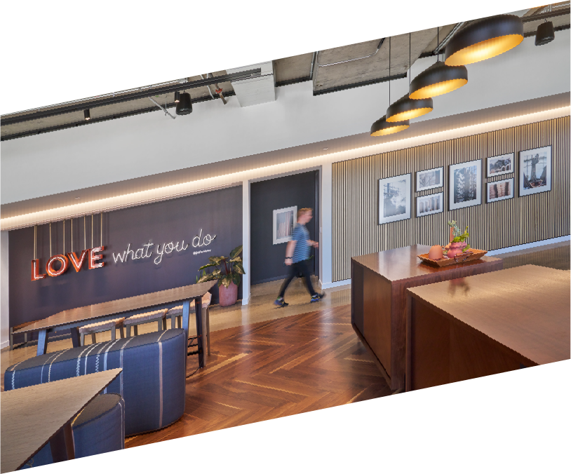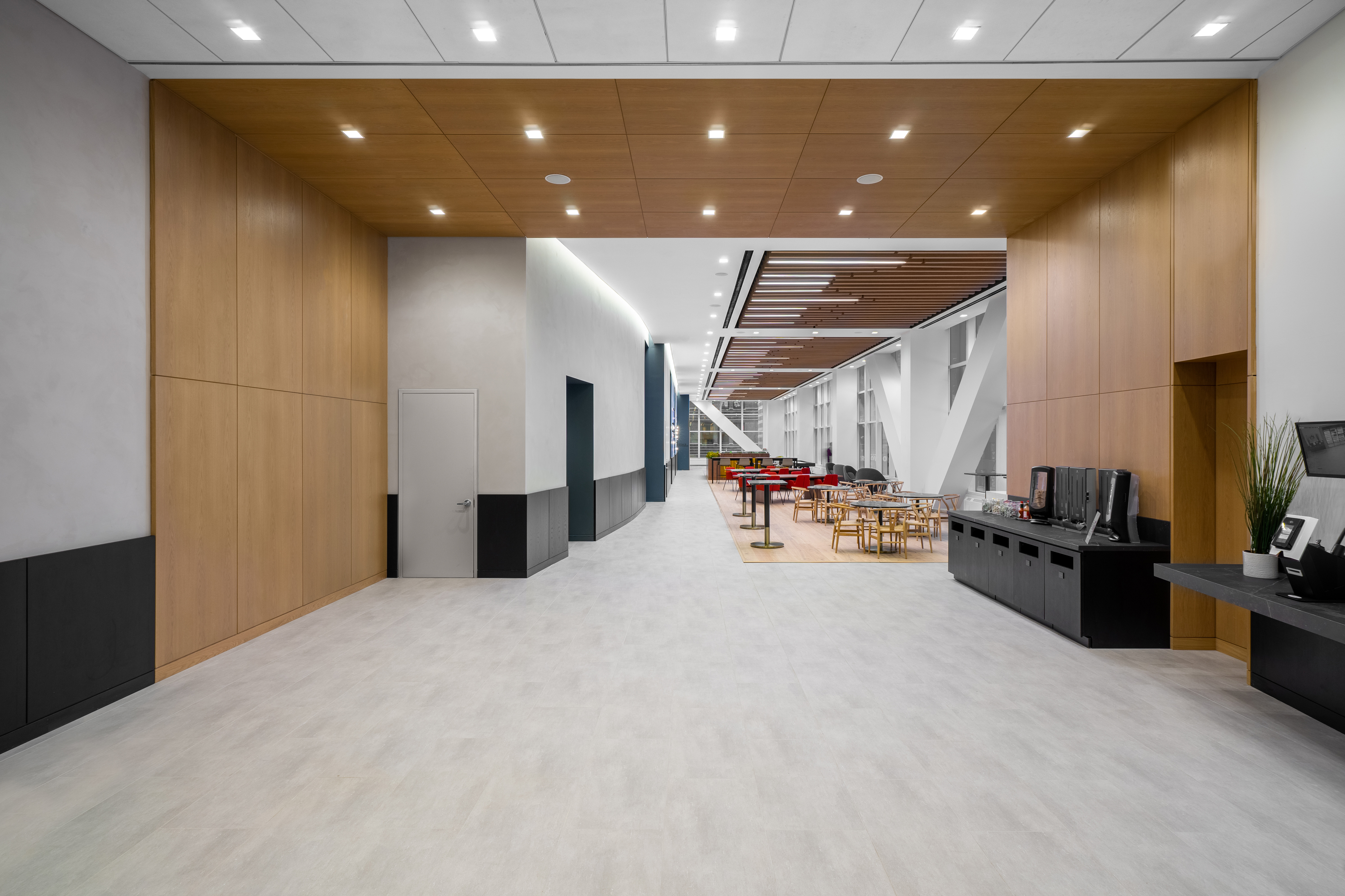 Maverick Bridgewater Oak flooring creates a warm and modern environment in this communal space — counter to its bustling Times Square locale — with natural tones that evoke tranquility.