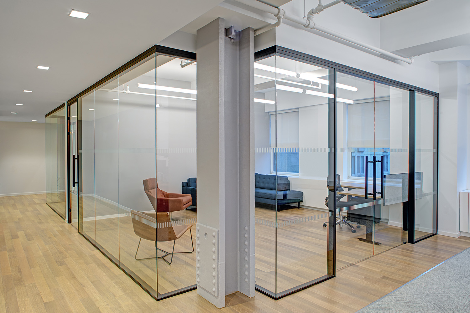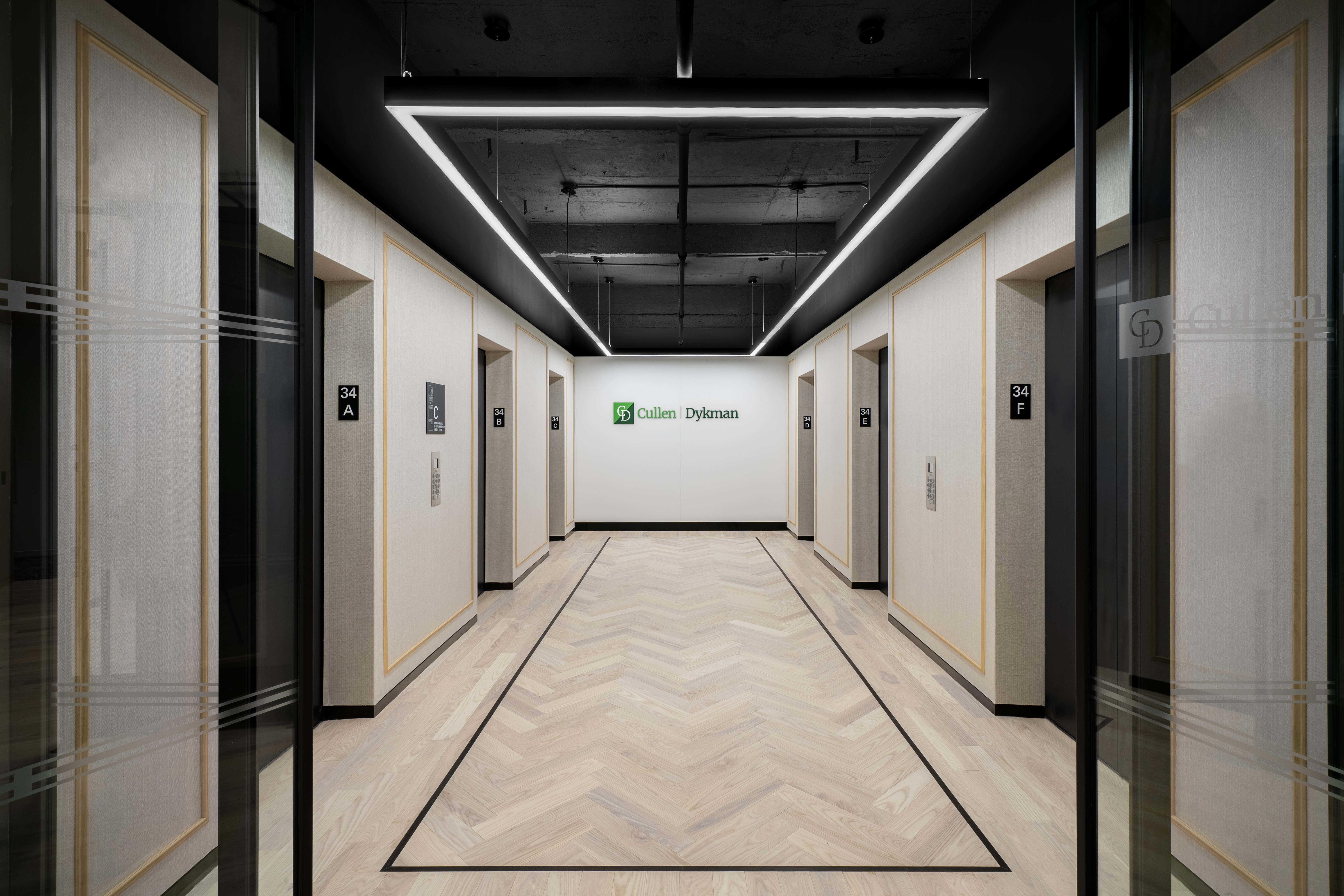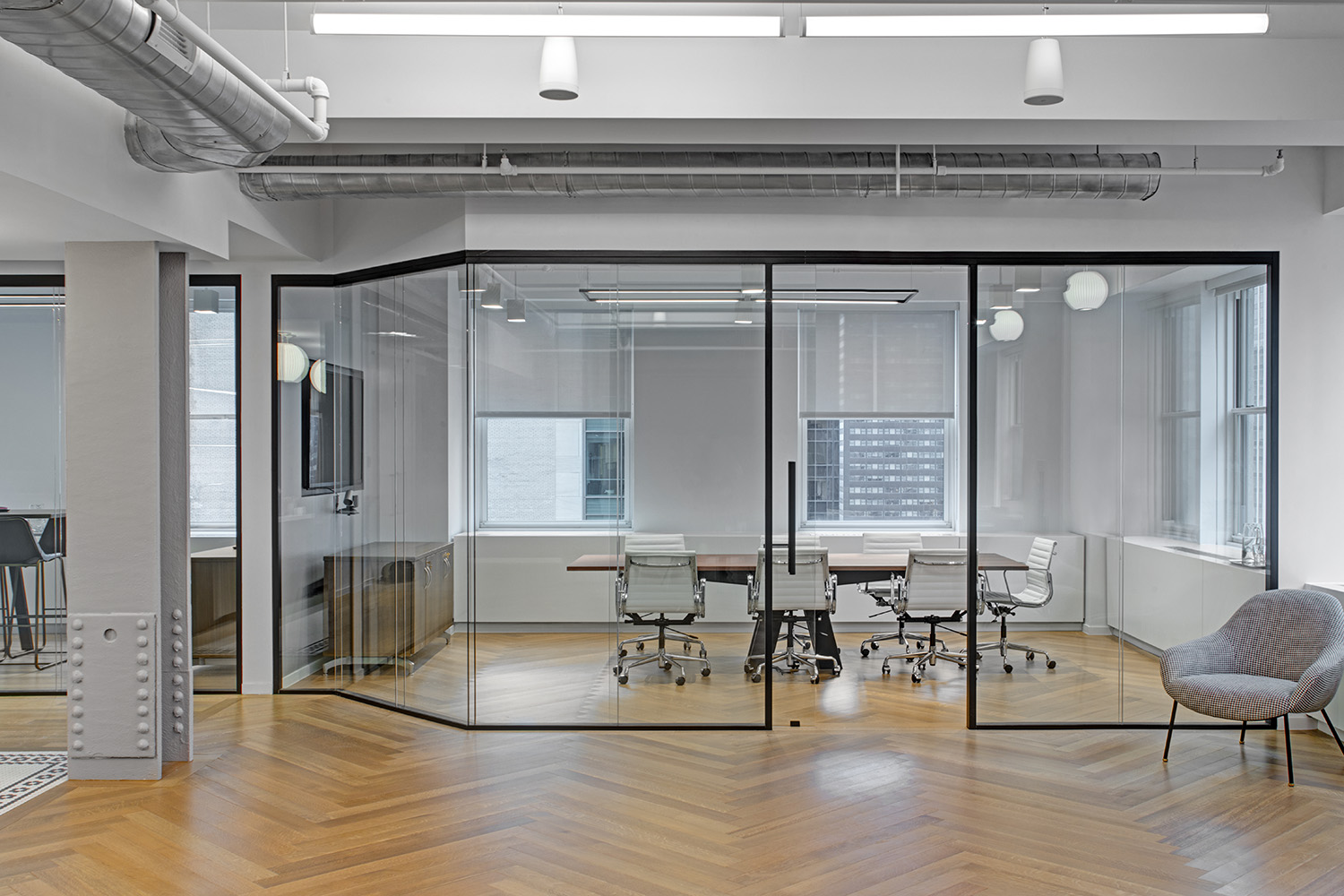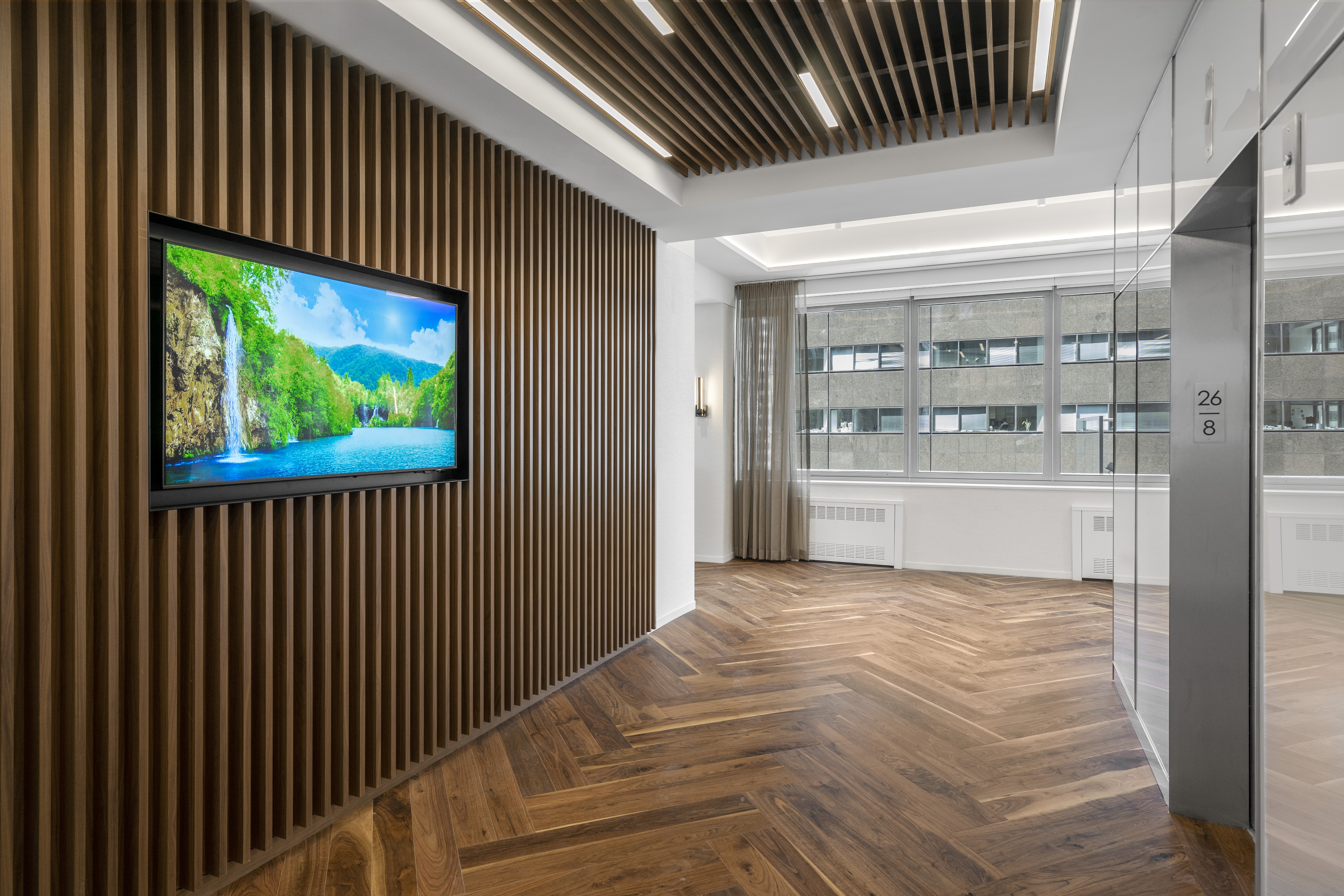 In Steinberg & Pokoik's New York office, the Walnut Natural hardwood floor weaves a tapestry of rich, earthy tones in an elegant double herringbone pattern, creating a timeless allure that anchors the contemporary space.