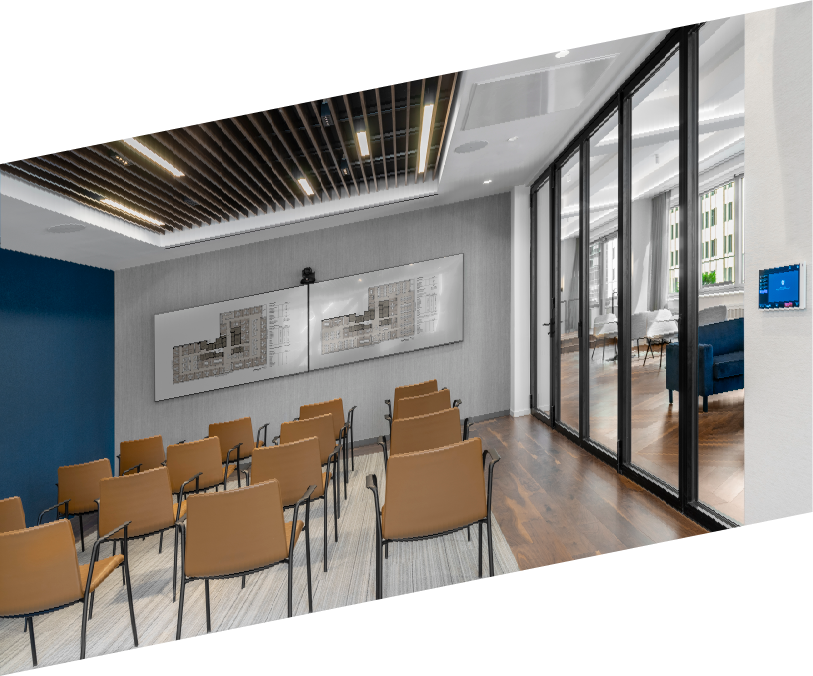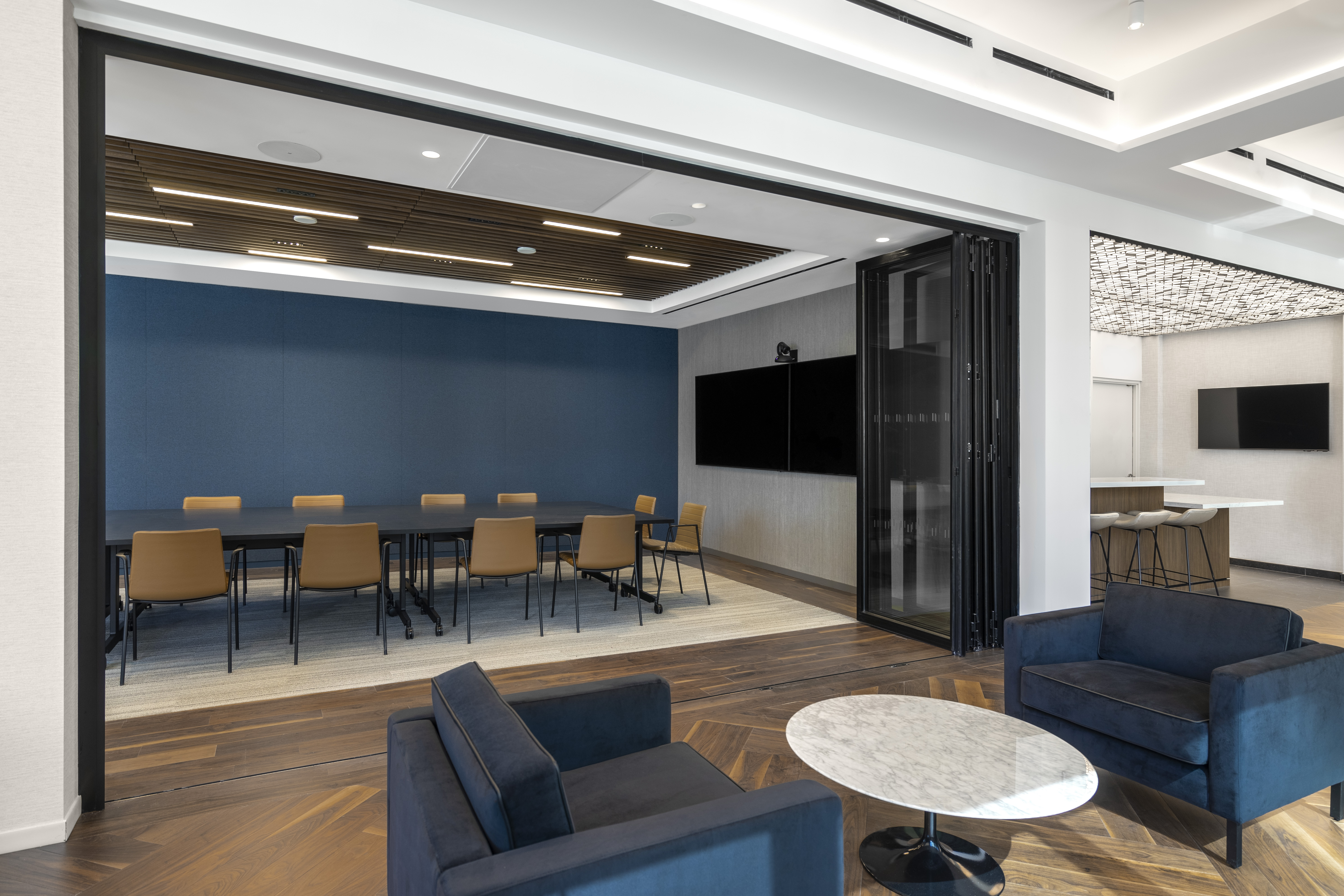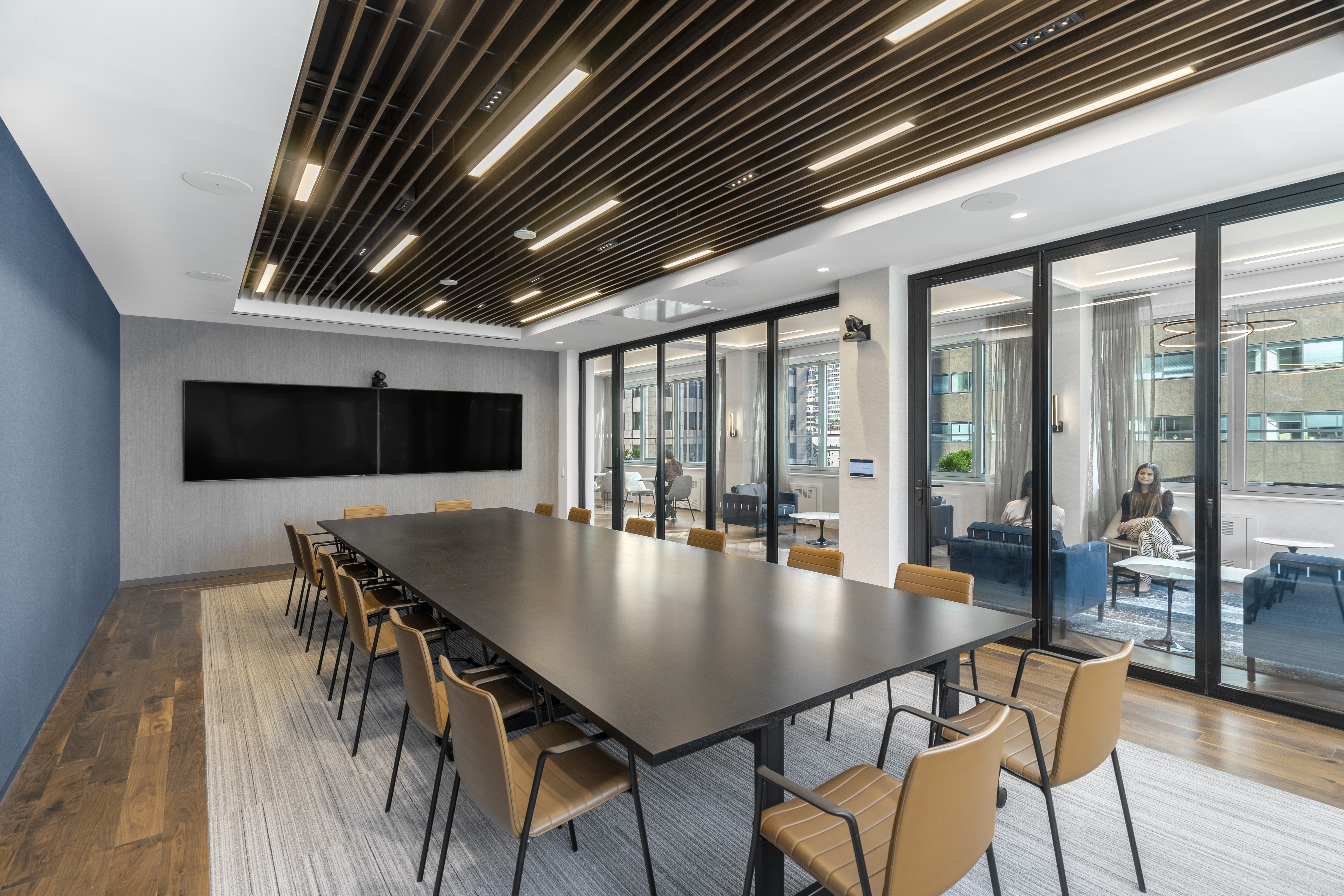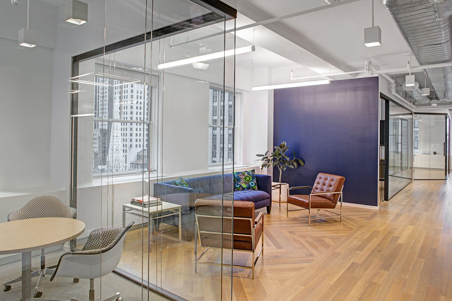 In Steinberg & Pokoik's New York office, the Walnut Natural hardwood floor weaves a tapestry of rich, earthy tones in an elegant double herringbone pattern, creating a timeless allure that anchors the contemporary space.