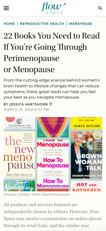 Women’s health is both historically and societally underserved, with the majority of research investment focused on the male brain and body, ignoring female biology. Flow Space offers the latest science and most resonant stories to inform and empower women to advocate for their own wellbeing.