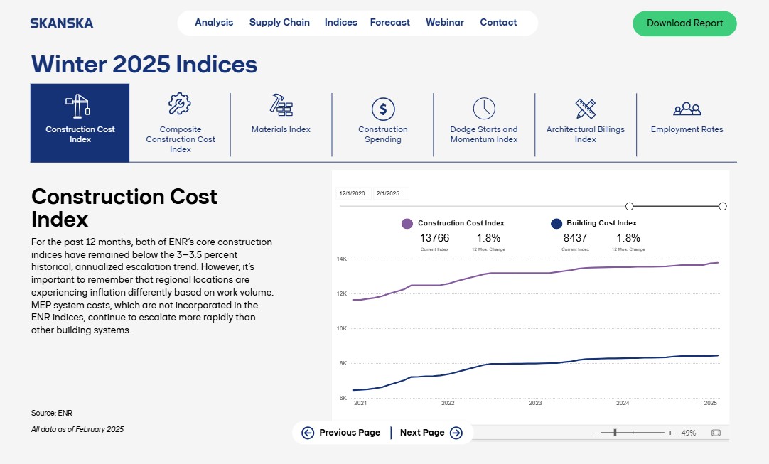 Following up our report, Skanska preconstruction and operations experts discuss the report’s findings, from construction pricing to labor trends, which are based on data compiled by sources like the U.S. Bureau of Labor Statistics and Engineering News Record. Guest speakers and subject matter experts from across the AEC industry join the webinar to share their experiences, best practices and lessons learned.