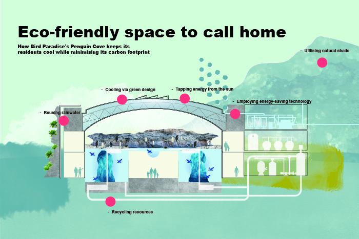 飞禽公园其他高地势的遮阴覆盖约六成企鹅湾建筑,维持企鹅所需温度(9-11°C)的冷气需求因而减少。