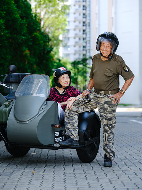 同为91岁的夫妻陆裕德与唐丽真,在四年前使用“重新探索新加坡”消费券,体验了电单车与边车骑行的快乐后,陆裕德几天后就不仅更新了驾照还买了电单车,继续载着太太兜风。