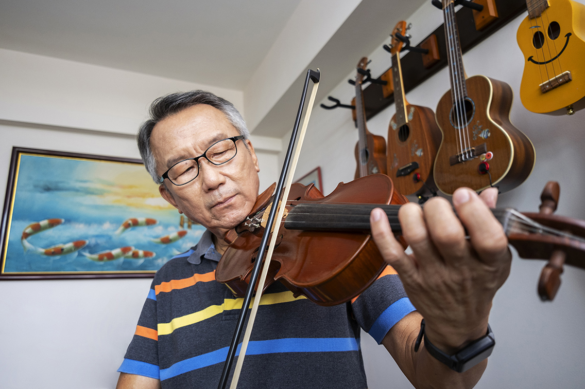 会弹奏钢琴、小提琴、吉他、尤克里里口琴和古筝的温昔历(68岁),无师自通自学成才,不仅在活跃乐龄站里表演,也在社区活动上献艺。