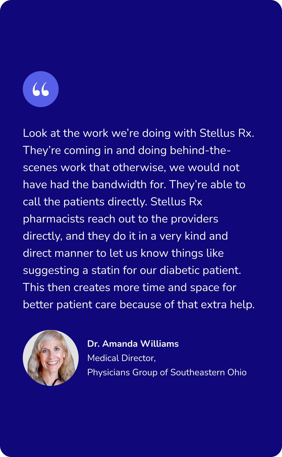 Look at the work we’re doing with Stellus Rx. They’re coming in and doing behind-the-scenes work that otherwise, we would not have had the bandwidth for. They’re able to call the patients directly. Stellus Rx pharmacists reach out to the providers directly, and they do it in a very kind and direct manner to let us know things like suggesting a statin for our diabetic patient. This then creates more time and space for better patient care because of that extra help.
