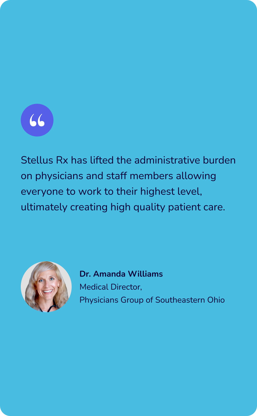 Stellus Rx has lifted the administrative burden on physicians and staff members allowing everyone to work to their highest level, ultimately creating high quality patient care.