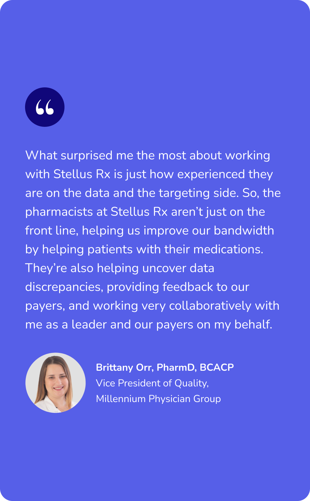 What surprised me the most about working with Stellus Rx is just how experienced they are on the data and the targeting side. So, the pharmacists at Stellus Rx aren’t just on the front line, helping us improve our bandwidth by helping patients with their medications. They’re also helping uncover data discrepancies, providing feedback to our payers, and working very collaboratively with me as a leader and our payers on my behalf.
