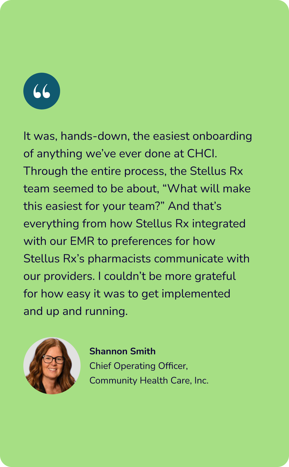 It was, hands-down, the easiest onboarding of anything we’ve ever done at CHCI. Through the entire process, the Stellus Rx team seemed to be about, “What will make this easiest for your team?” And that’s everything from how Stellus Rx integrated with our EMR to preferences for how Stellus Rx’s pharmacists communicate with our providers. I couldn’t be more grateful for how easy it was to get implemented and up and running.