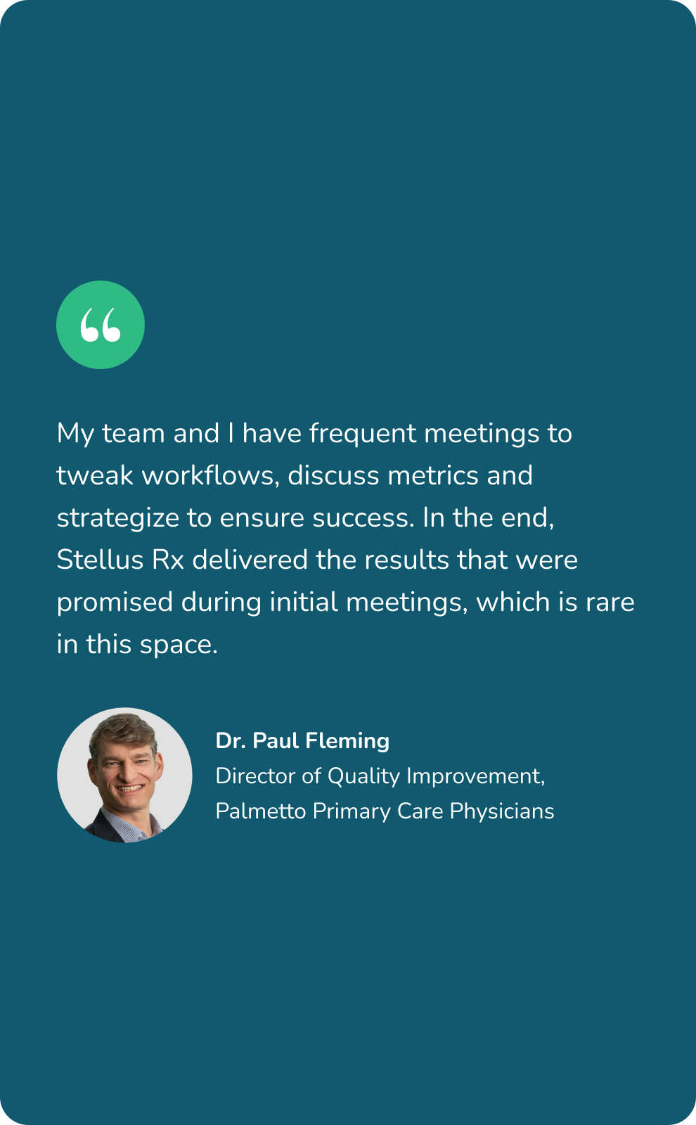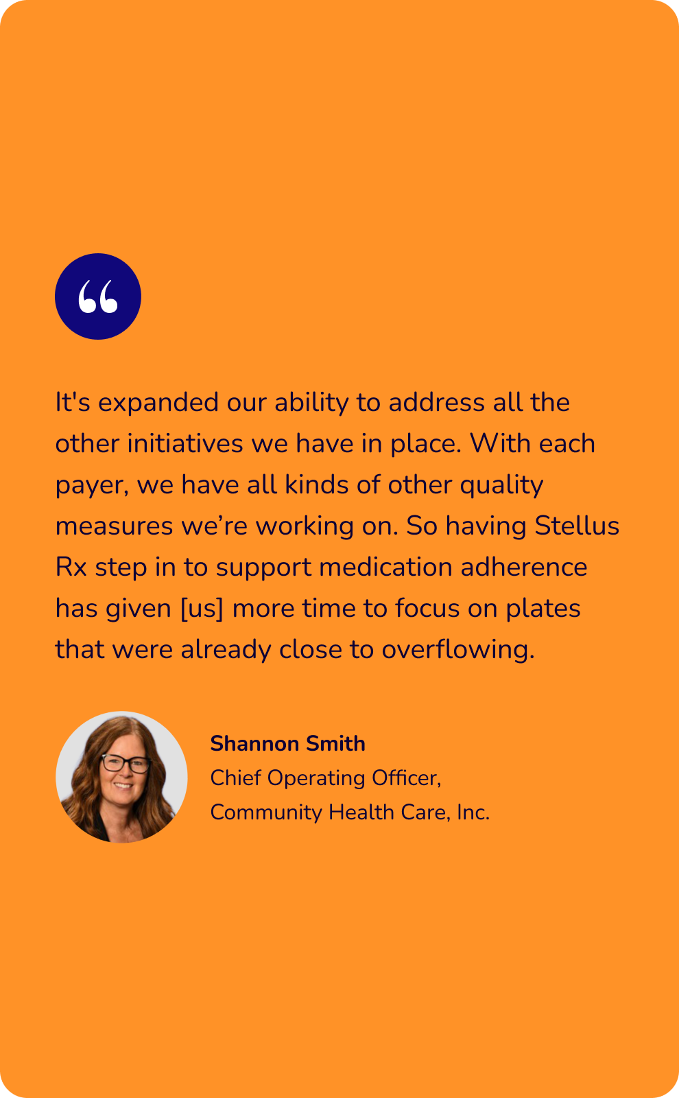 It's expanded our ability to address all the other initiatives we have in place. With each payer, we have all kinds of other quality measures we’re working on. So having Stellus Rx step in to support medication adherence has given [us] more time to focus on plates that were already close to overflowing.