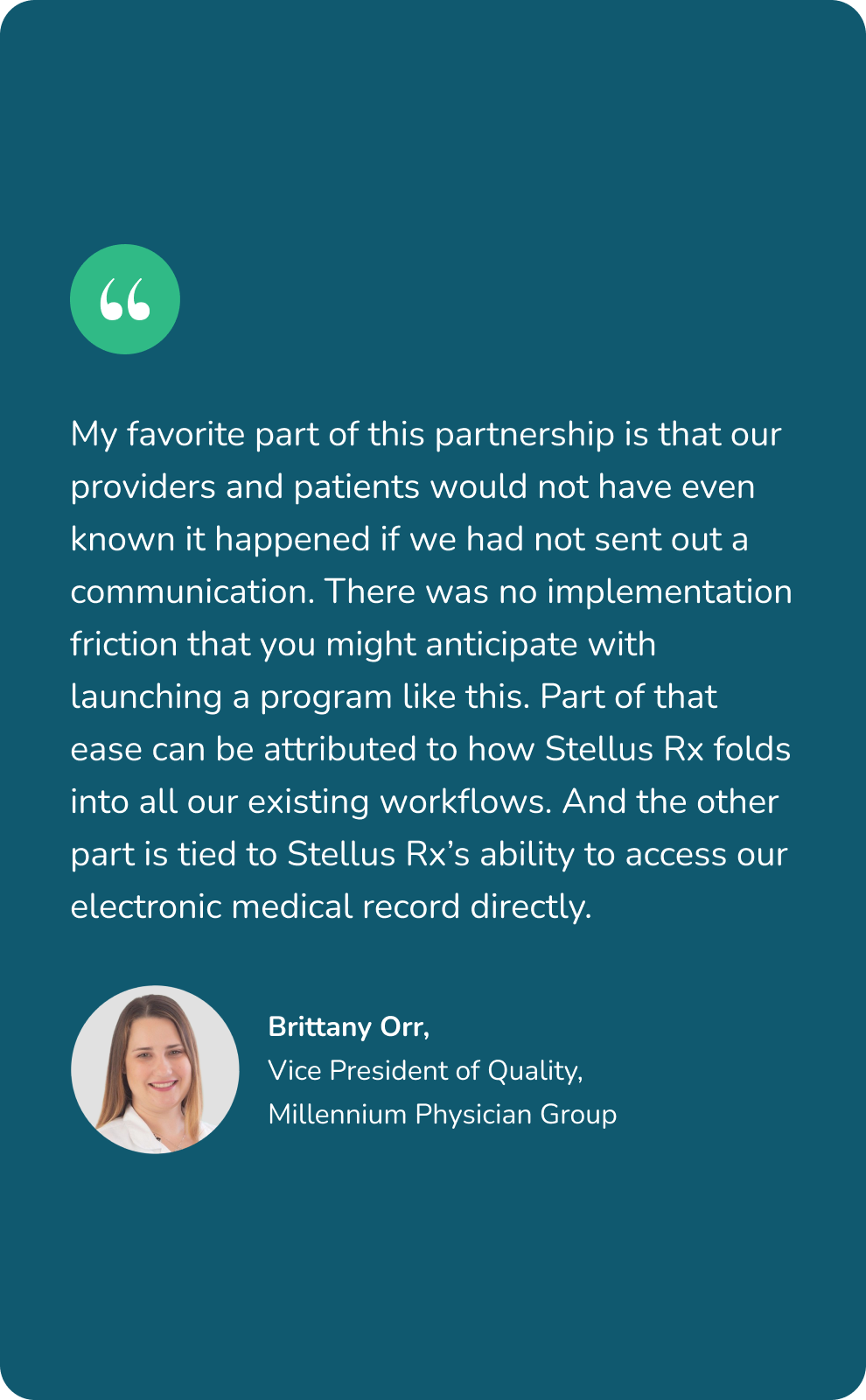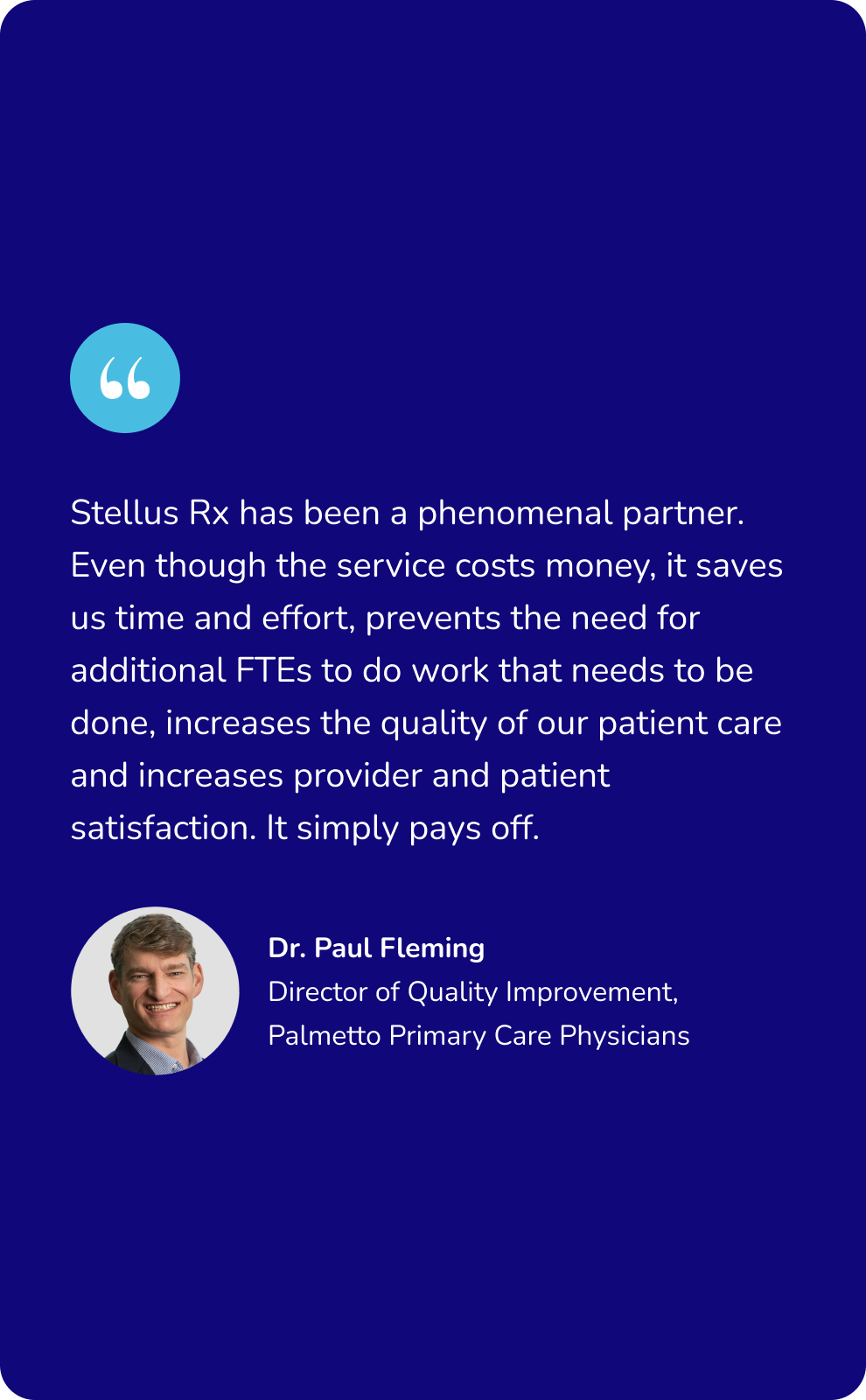 Stellus Rx has been a phenomenal partner. Even though the service costs money, it saves us time and effort, prevents the need for additional FTEs to do work that needs to be done, increases the quality of our patient care and increases provider and patient satisfaction. It simply pays off.