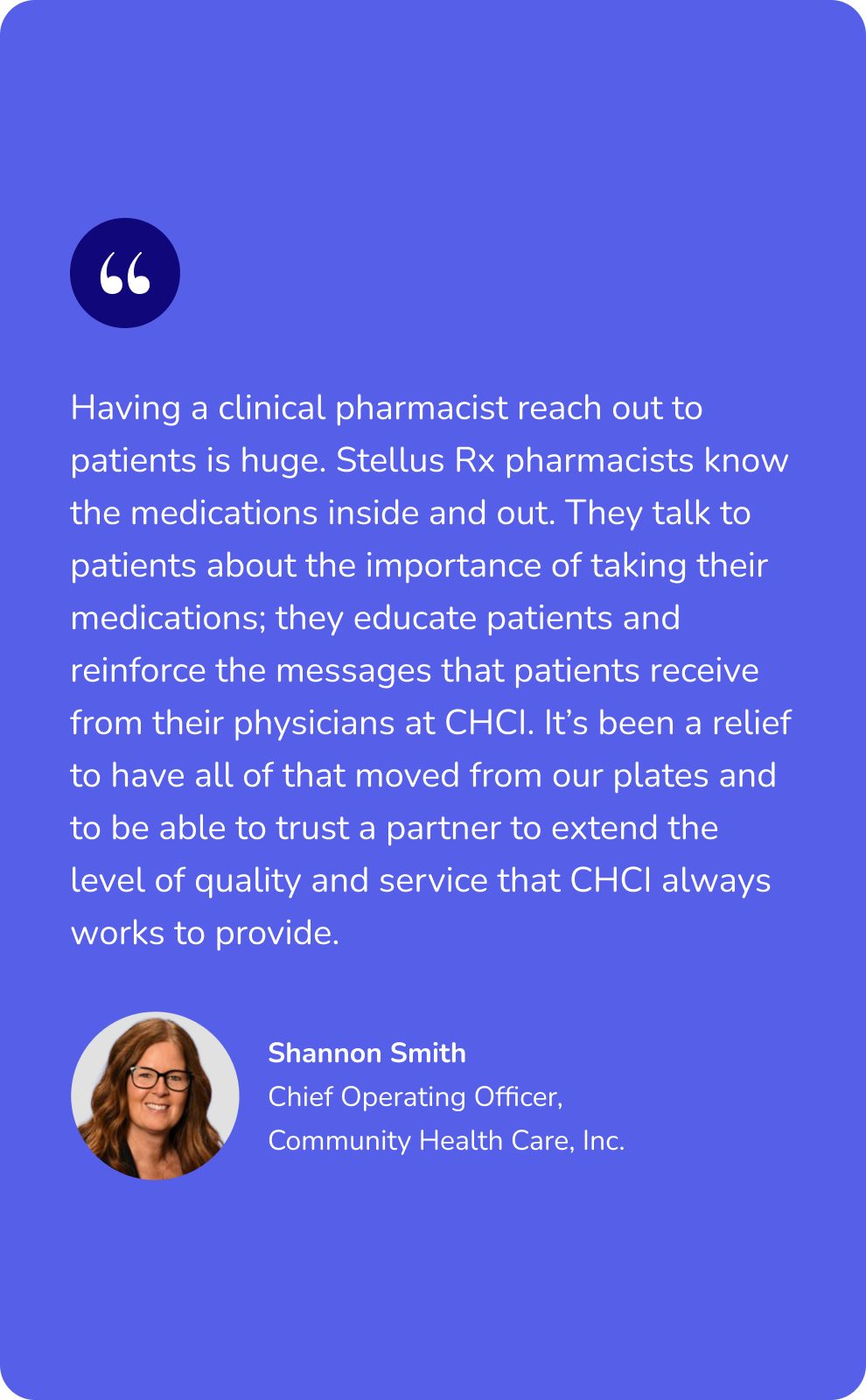 Having a clinical pharmacist reach out to patients is huge. Stellus Rx pharmacists know the medications inside and out. They talk to patients about the importance of taking their medications; they educate patients and reinforce the messages that patients receive from their physicians at CHCI. It’s been a relief to have all of that moved from our plates and to be able to trust a partner to extend the level of quality and service that CHCI always works to provide.