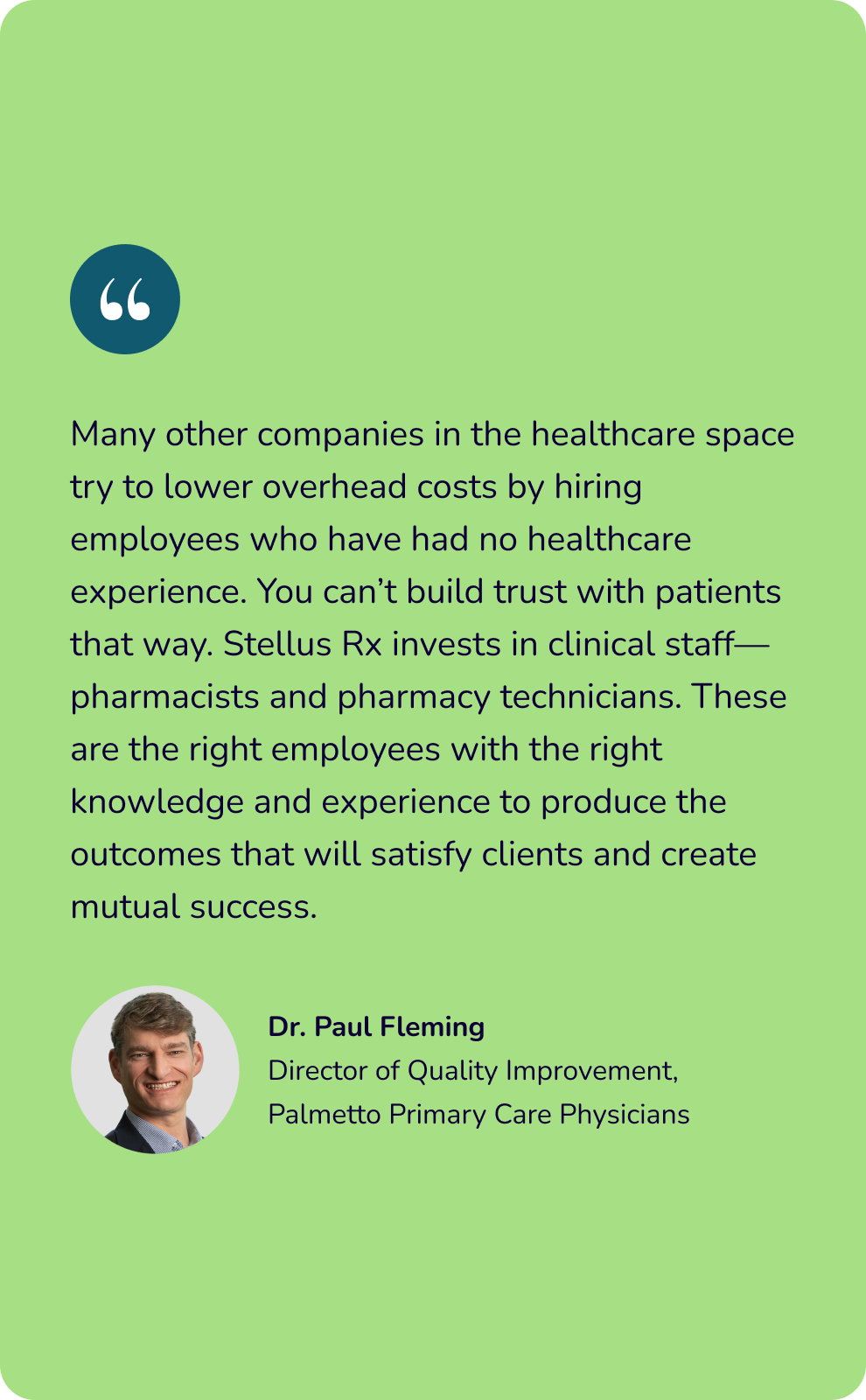 Many other companies in the healthcare space try to lower overhead costs by hiring employees who have had no healthcare experience. You can’t build trust with patients that way. Stellus Rx invests in clinical staff—pharmacists and pharmacy technicians. These are the right employees with the right knowledge and experience to produce the outcomes that will satisfy clients and create mutual success.
