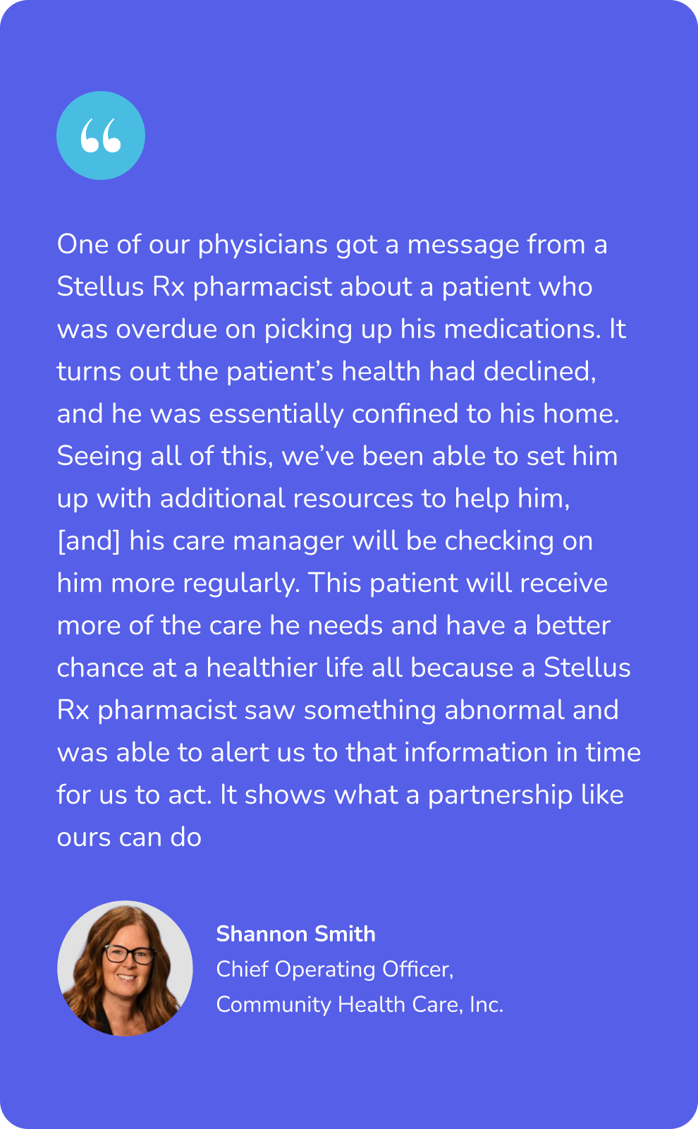 One of our physicians got a message from a Stellus Rx pharmacist about a patient who was overdue on picking up his medications. It turns out the patient’s health had declined, and he was essentially confined to his home. Seeing all of this, we’ve been able to set him up with additional resources to help him, [and] his care manager will be checking on him more regularly. This patient will receive more of the care he needs and have a better chance at a healthier life all because a Stellus Rx pharmacist saw something abnormal and was able to alert us to that information in time for us to act. It shows what a partnership like ours can do.